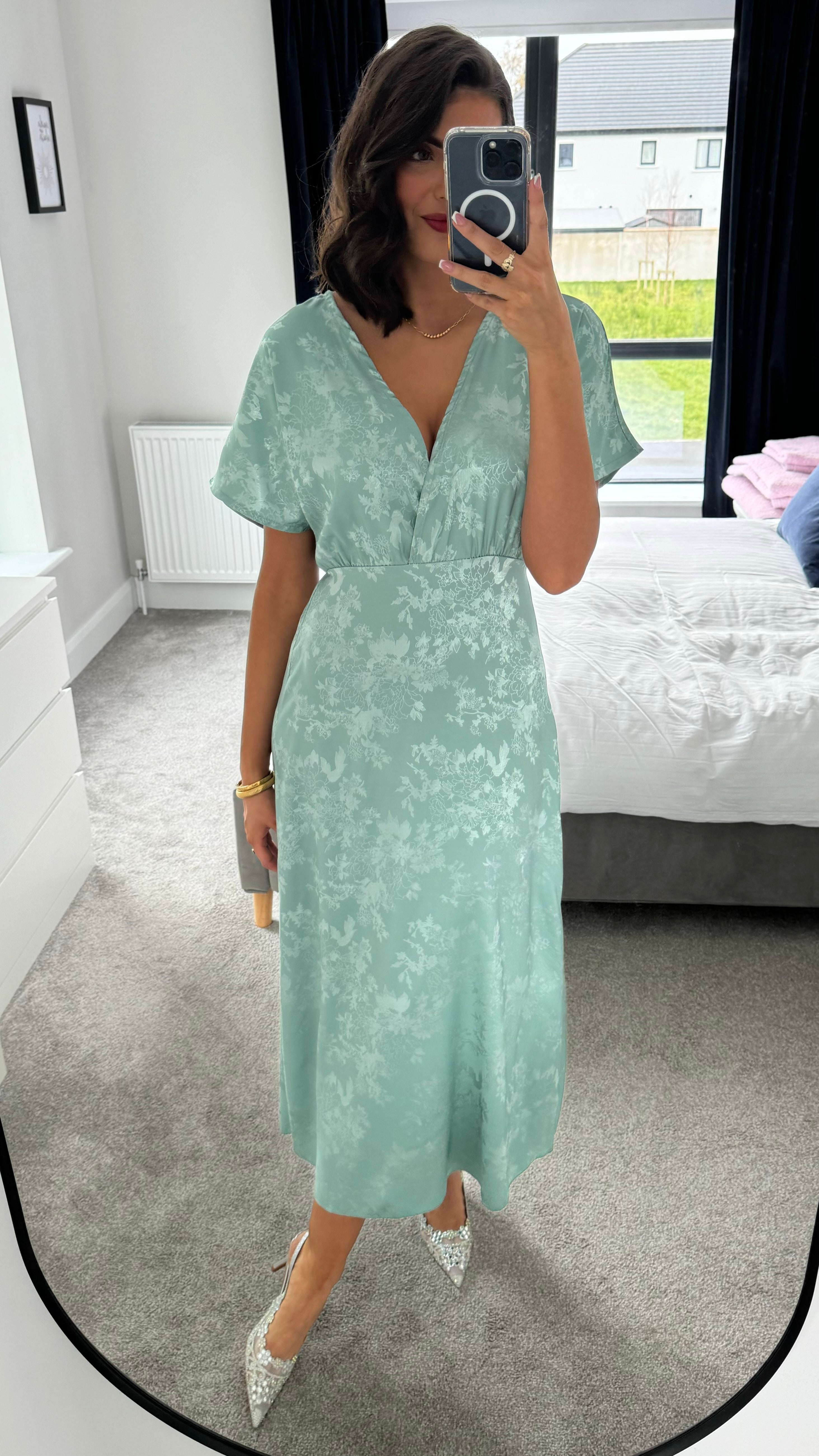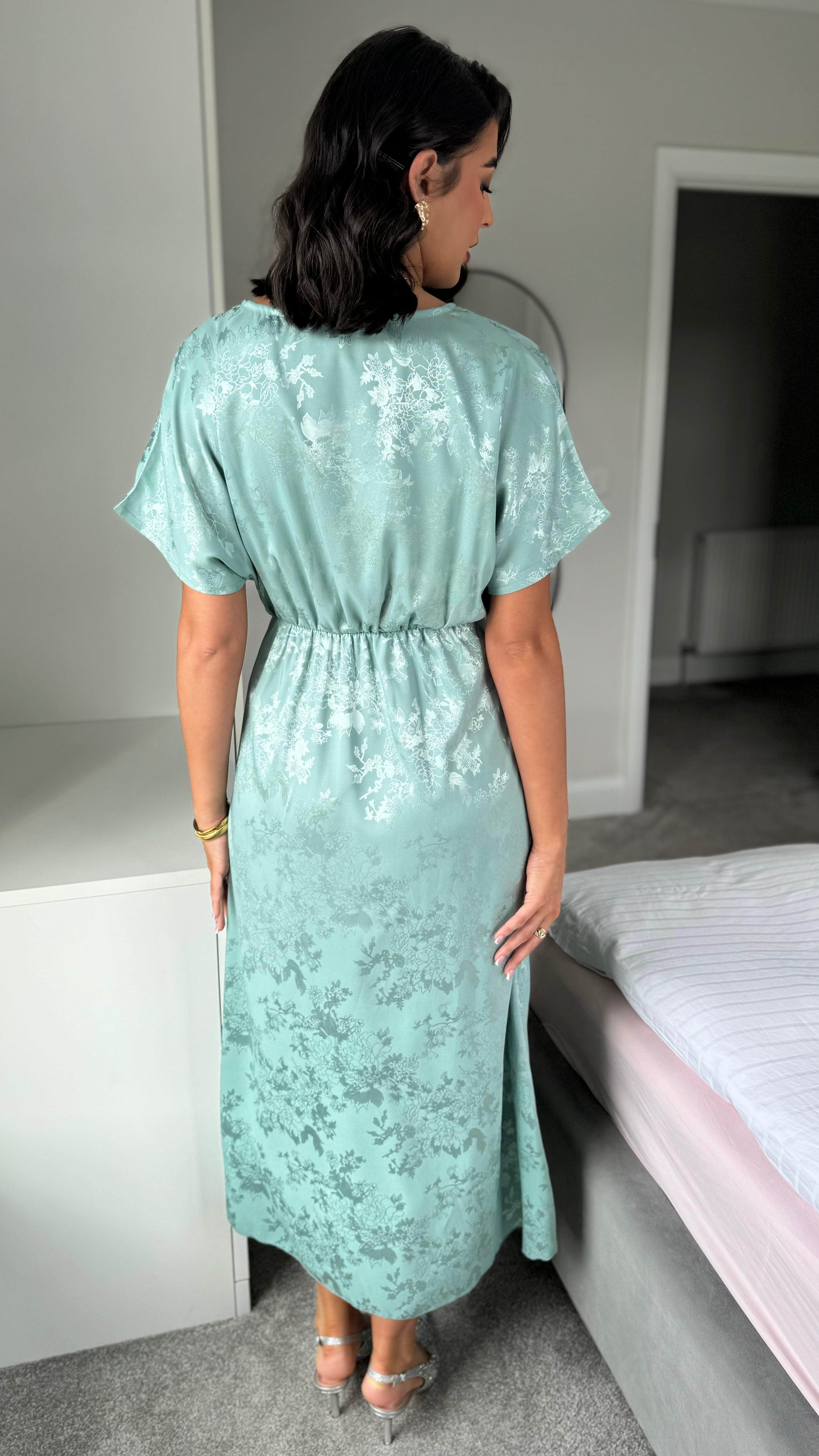 Feel like royalty in the Inez Light Green Printed Satin Finish Midi Dress! This dress features a stunning v-neckline and wide, short sleeves for a comfortable yet stylish look. The printed satin finish adds a luxurious touch to any occasion. 👑