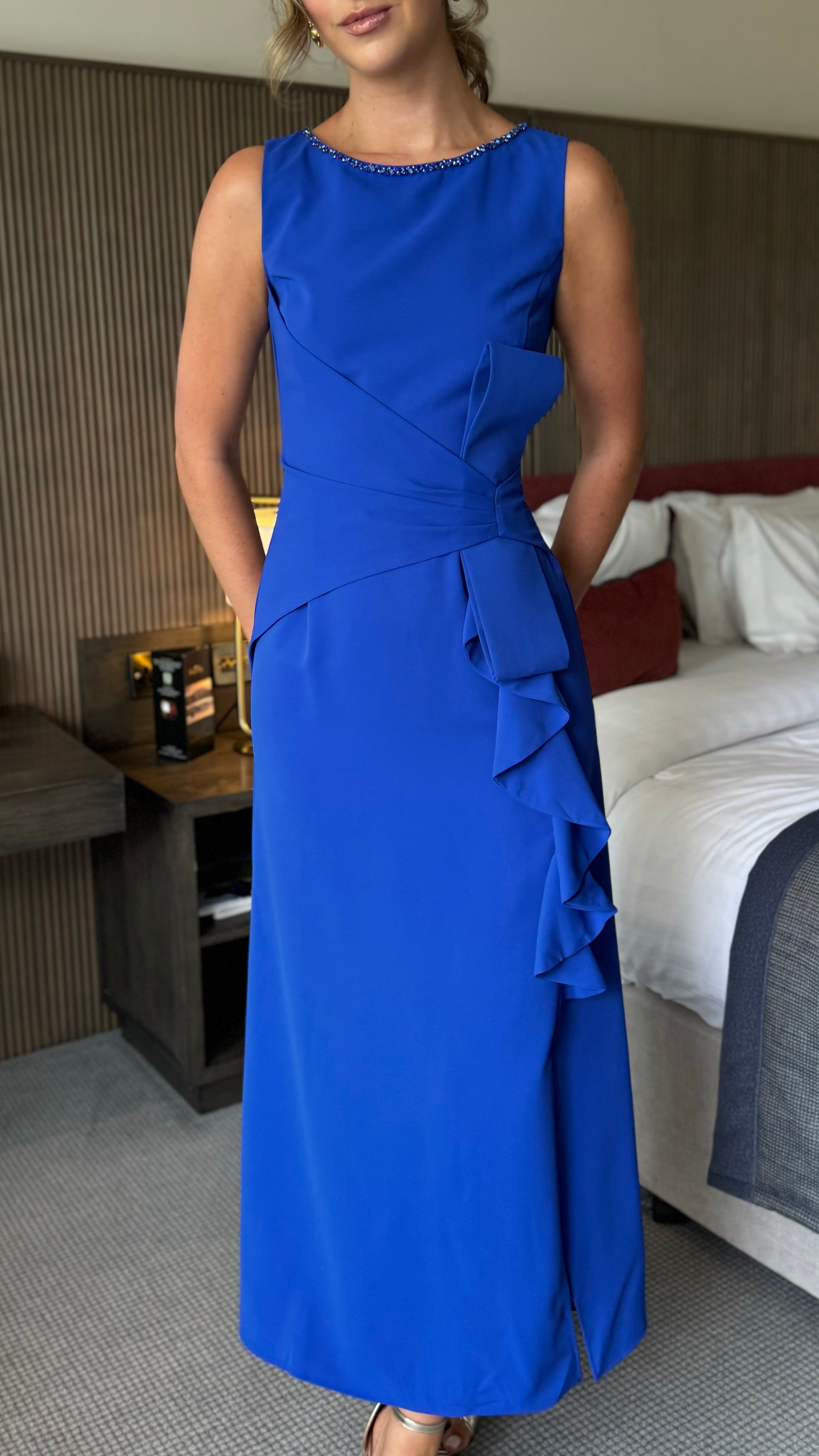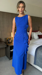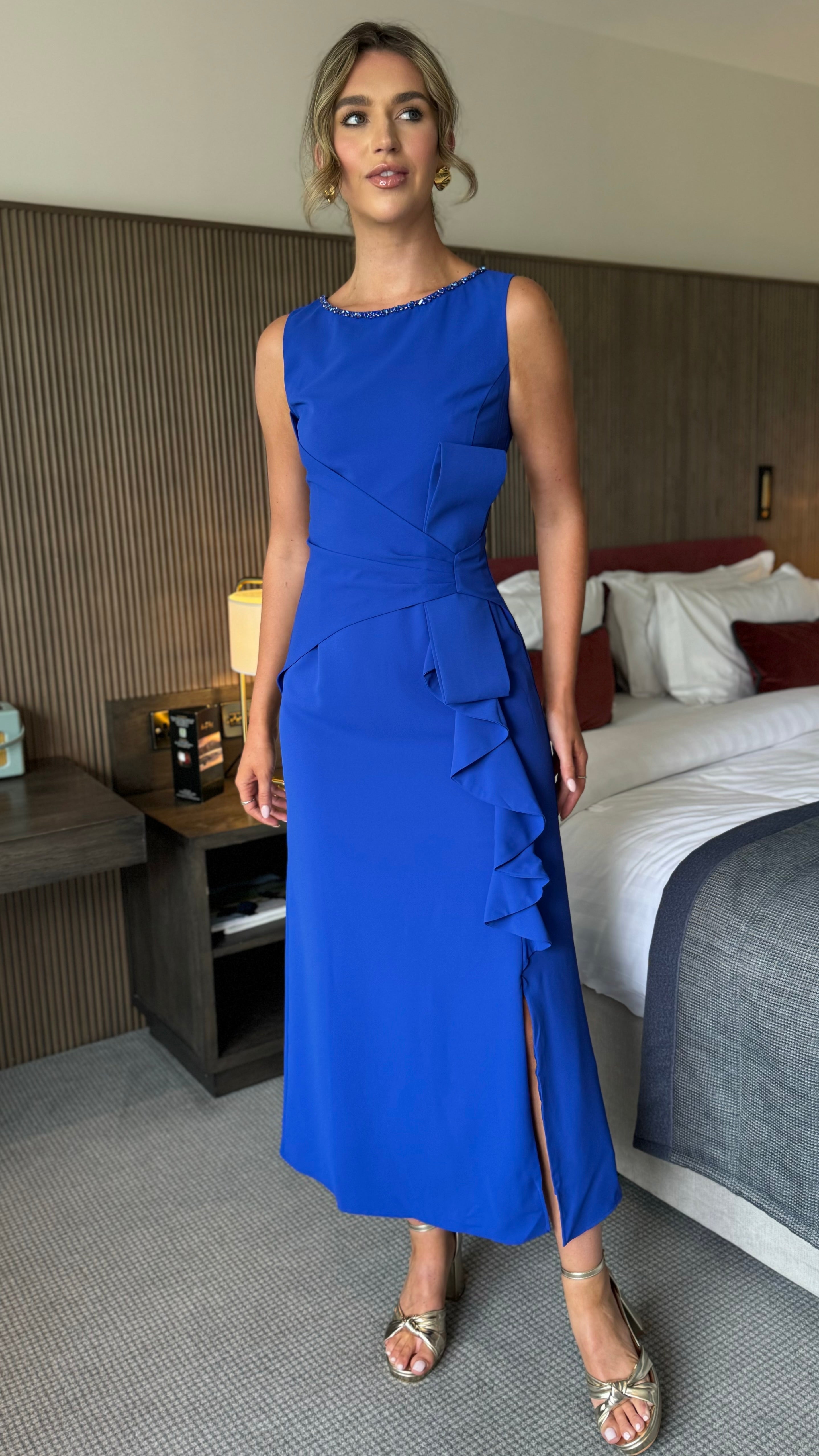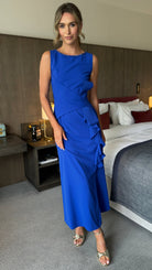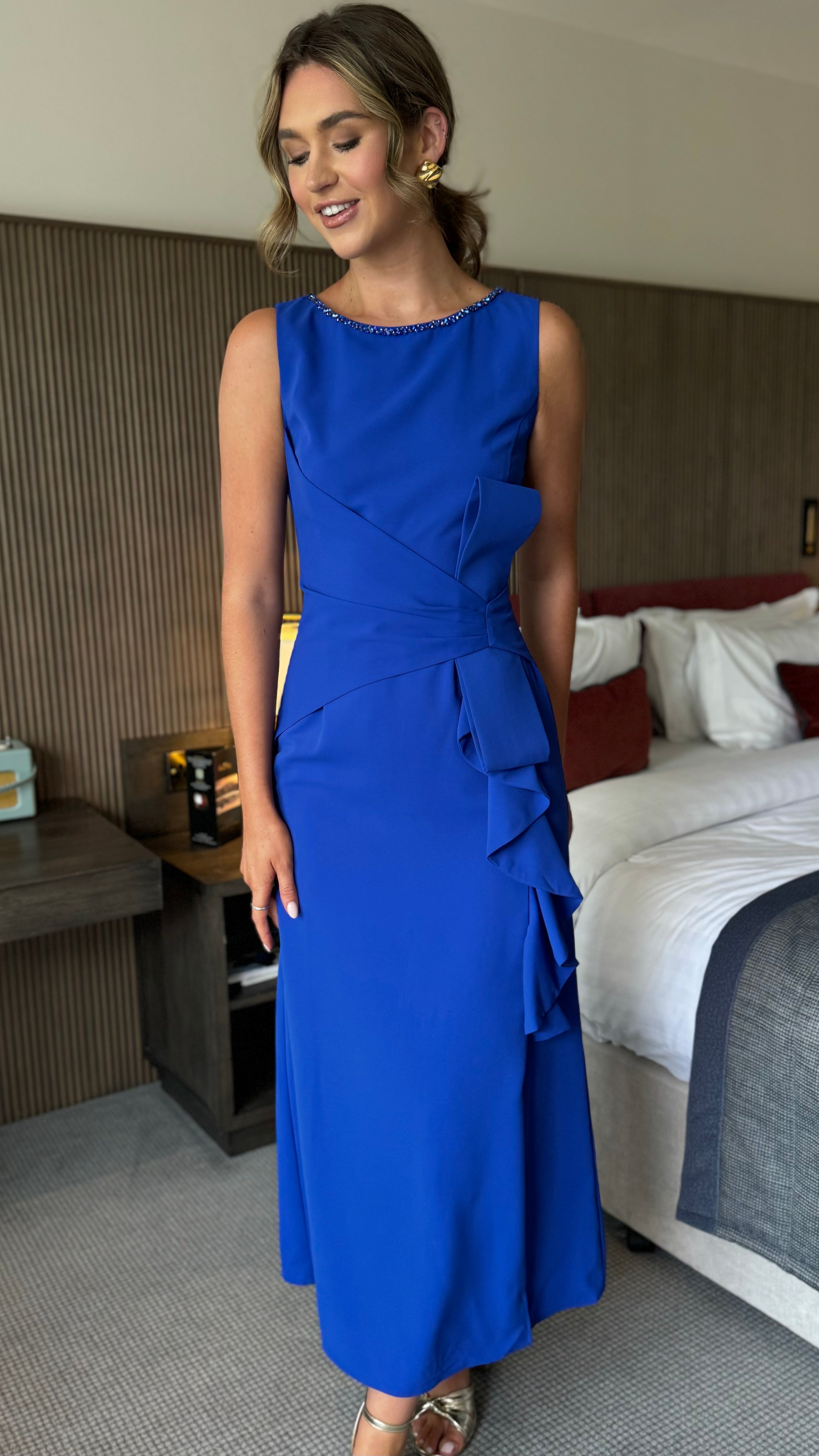 The Kendra Royal Blue Ruffled Midaxi Dress combines elegance with playful design. Its royal blue shade enhances any occasion, featuring a comfortable round neckline and sleeveless cut for ease of movement. Delicate ruffle details and asymmetric panels add a unique flair, while the diamanté neckline brings subtle sparkle.