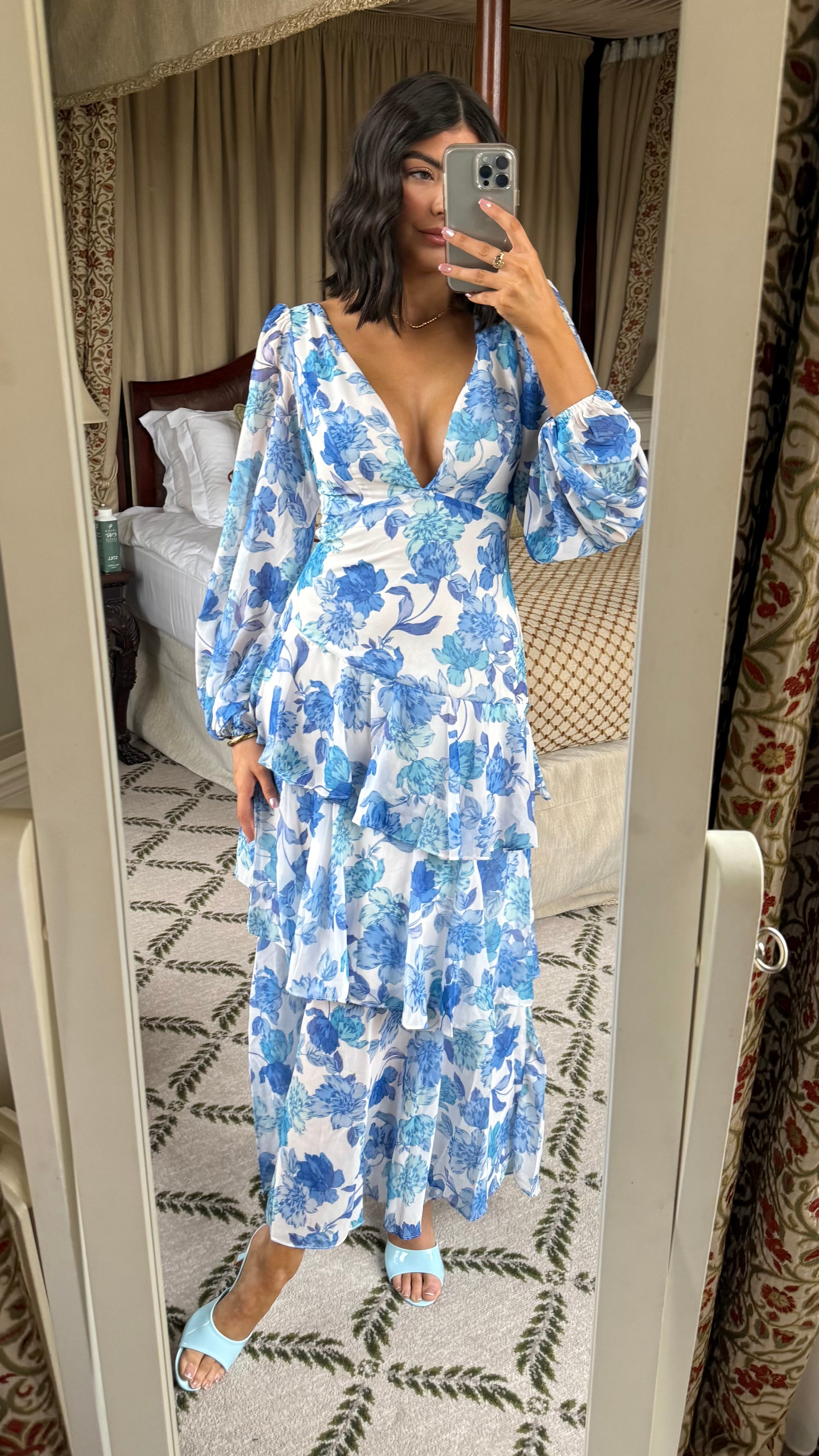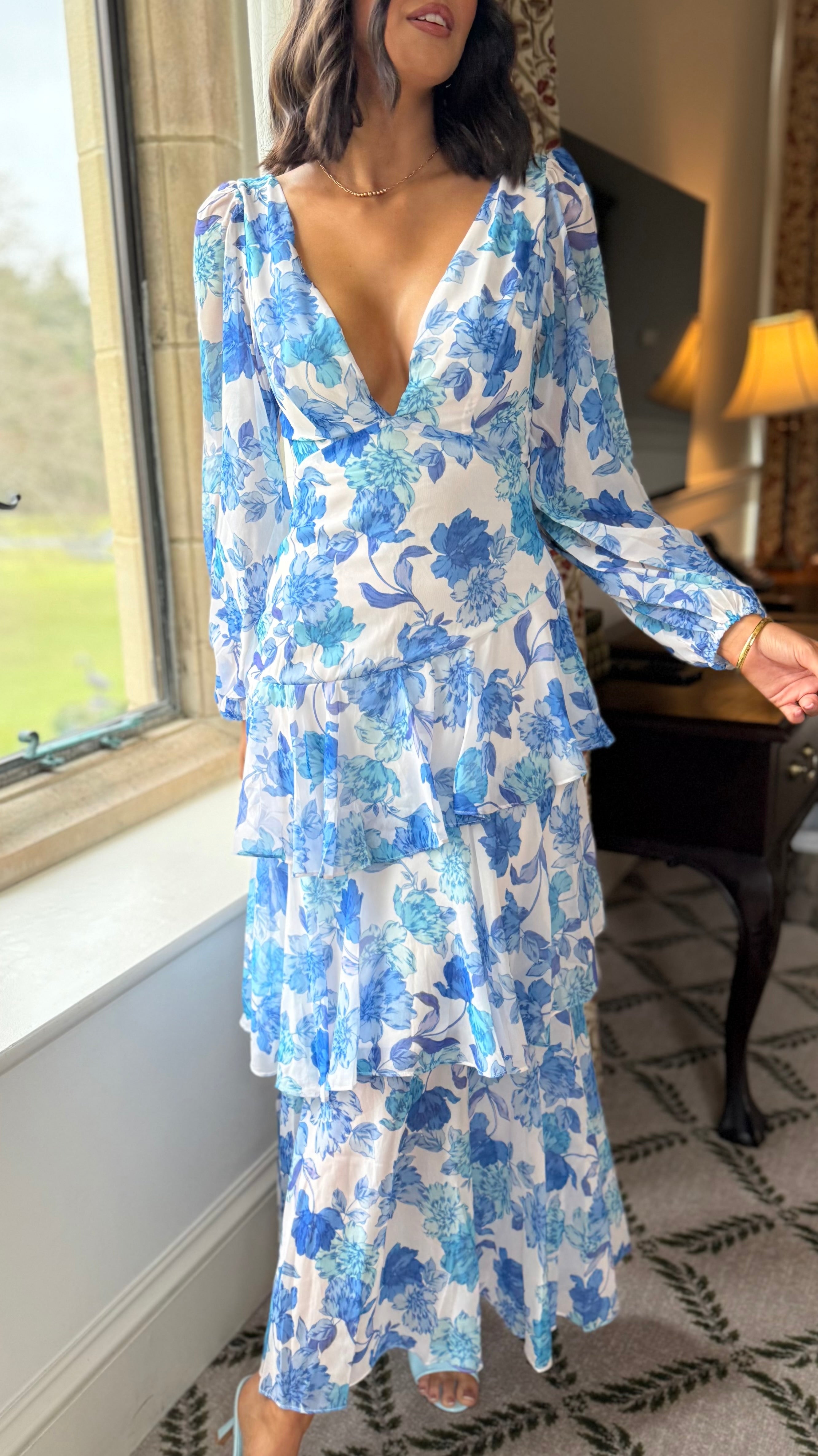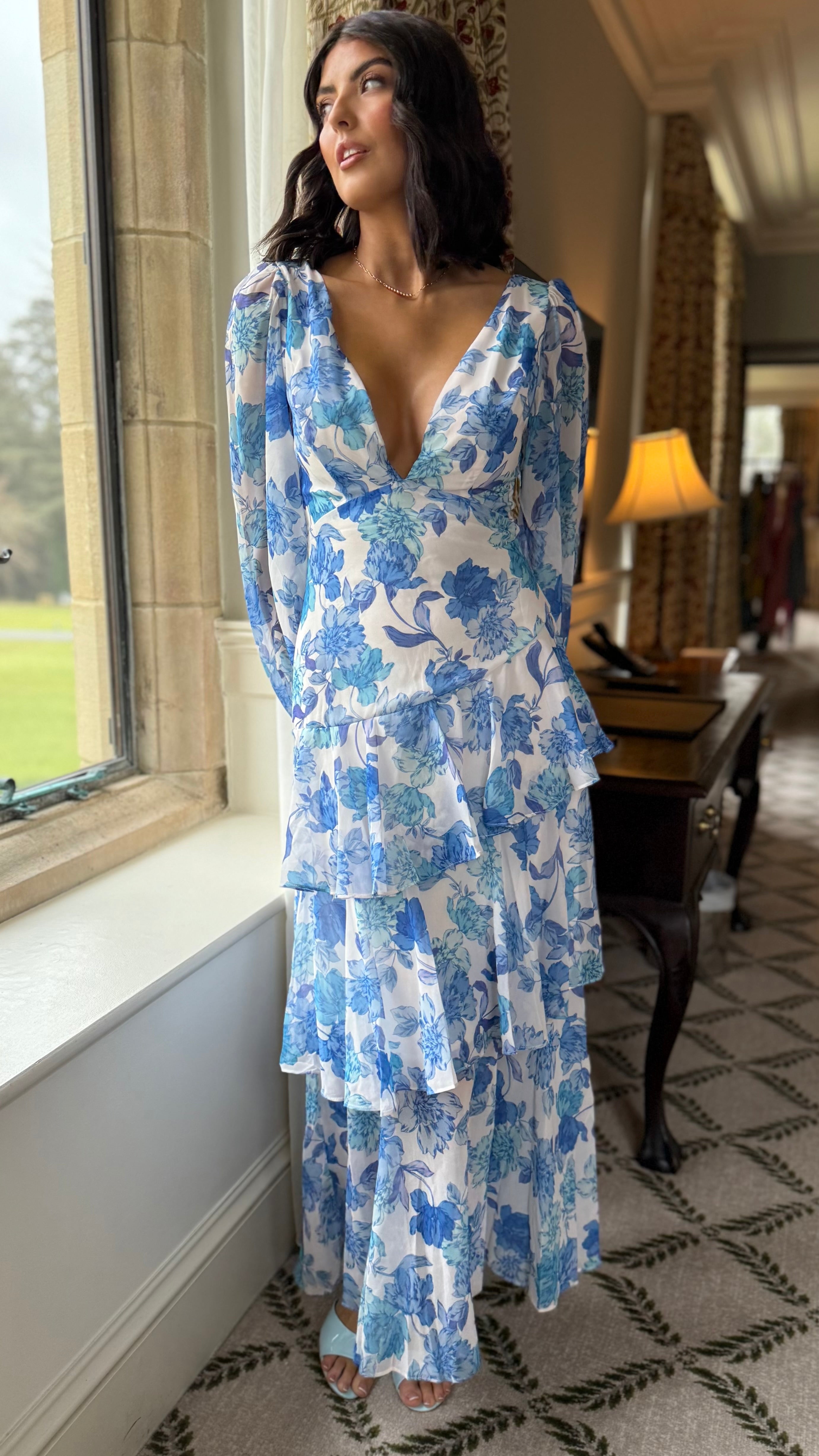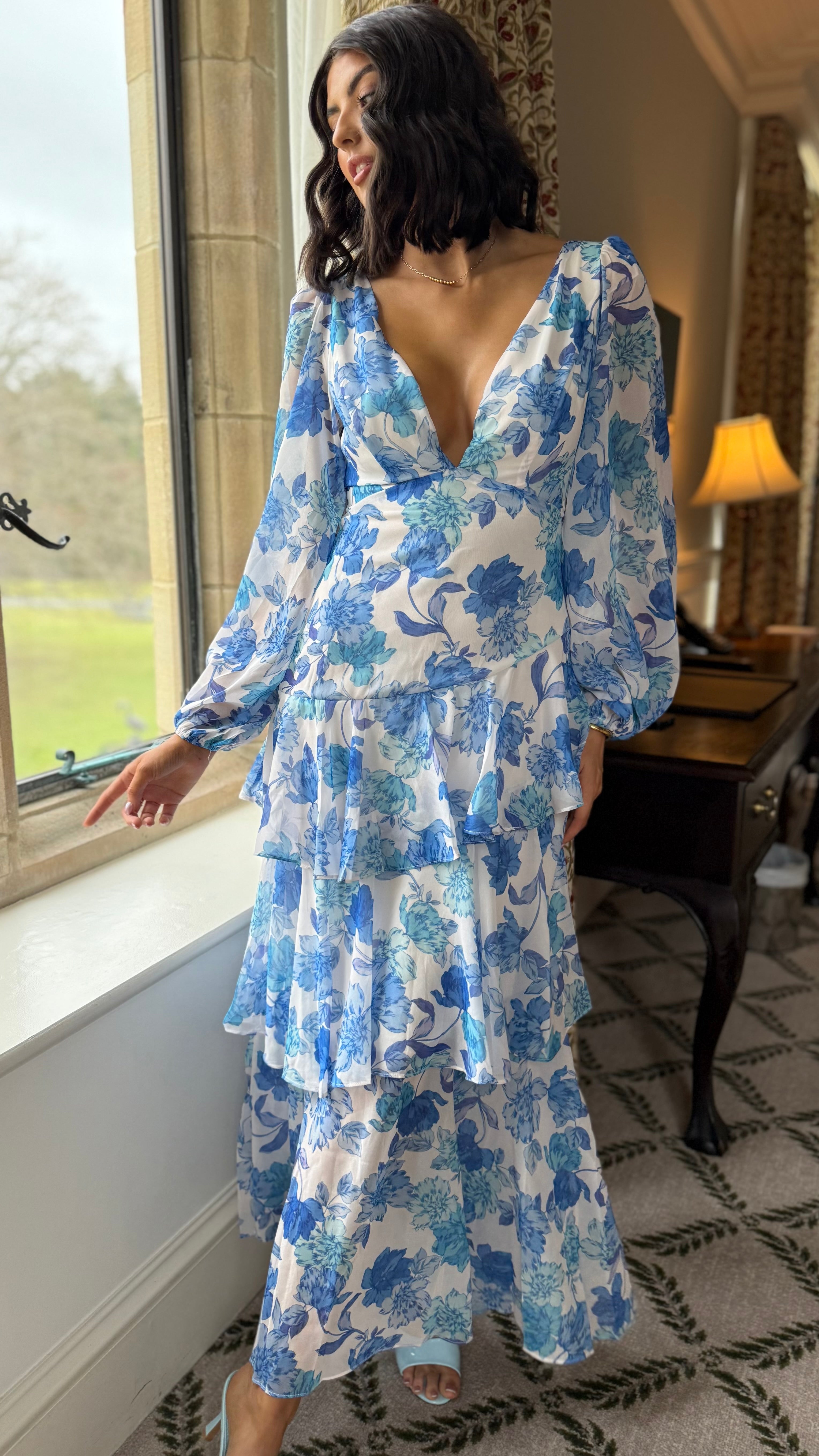Mariah Blue Floral Tie Back Long Sleeve Tiered Maxi Dress
