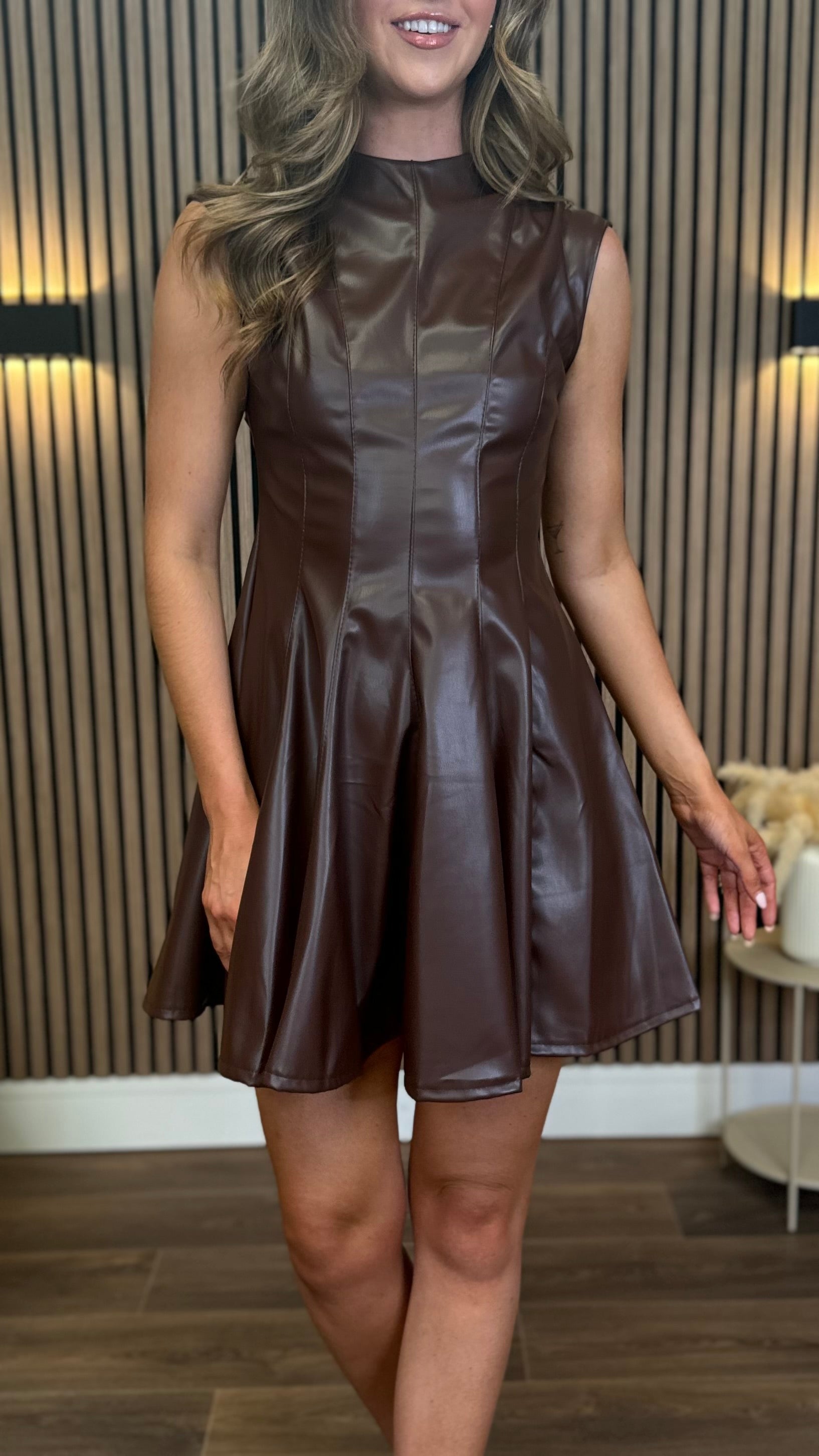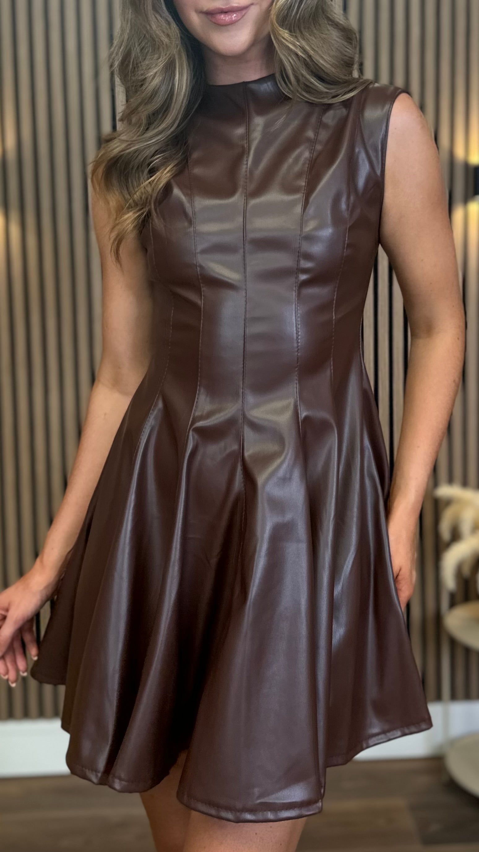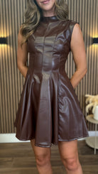 Martina Brown Fuax Leather Sleeveless High Neck Mini Dress