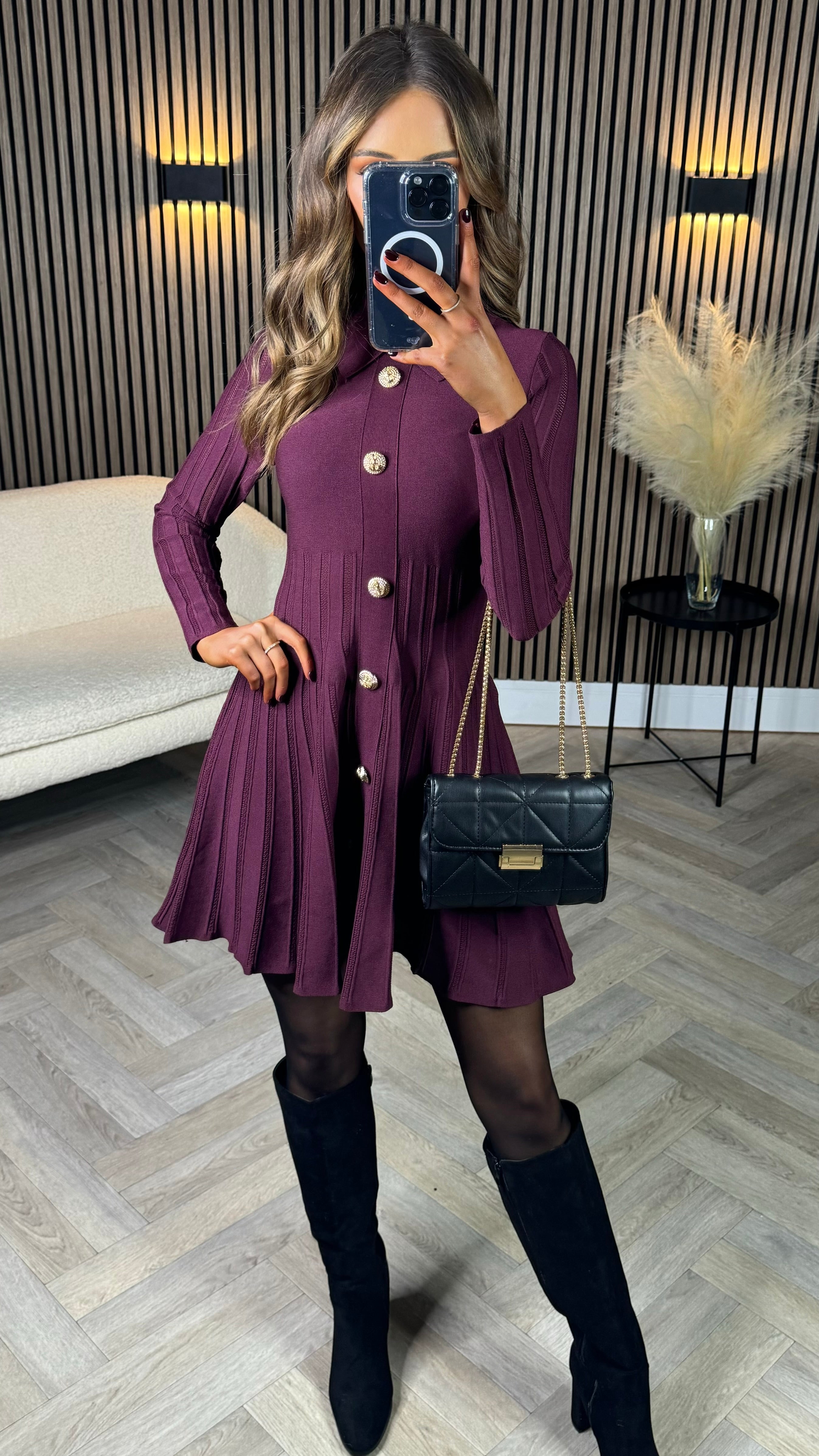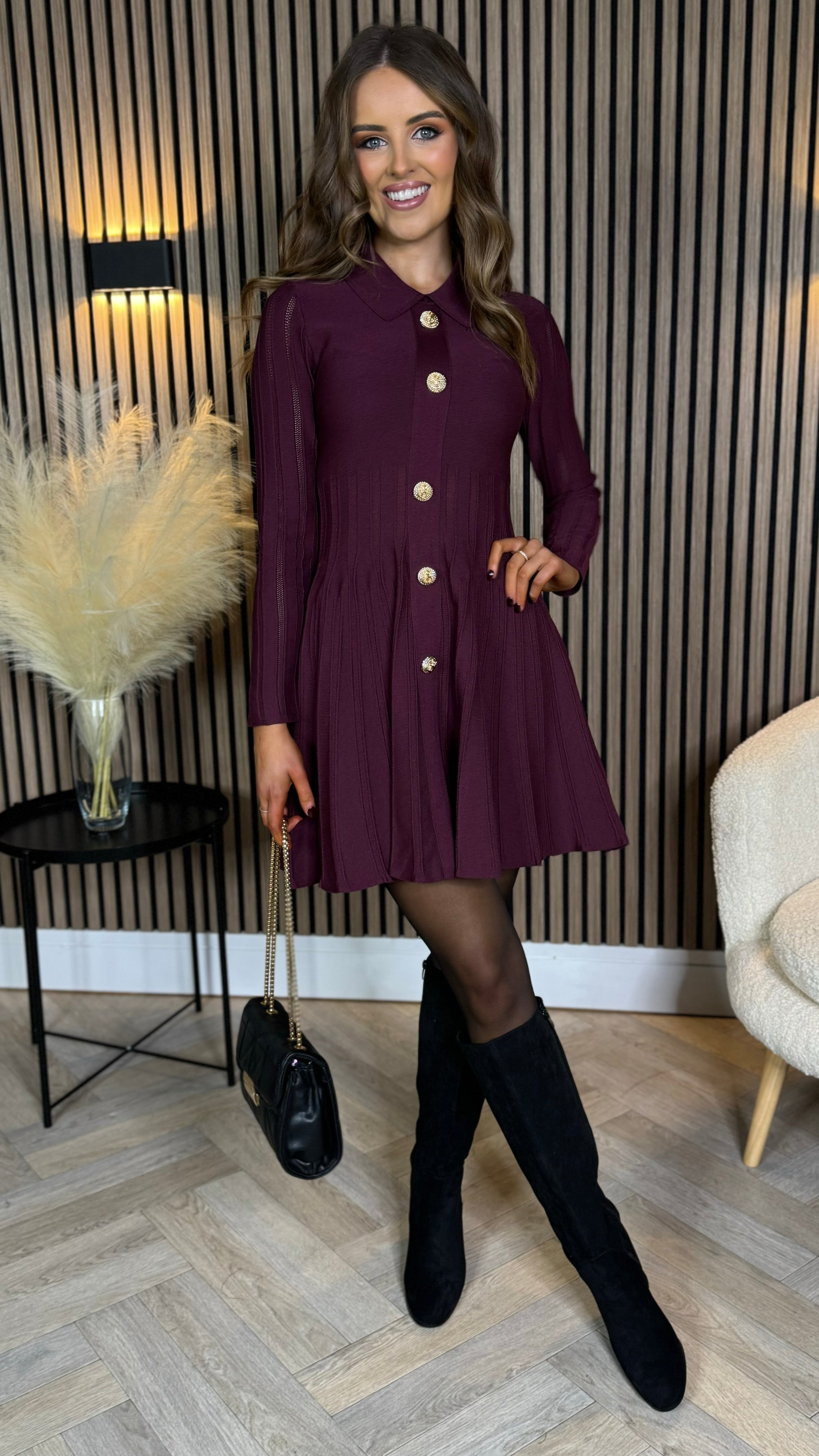 Get ready to slay in the Nessa Burgundy Button Down Collared Knit Mini Dress! This dress features a fitted waist and a slightly fuller skirt, giving you a flattering silhouette. The collared neckline adds a touch of sophistication, while the gold button down detail adds a playful twist. 💃🏻🔥