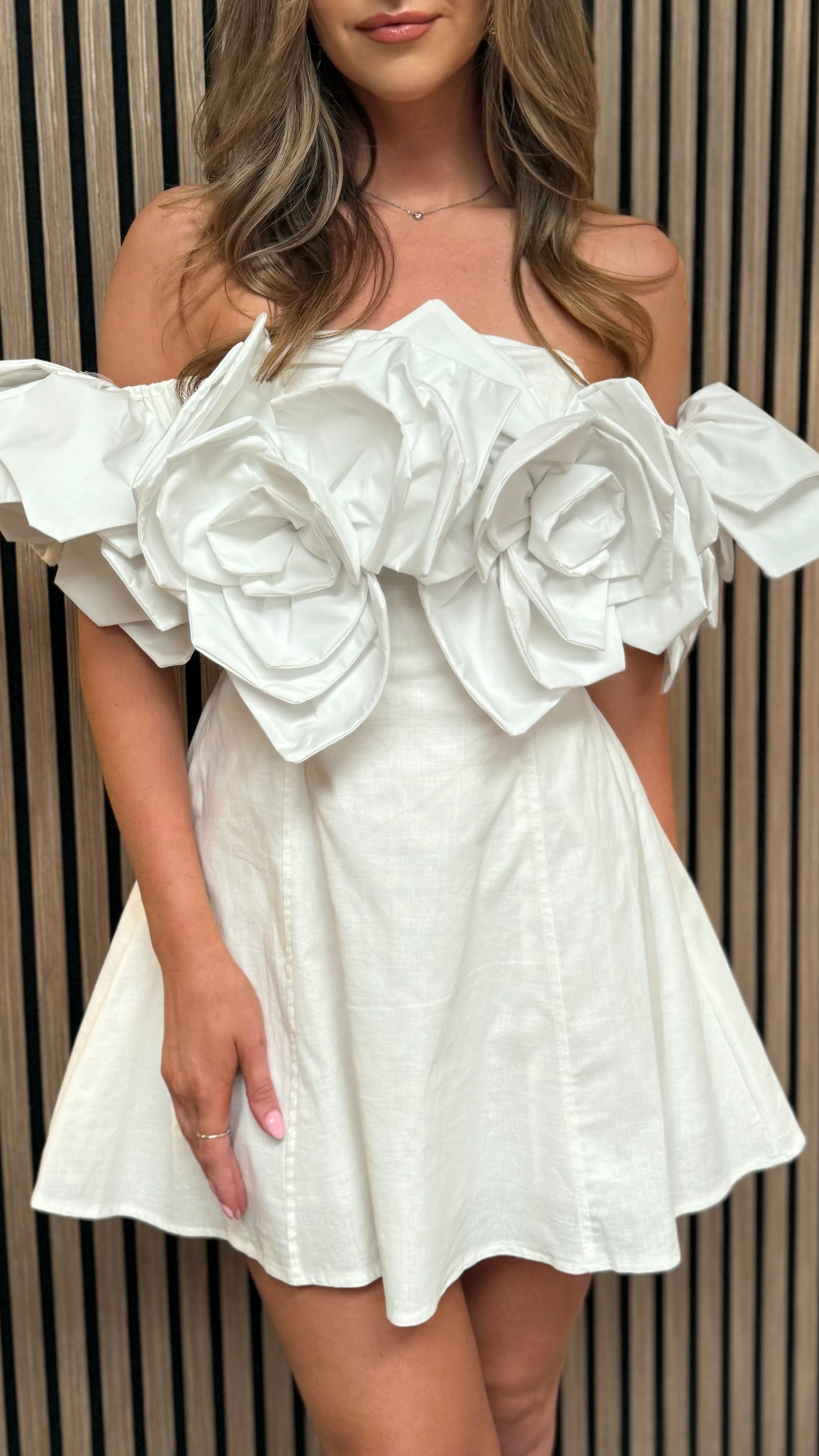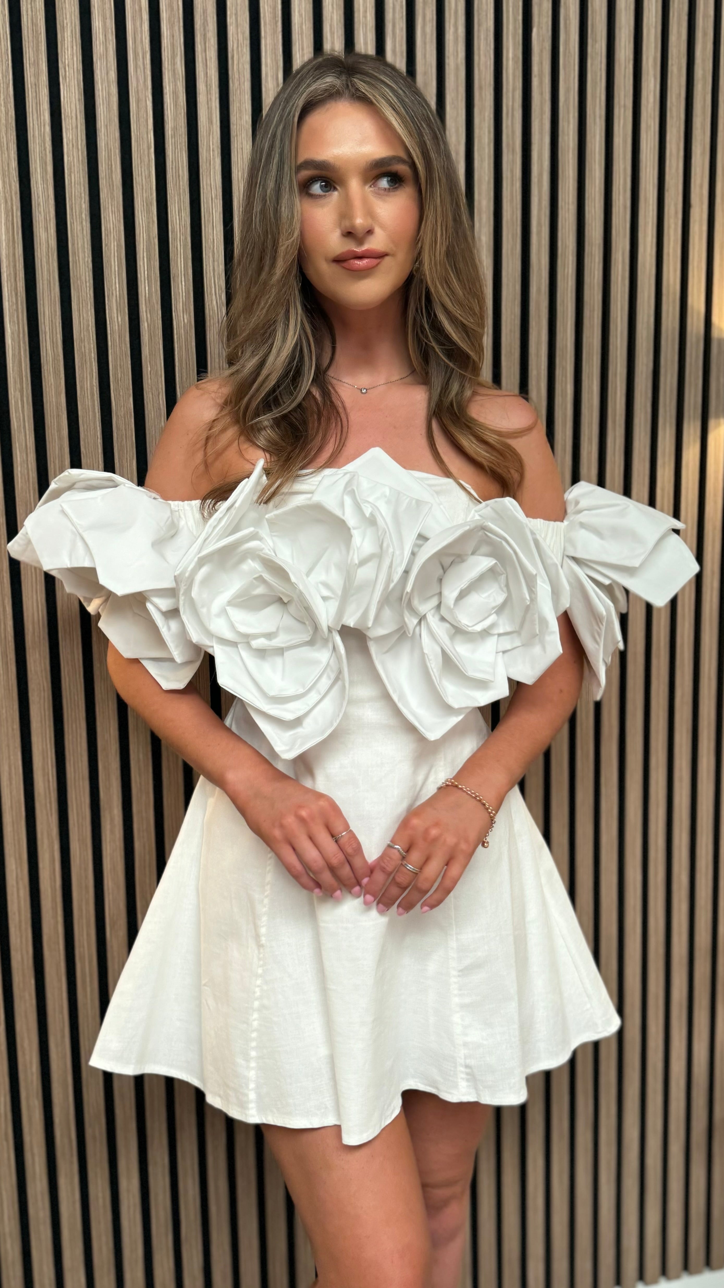 Be the center of attention in the Oonagh White Strapless 3D Floral Mini Dress. The pleated skirt and strapless design create a flirty look, while the 3D floral design adds a unique touch. Perfect for brides-to-be.
