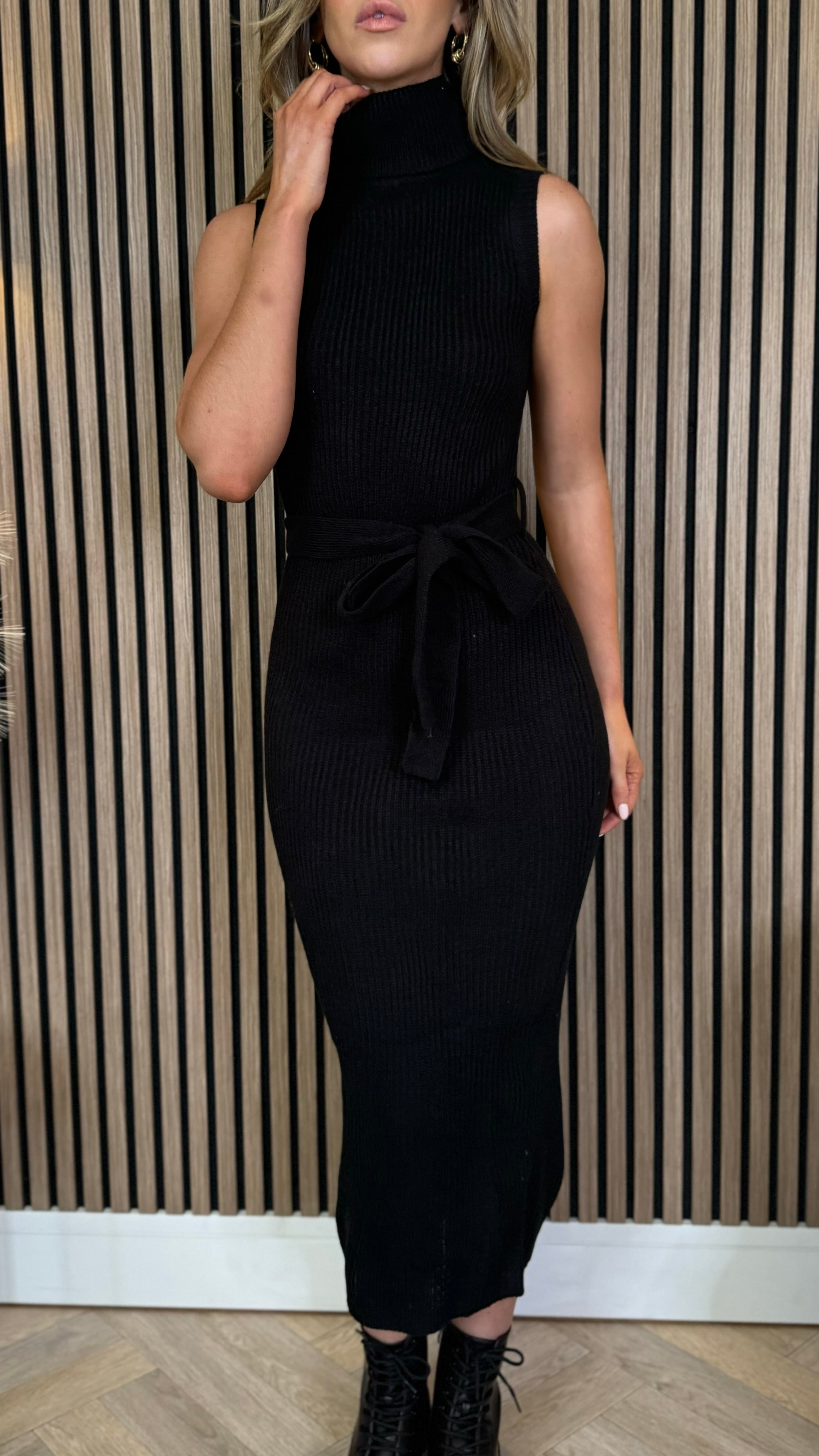 Our Paige Black Roll Neck Sleeveless Belted Knit Midi Dress is a must-have for any wardrobe! Stay warm and stylish with its roll neck and ribbed edging. Use the tie belt and belt loops to create a flattering silhouette. Perfectly paired with boots for a chic look! 💃🏻