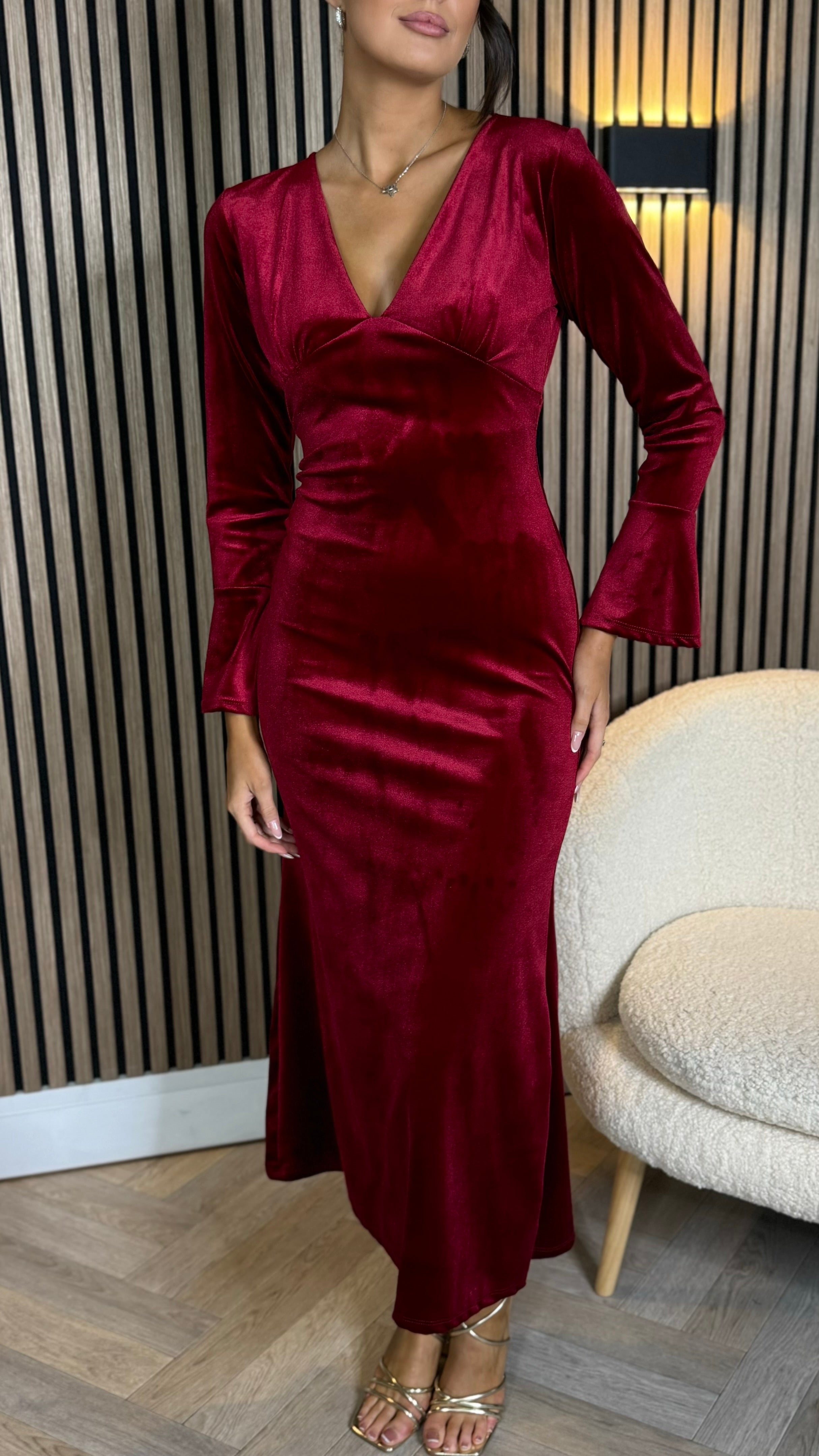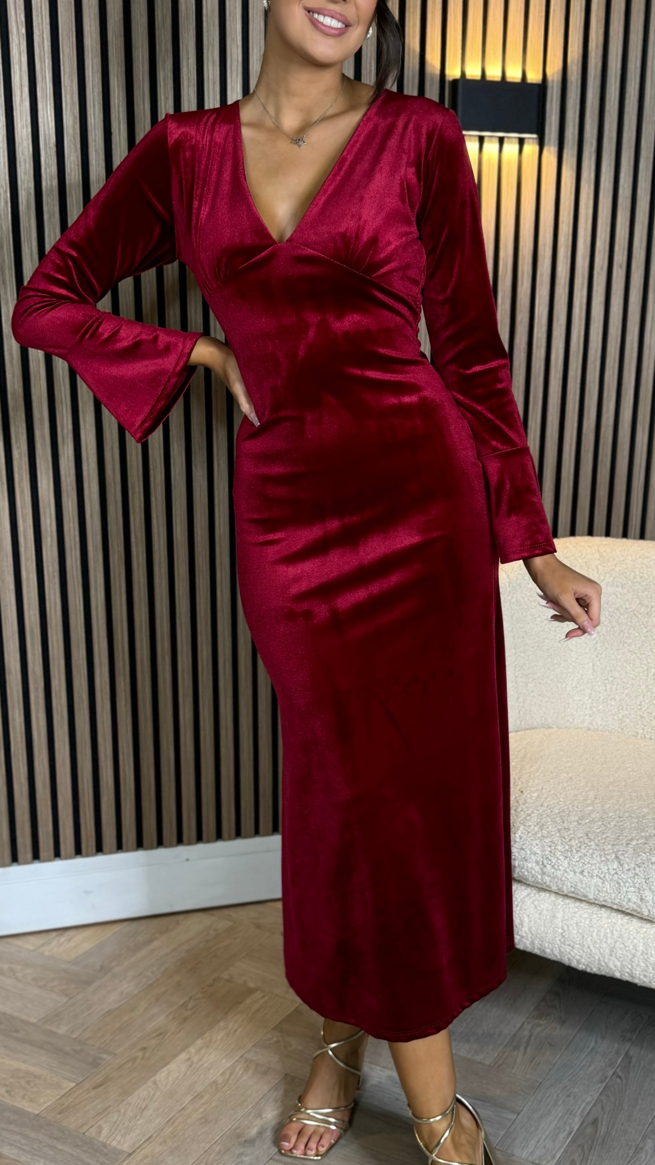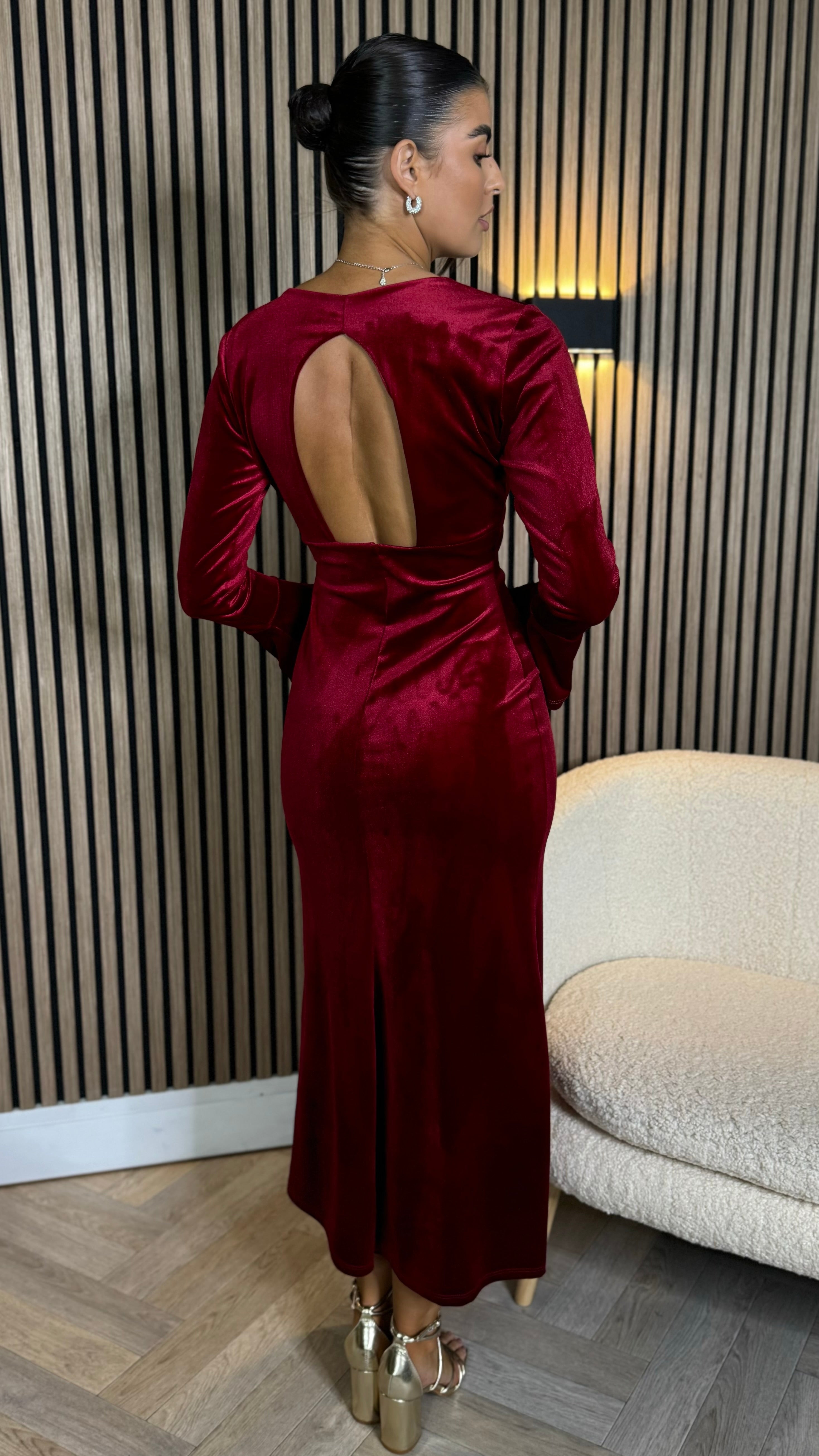 Rhett Burgundy V Neckline Back Cut Out Velvet Finish Midi Dress
