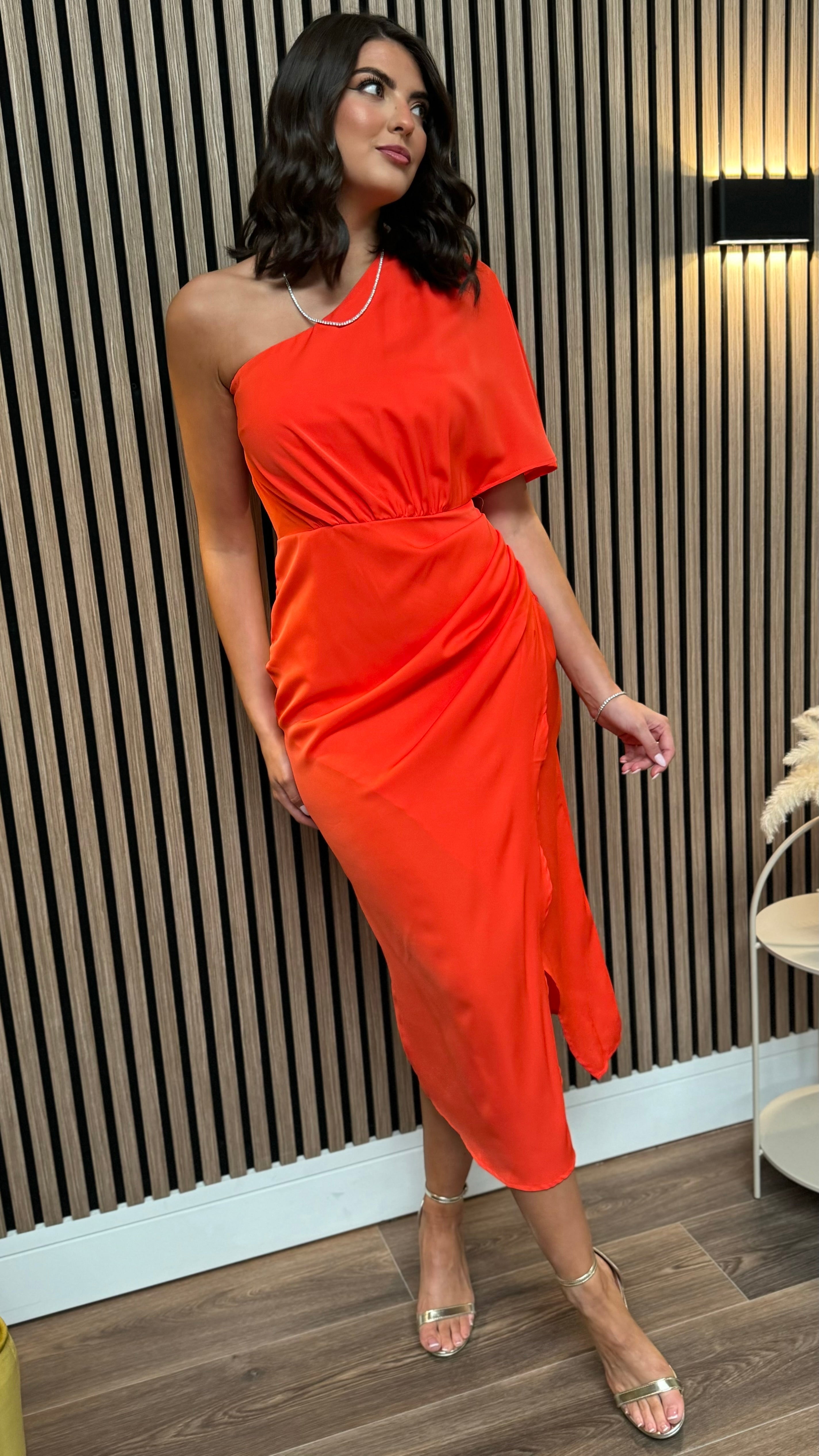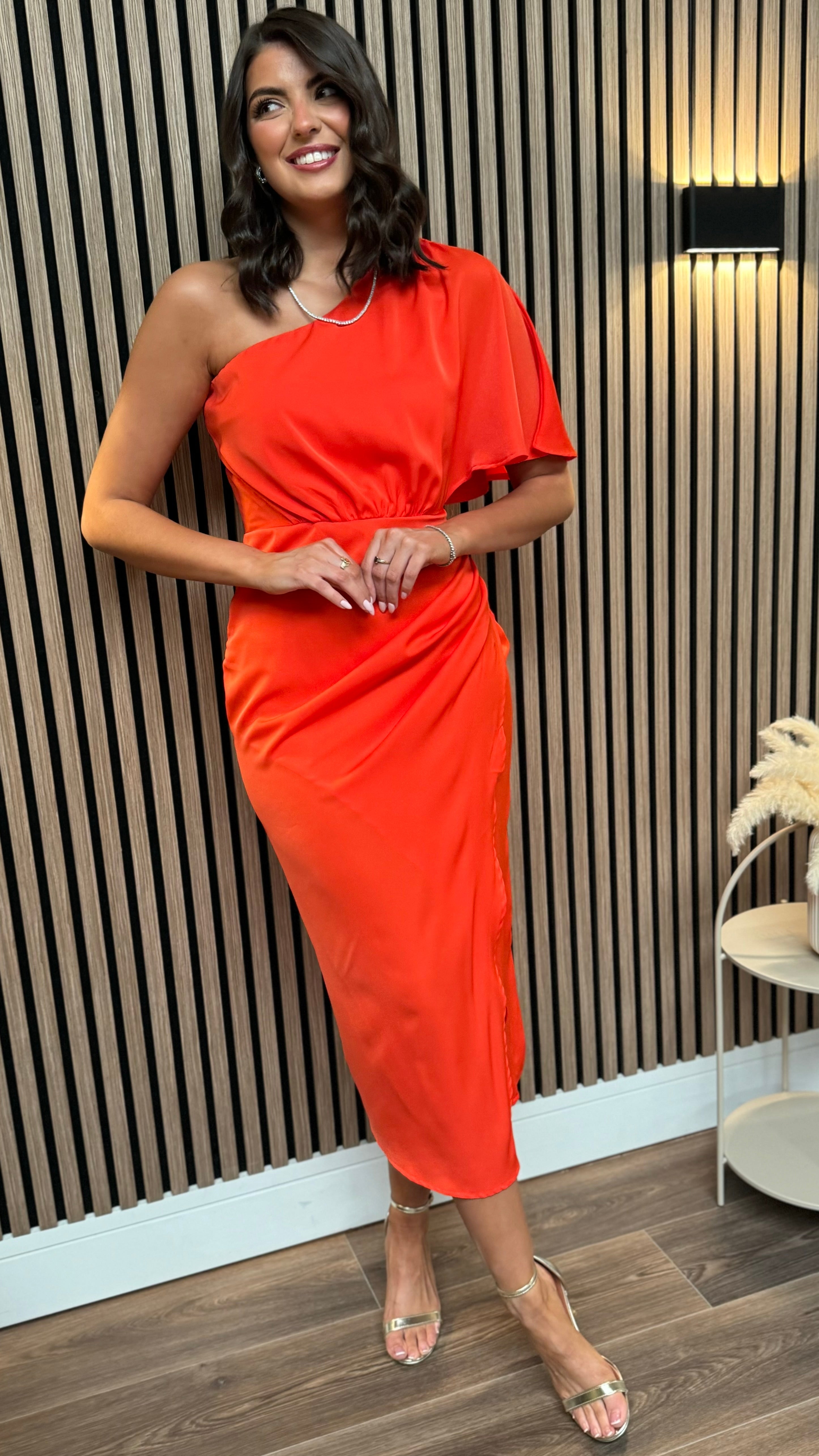 Be effortlessly chic in our Rosita Orange One Shoulder Butterfly Sleeve Faux Wrap Midi Dress. The one shoulder design and butterfly sleeve add an elegant touch while the pleated waist and draped wrap skirt create a flattering silhouette. Perfect for any occasion, complete the look with strappy heels and a matching clutch.