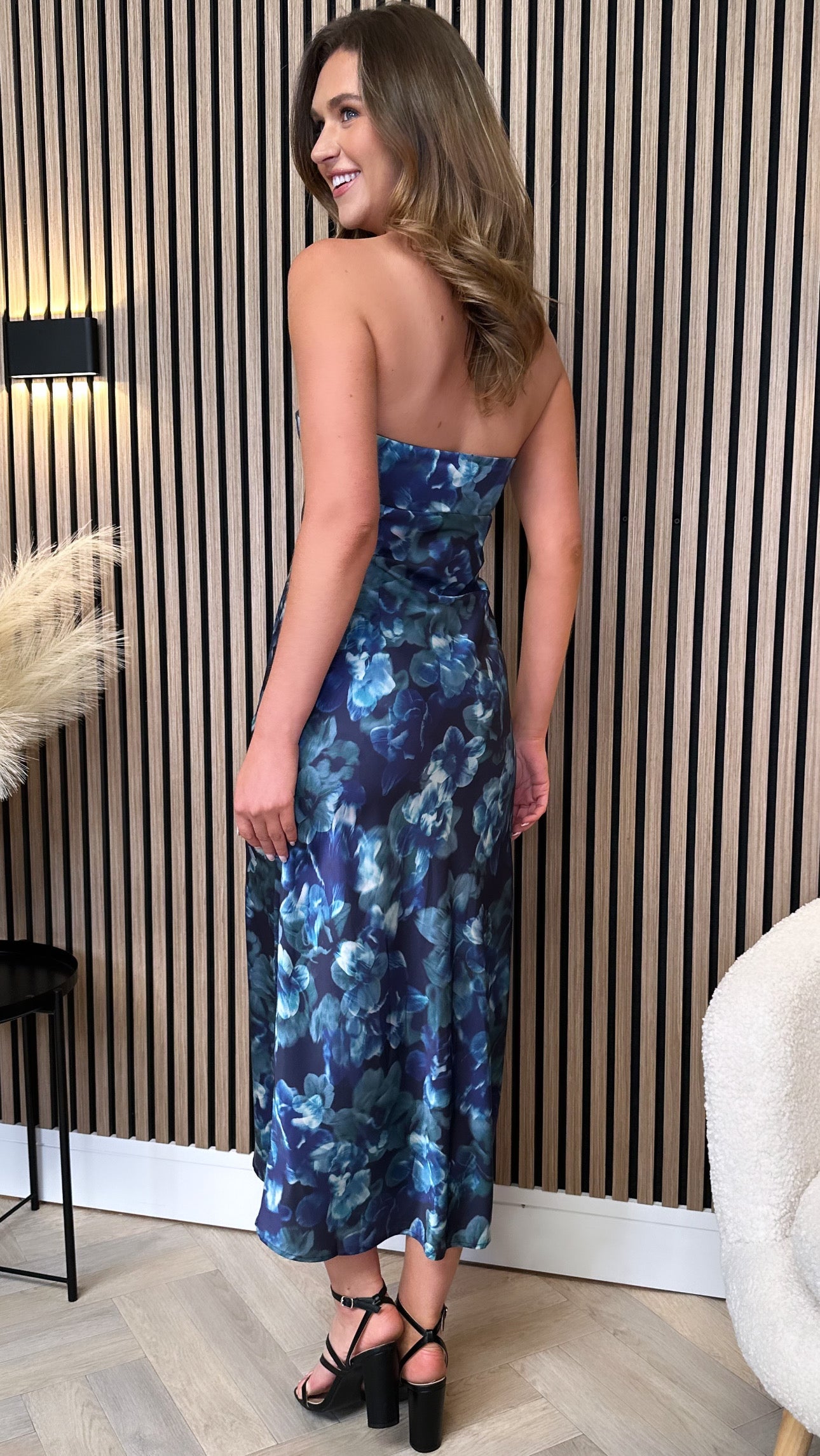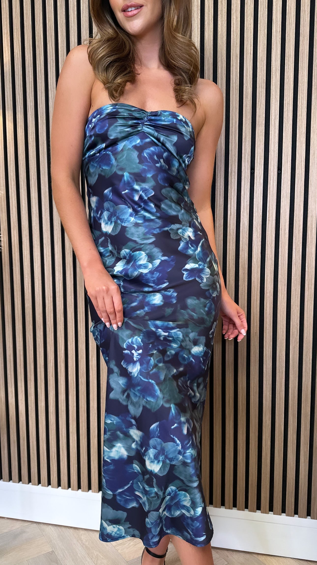 Introducing the Rozario Strapless Midi Dress - the perfect blend of elegance and playfulness 🎉 This dress features a unique ruched bust detailing that highlights your curves and adds a touch of whimsy. With its bold blue and purple color combination, you'll stand out at any event.