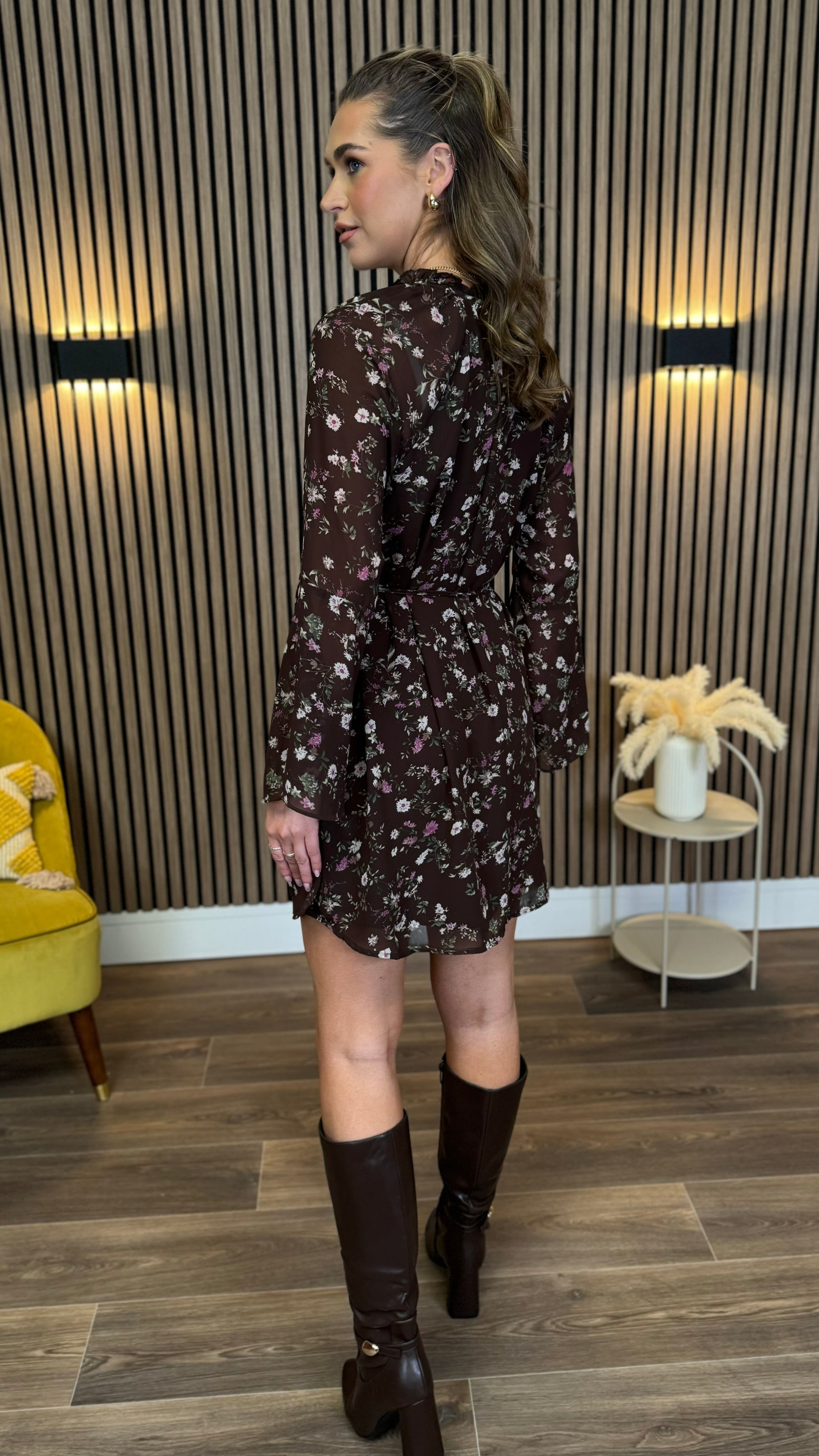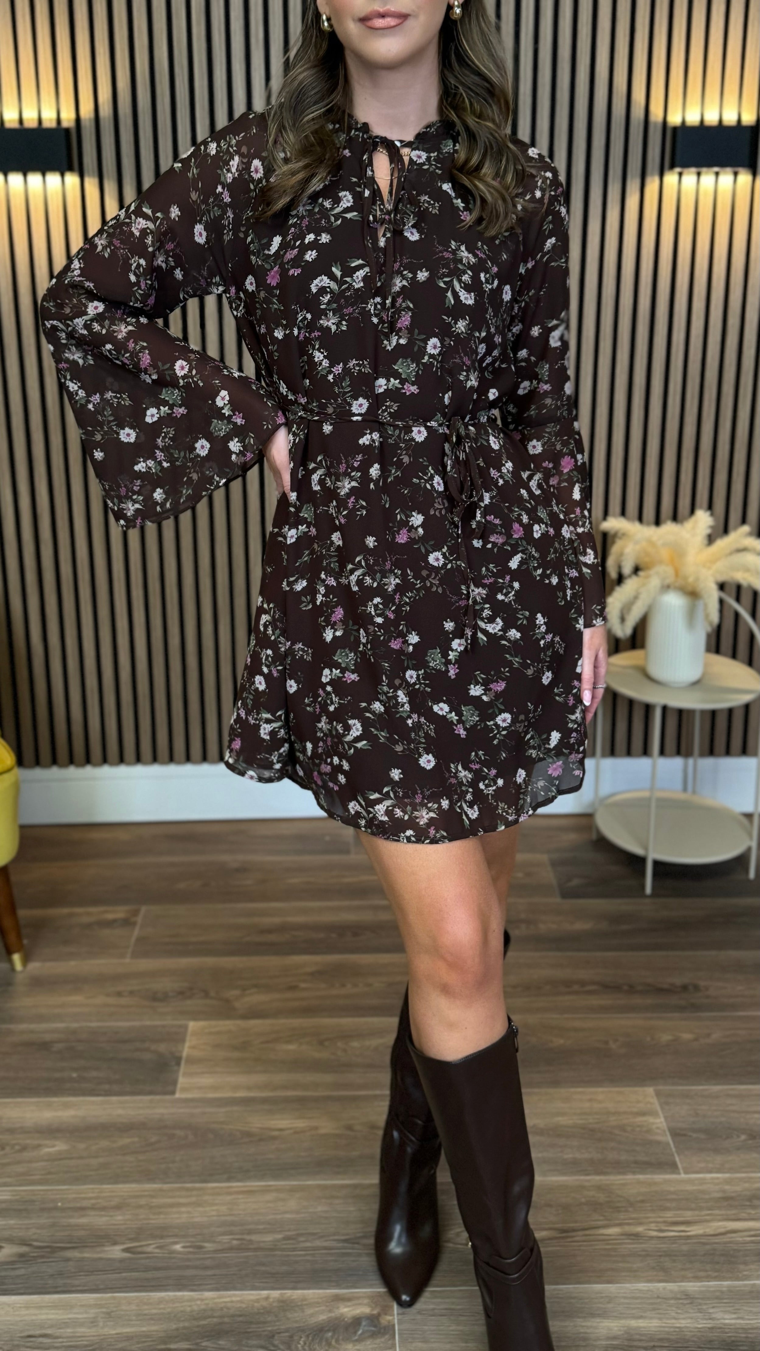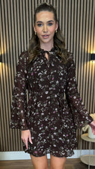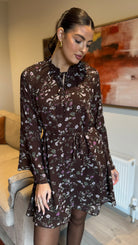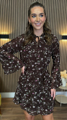 The Ryder Brown Floral Tie Detail Mini Dress brings playful charm with its delicate floral print and flowing chiffon fabric. Featuring long bell sleeves and a tie at the neckline, it adds a touch of whimsy to your look. The removable tie belt cinches the waist for a flattering silhouette, while the lined chiffon ensures comfort and coverage. Perfect for days when you want to feel effortlessly feminine and fun.