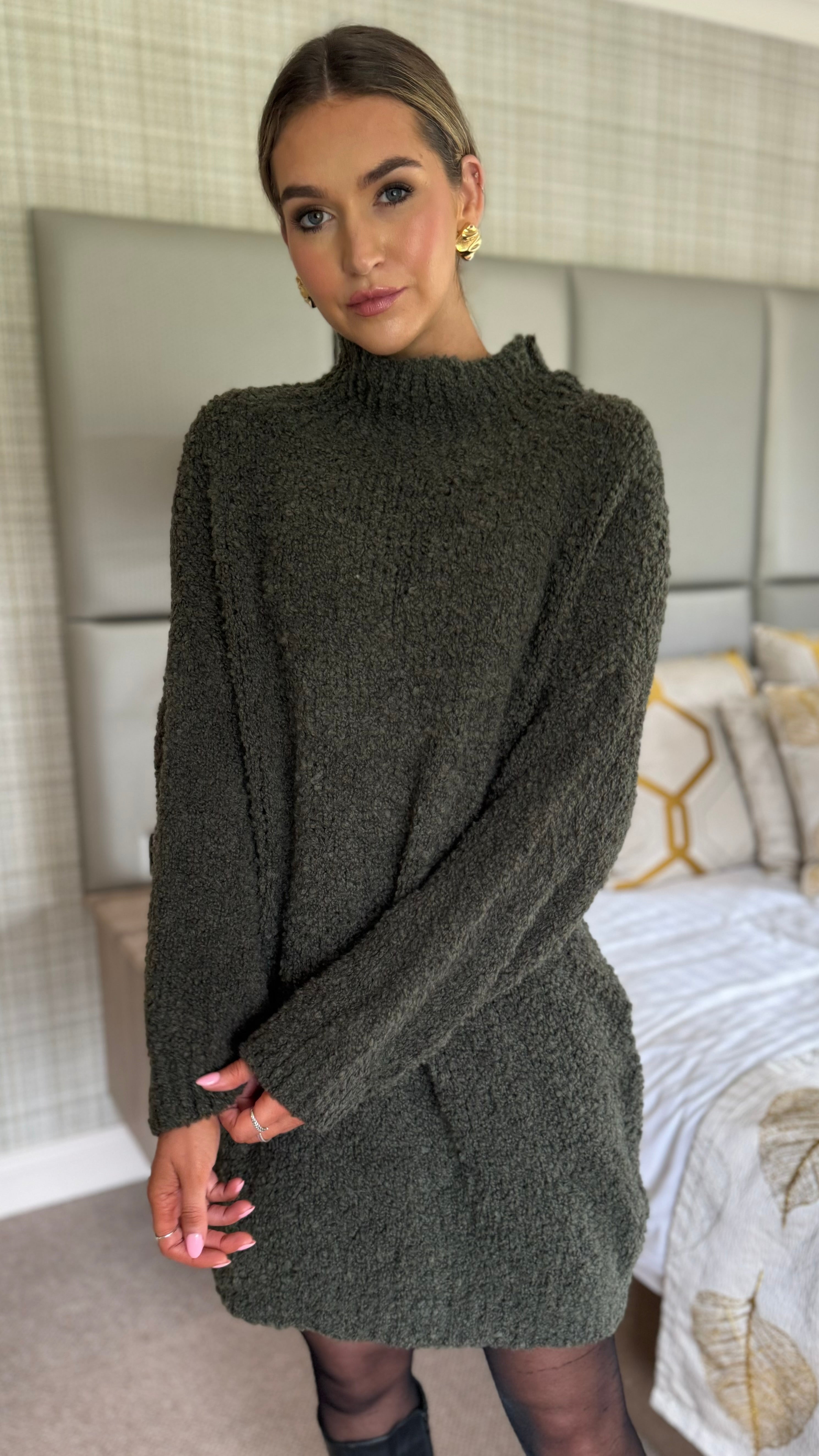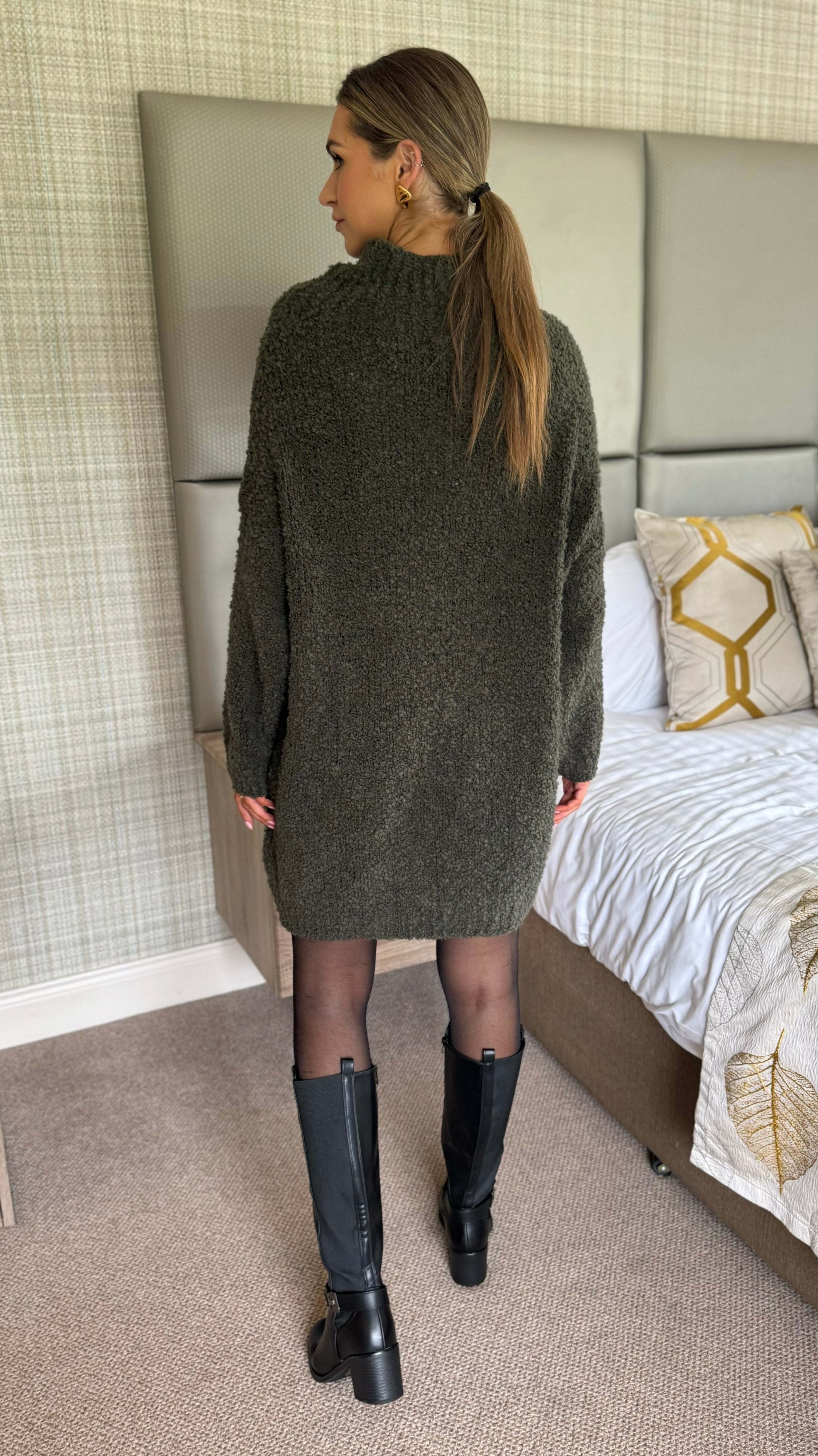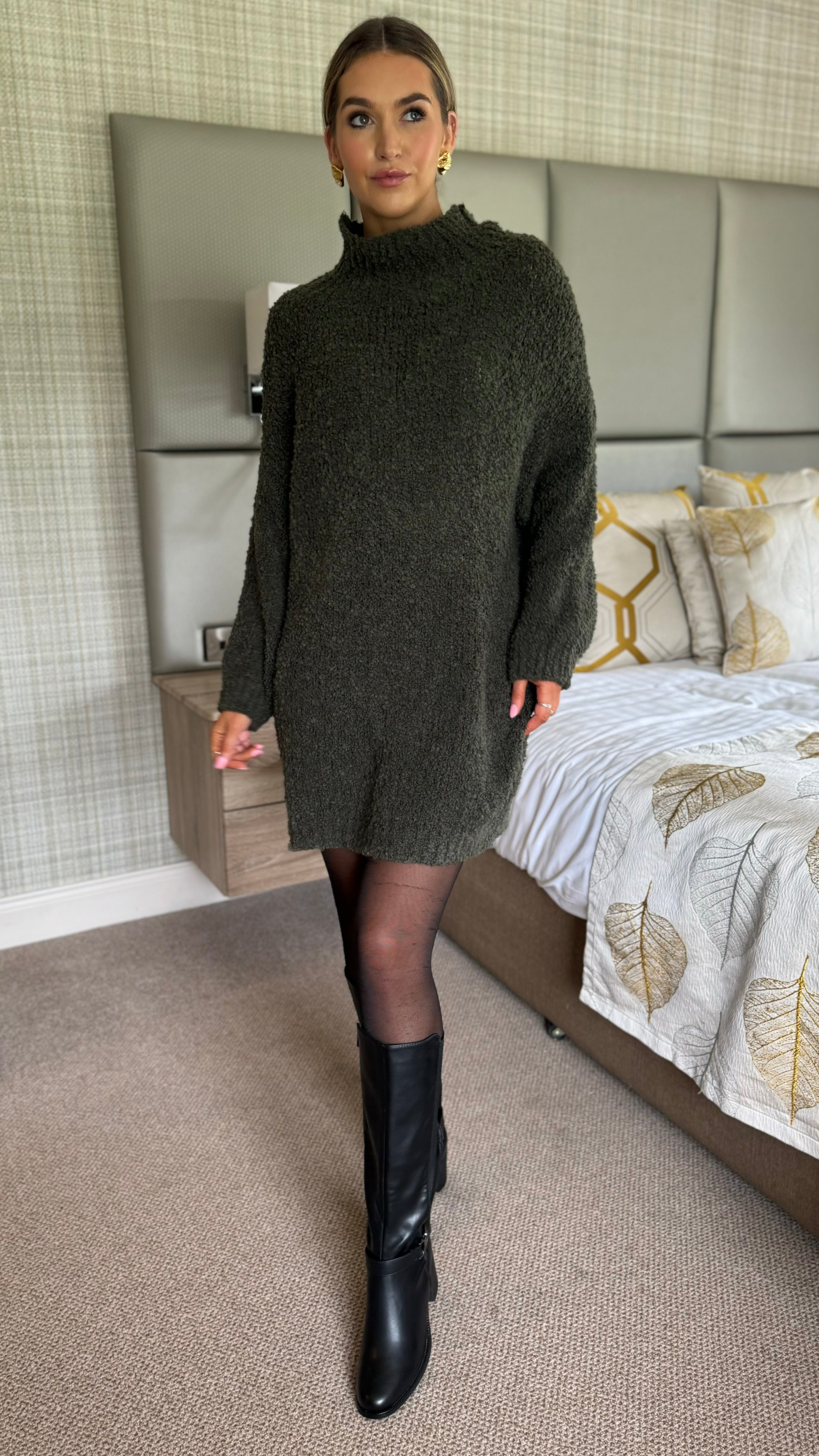 Stay cosy and stylish with our Sadie Khaki Chunky Knit Jumper Dress. Perfect for cooler days, this dress features a high neck for added warmth. Embrace the chunky knit trend and elevate your winter wardrobe with this must-have piece.