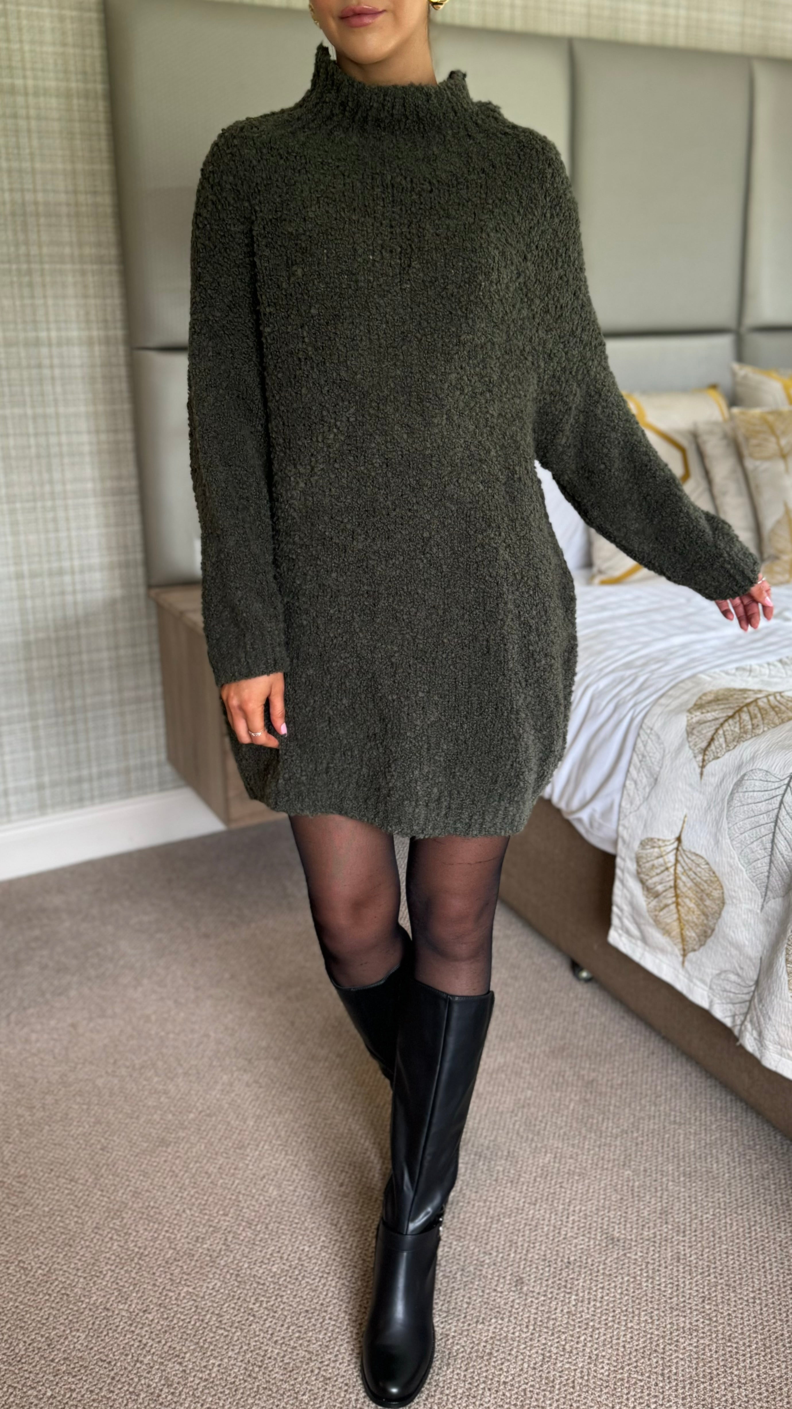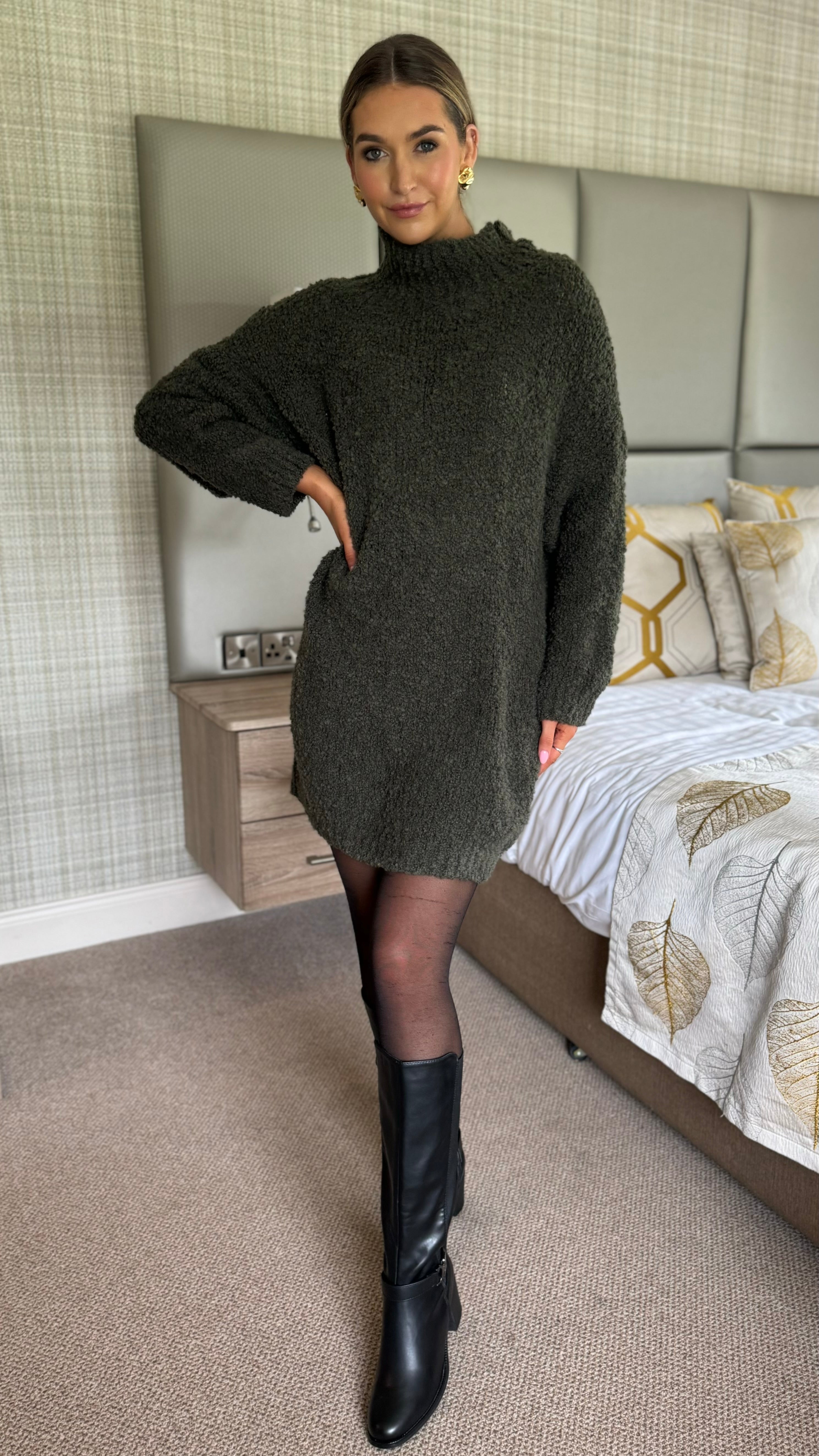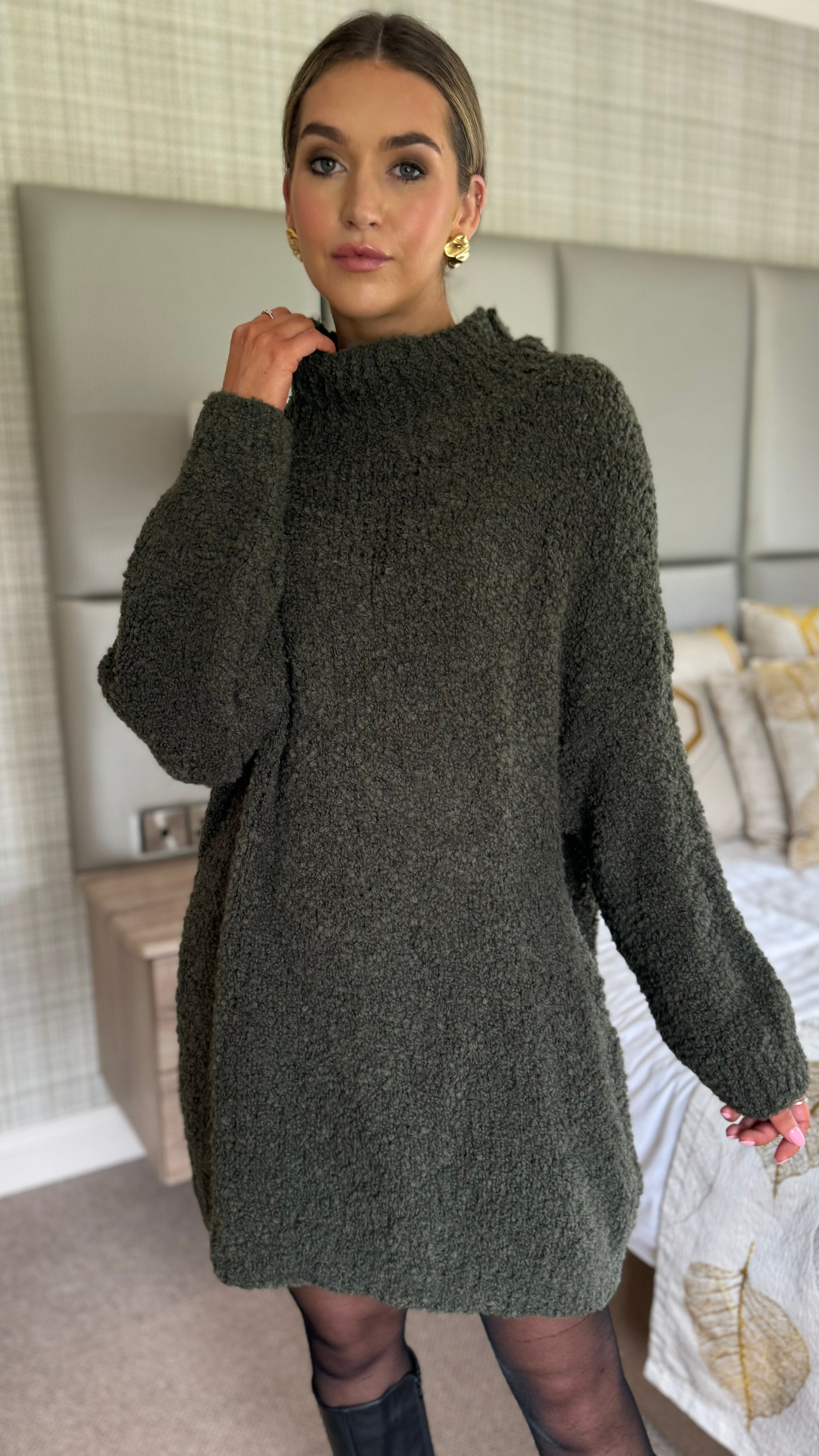 Stay cosy and stylish with our Sadie Khaki Chunky Knit Jumper Dress. Perfect for cooler days, this dress features a high neck for added warmth. Embrace the chunky knit trend and elevate your winter wardrobe with this must-have piece.