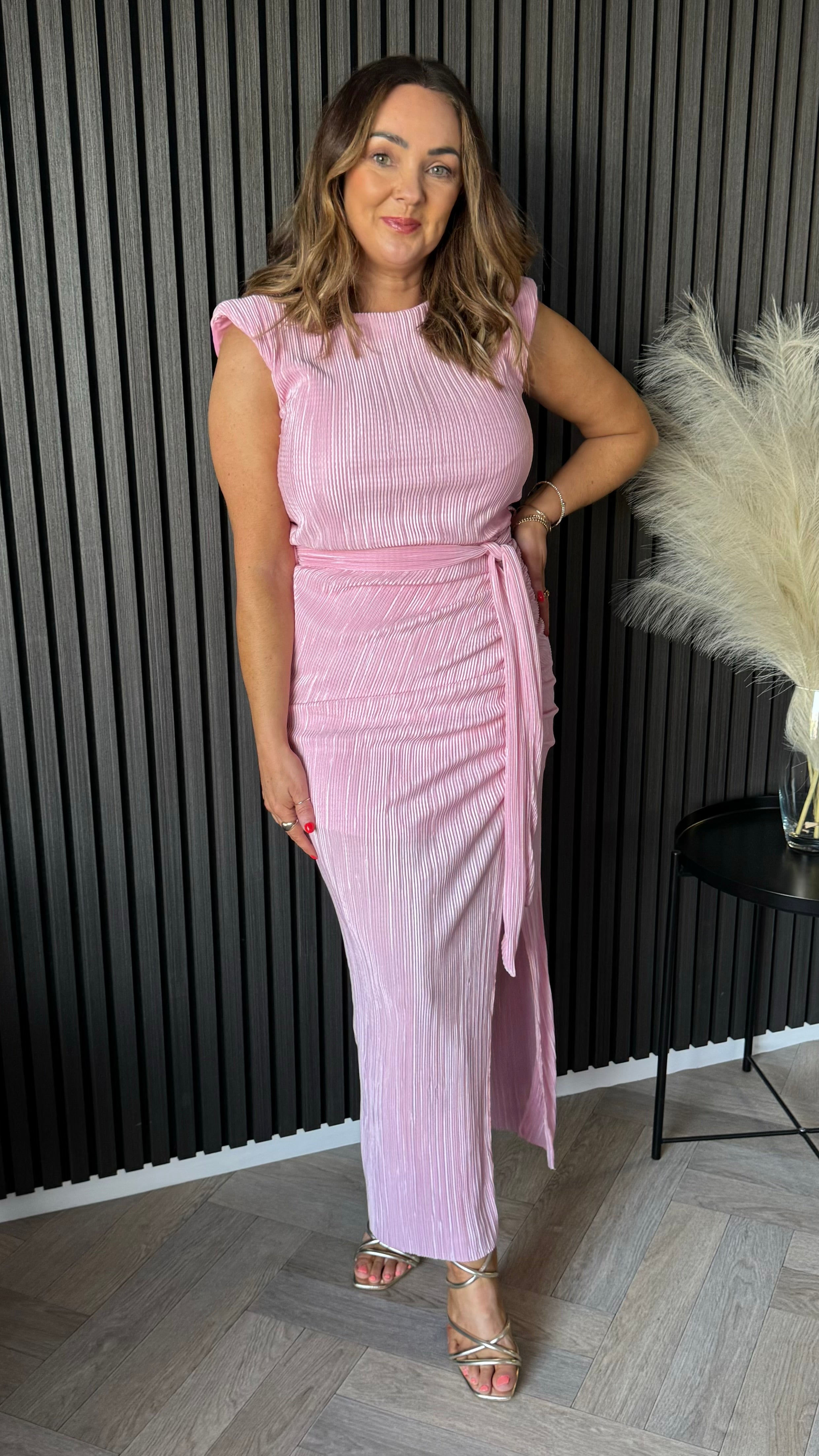 Introducing the Sarah Ruched High Neck Midi Dress. With delicate ruching and seaming, this plisse dress creates a flattering silhouette and exudes sophistication. The unique texture adds a touch of elegance, making it perfect for any occasion. Elevate your wardrobe with this luxurious baby pink dress.