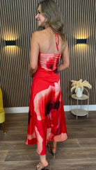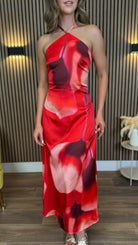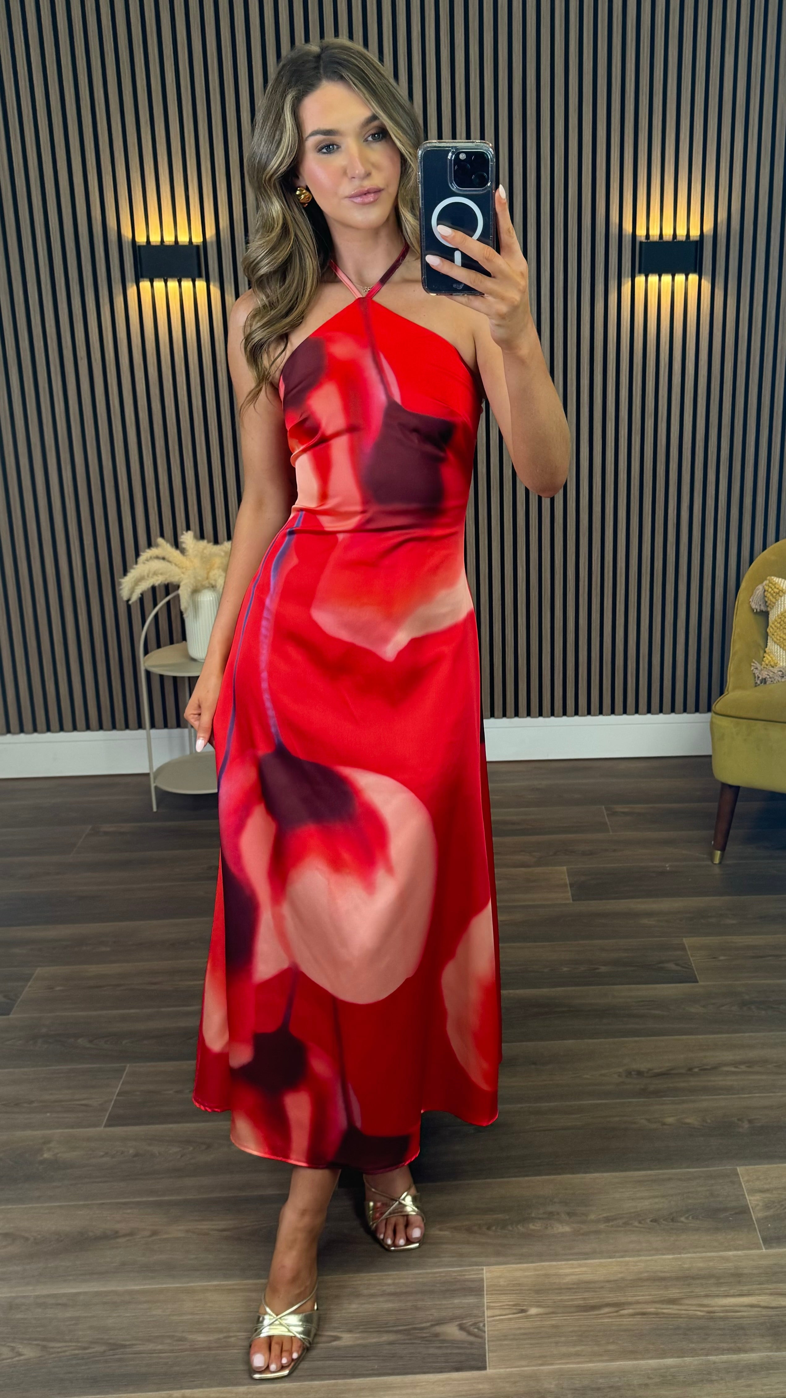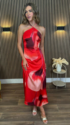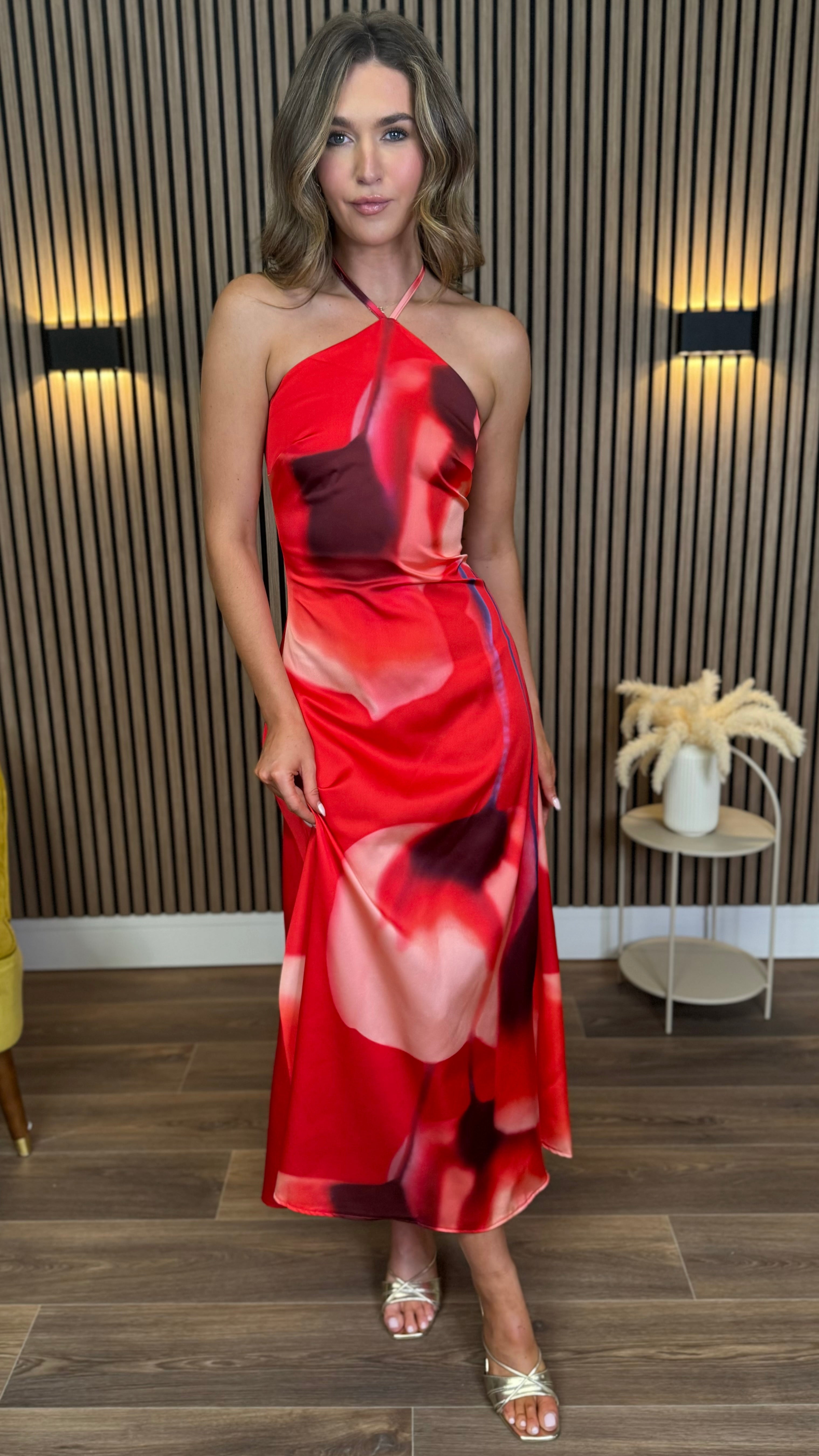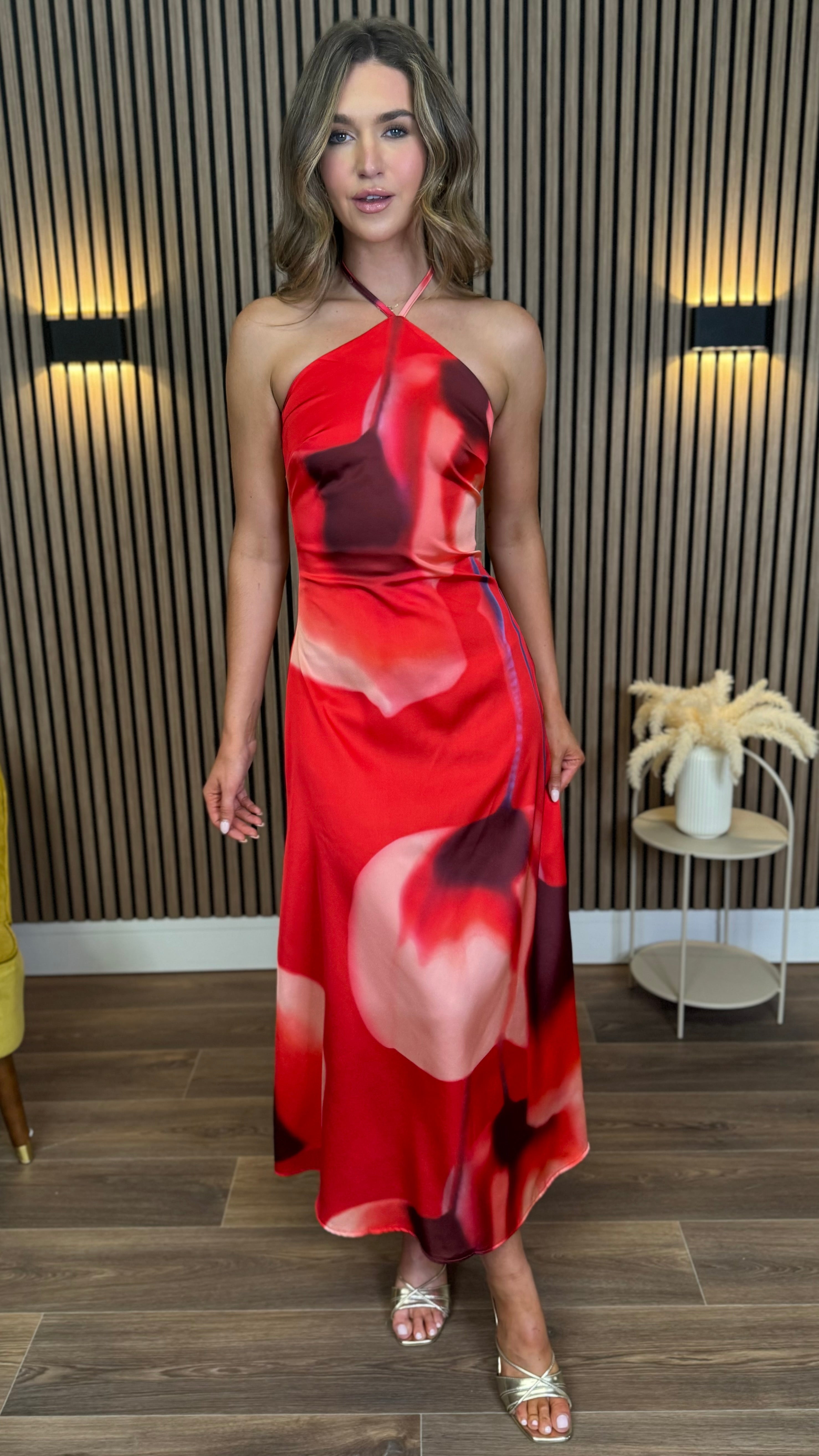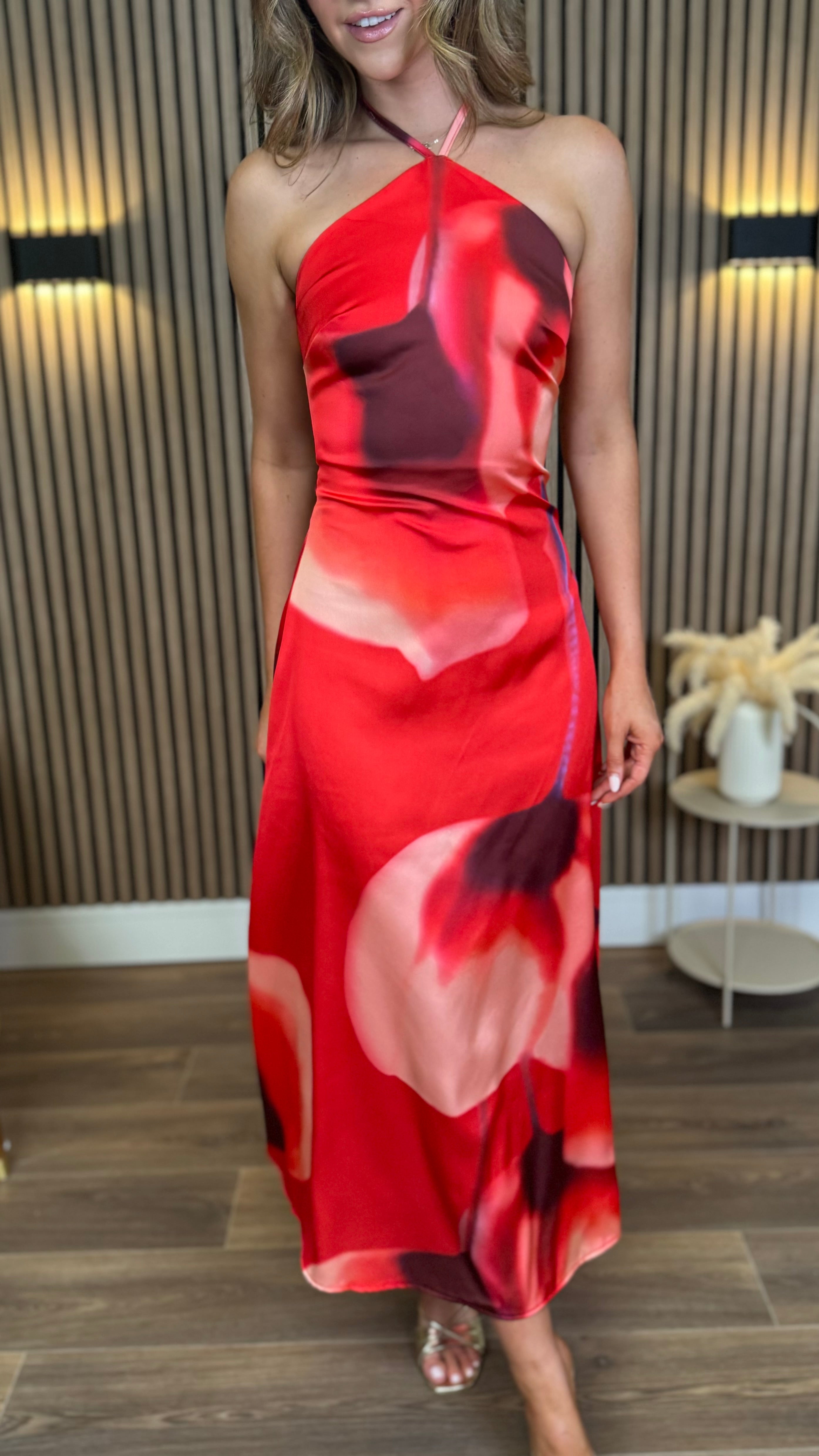 Selma Red & Purple Floral Halterneck Satin Midi Dress