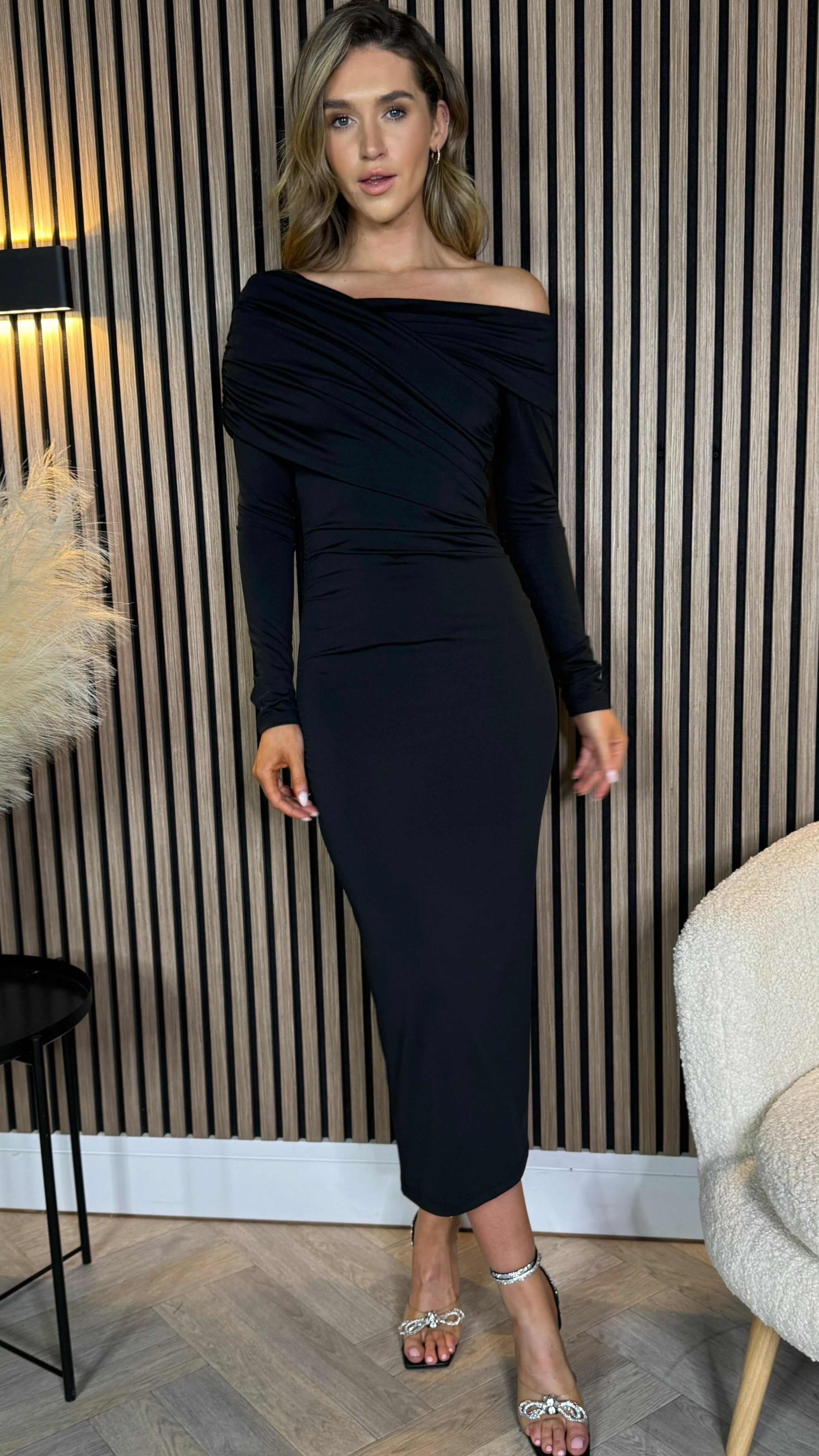 Sheridan Black Off Shoulder Wrap Effect Midi Dress