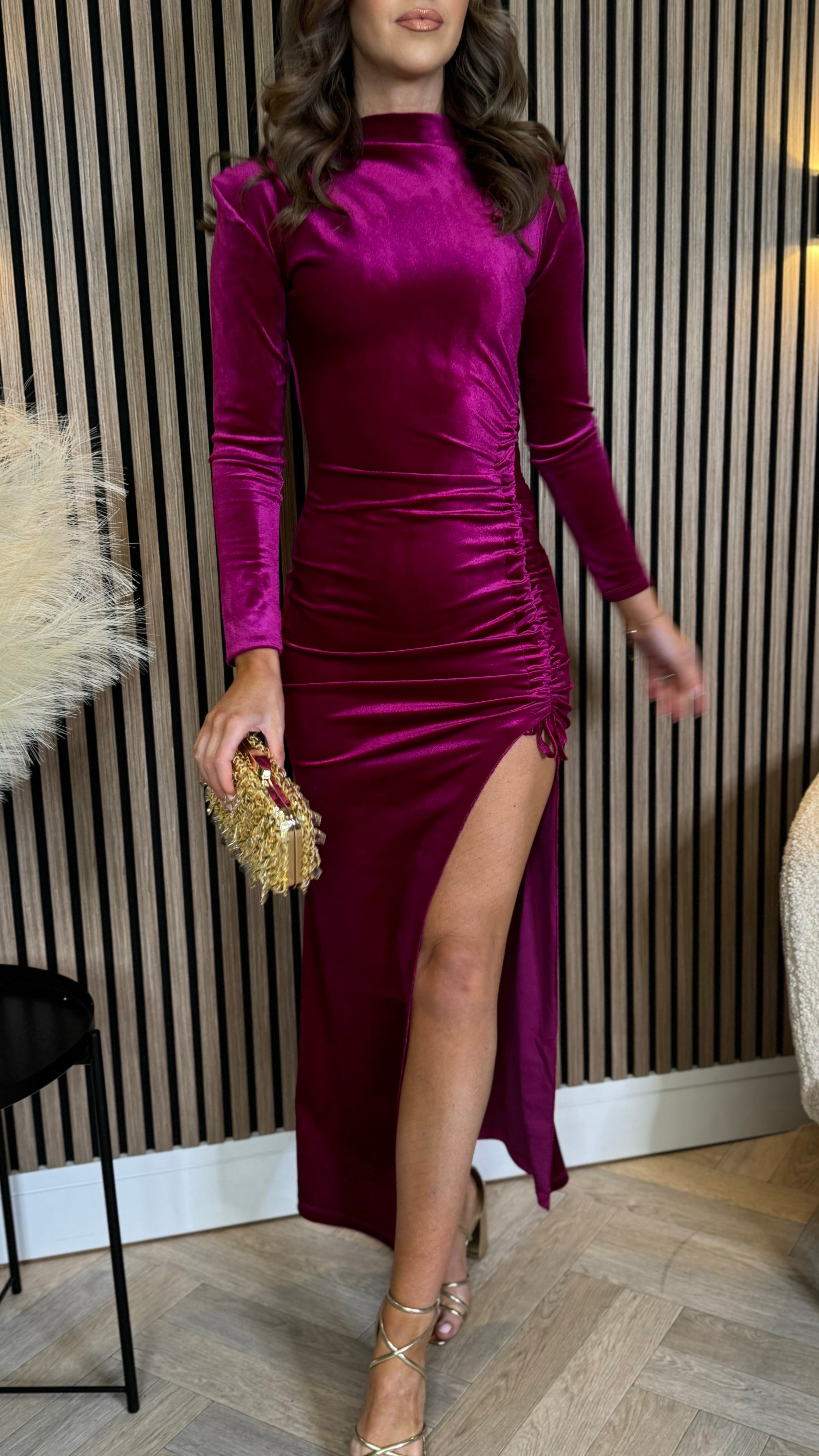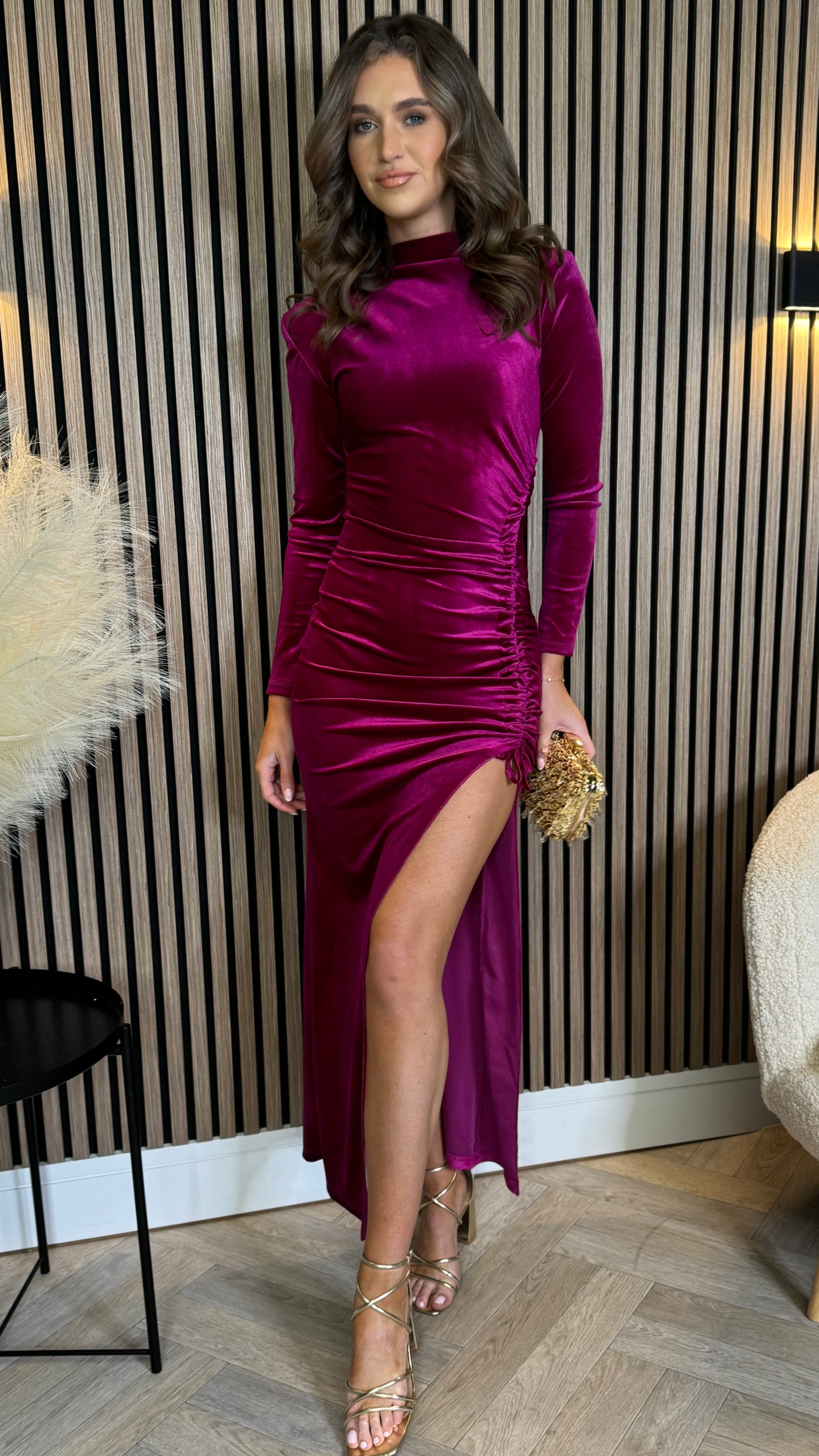 Sibyl Fuchsia High Neck Velvet Ruched Tie Detail Midi Dress