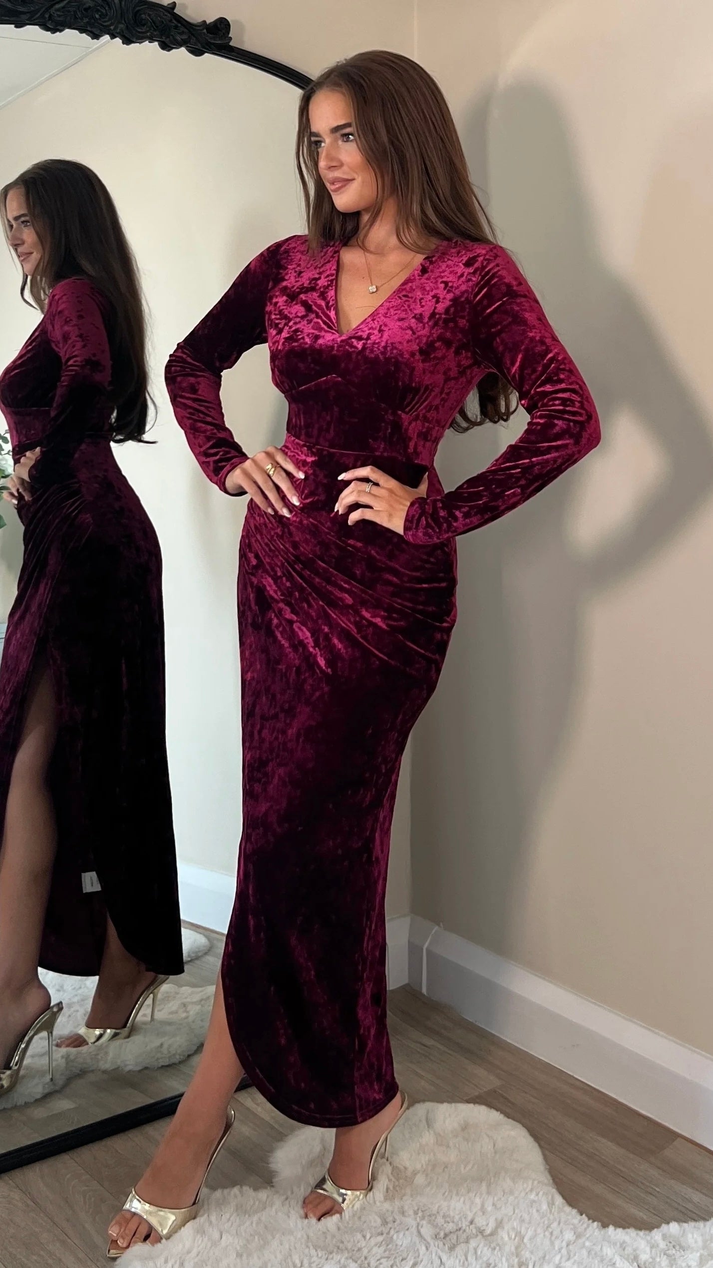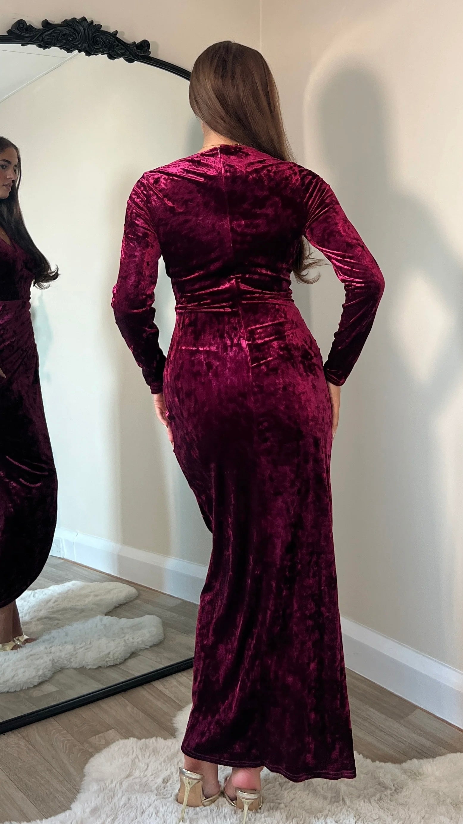 Sigourney Burgundy Velvet Asymmetric Wrap Midi Dress