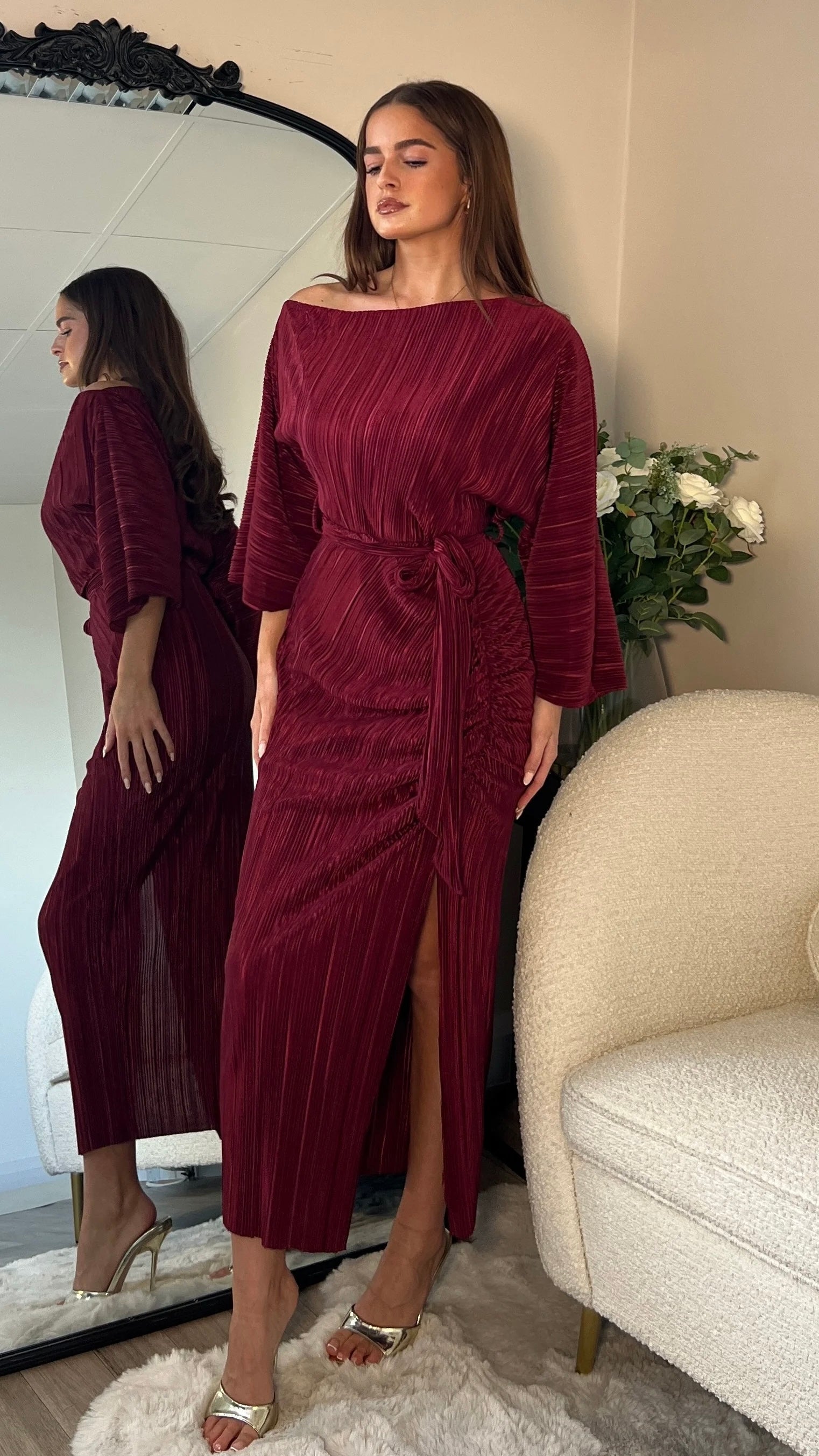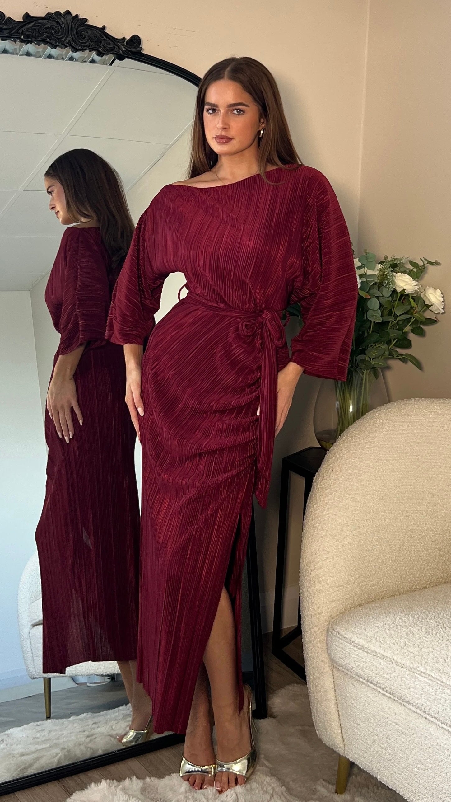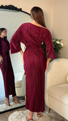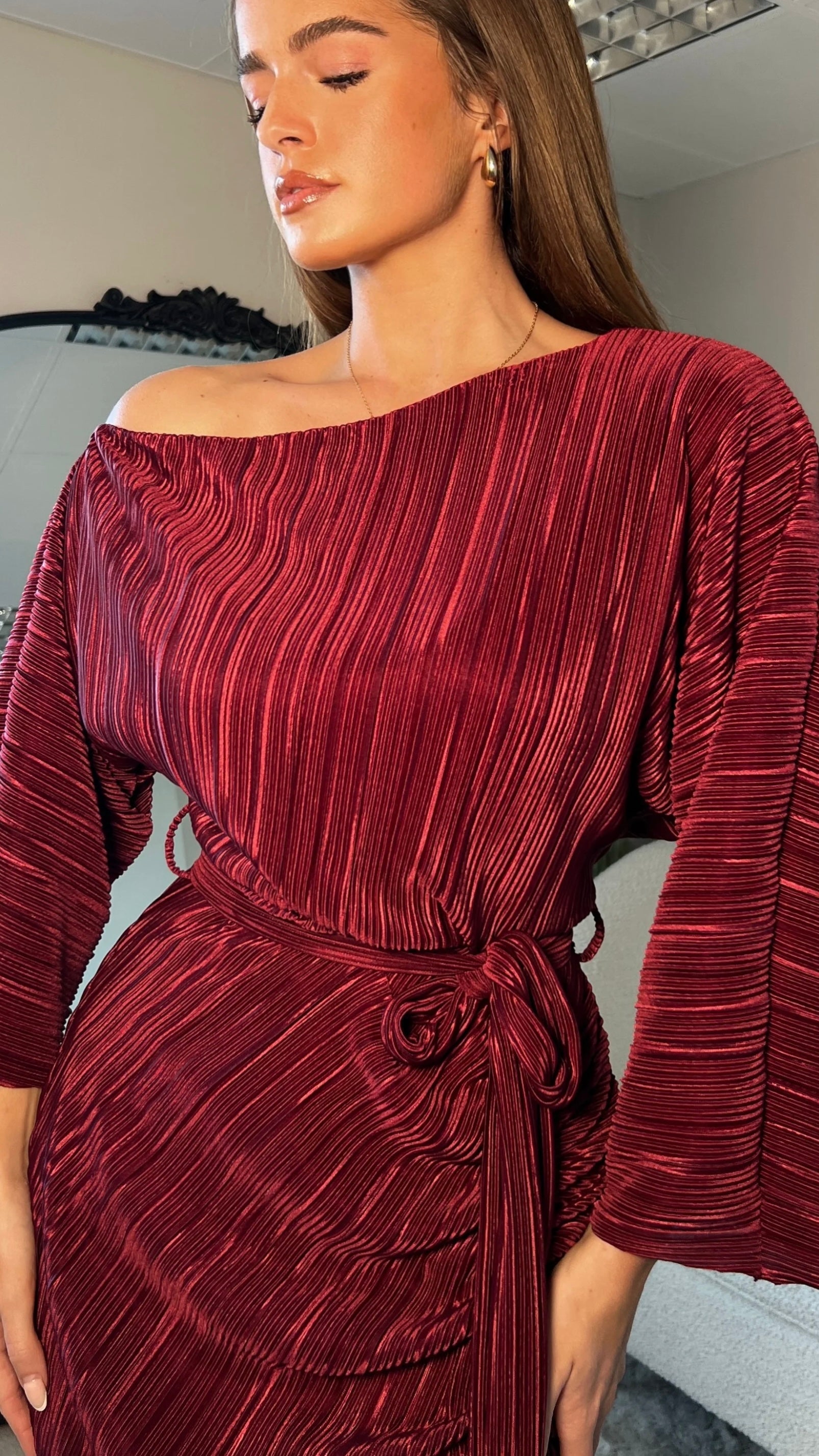 Unabelle Burgundy Plisse Off-Shoulder Dress (PRE-ORDER)