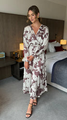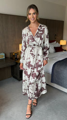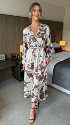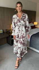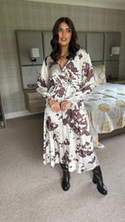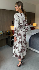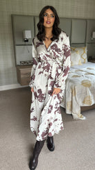 The Winona Cream & Brown Satin Cow Print Long Sleeve Tie Detail Midi Dress blends smooth satin fabric with a fun cow print pattern. The tie detail at the waist enhances your natural shape comfortably, while the long sleeves add a touch of warmth and style. This dress supports you in feeling confident and chic for any occasion, making it a delightful addition to your wardrobe 🌟.
