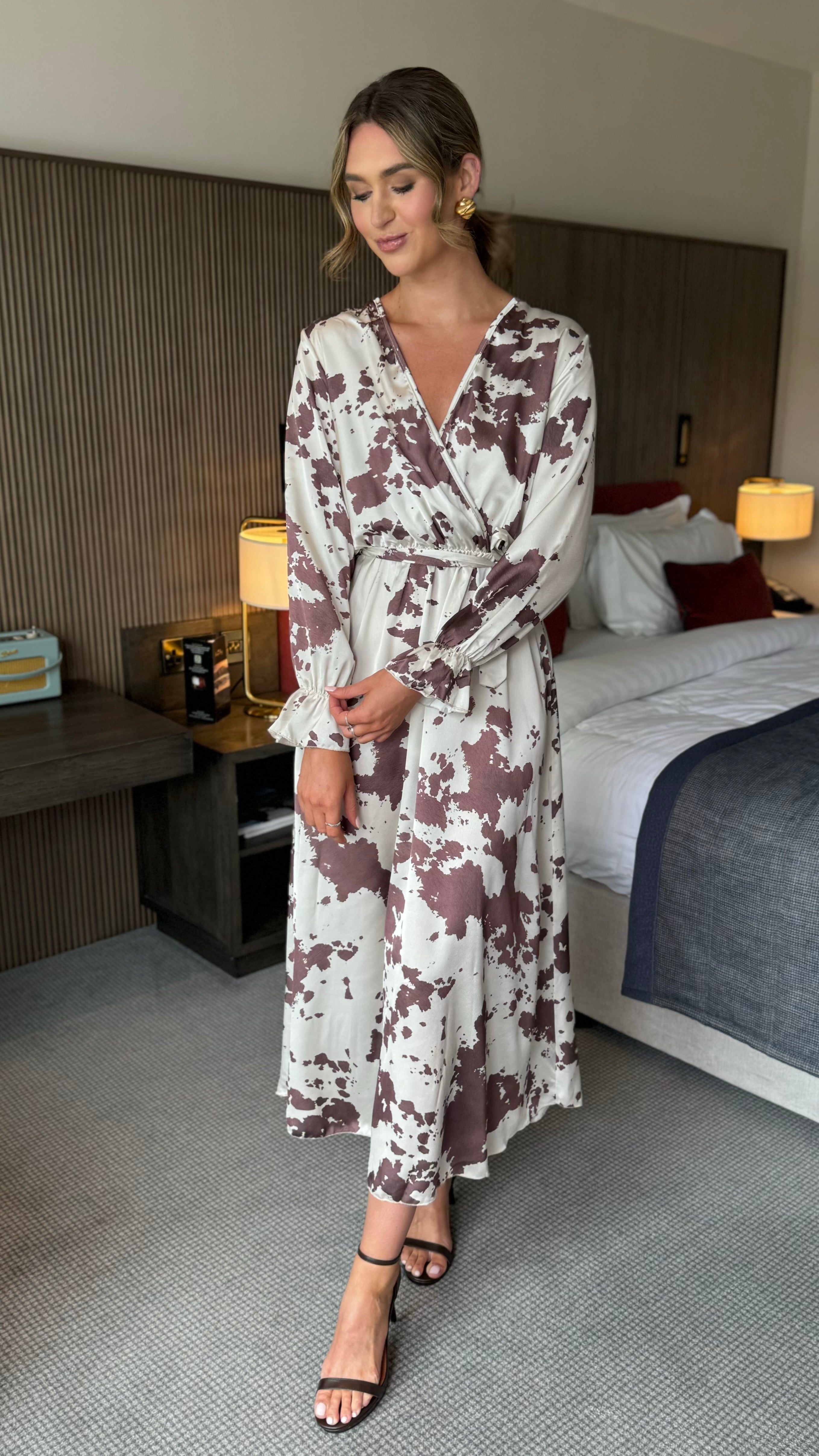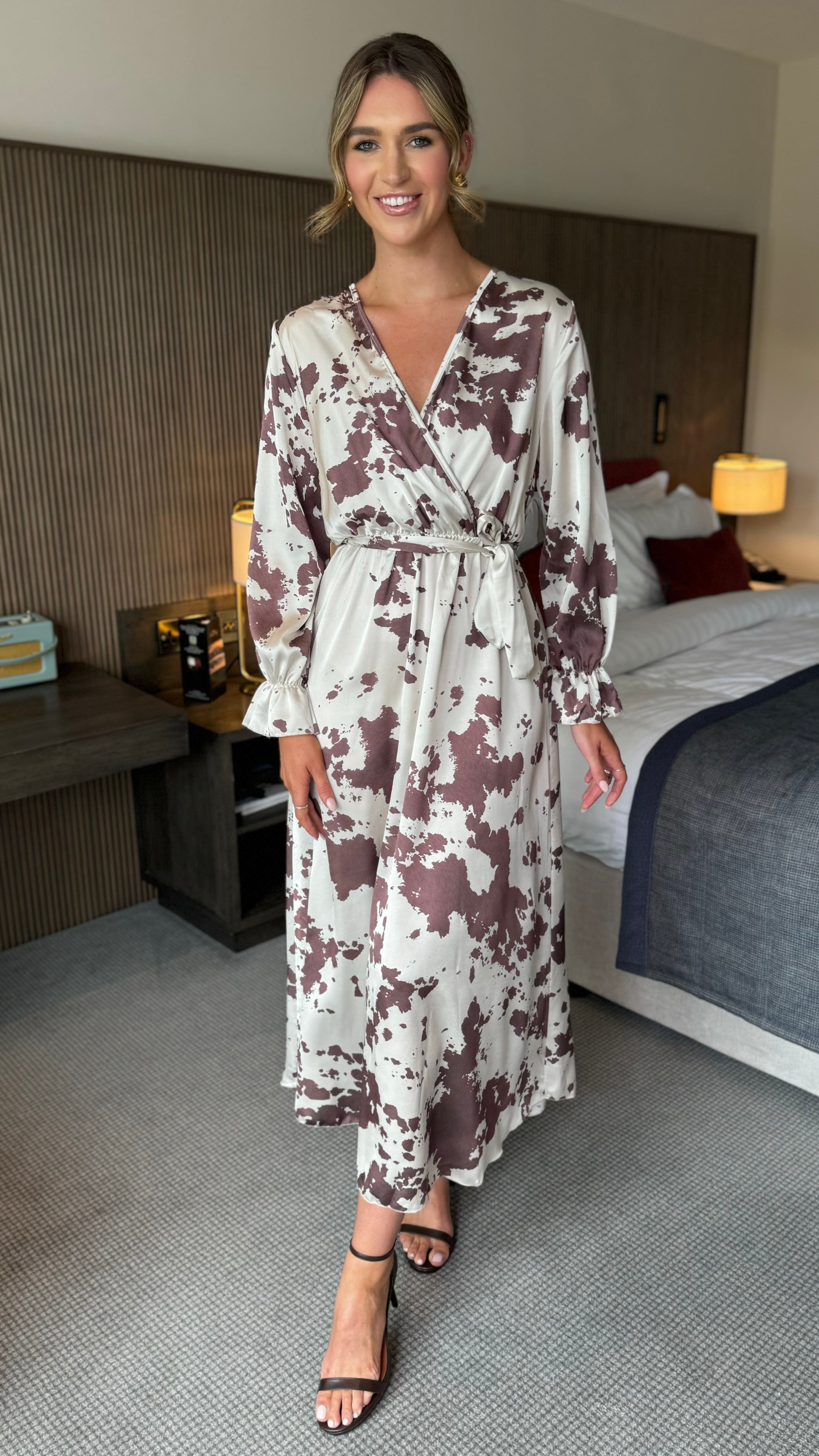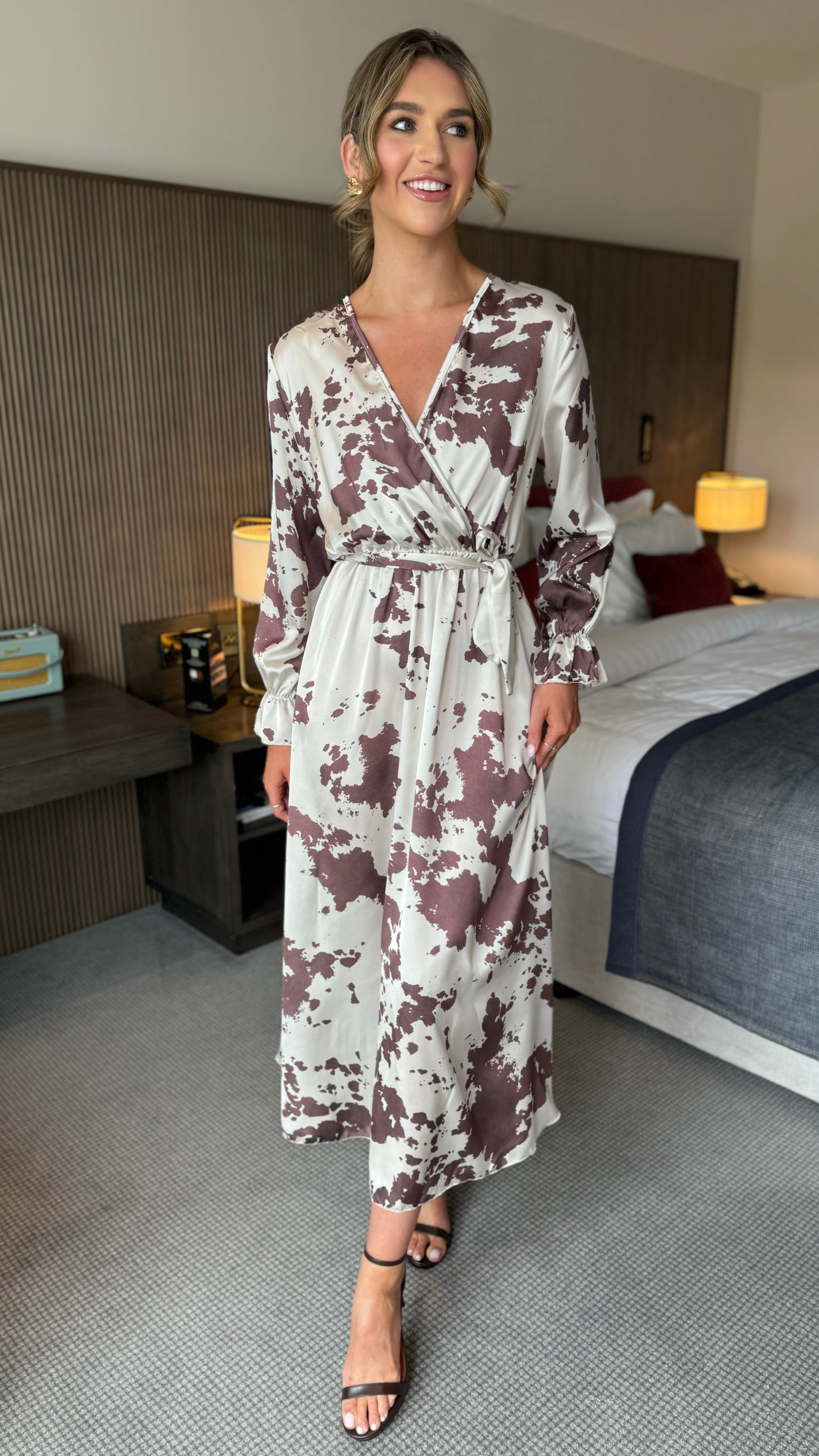 Winona Cream & Brown Satin Cow Print Long Sleeve Tie Detail Midi Dress