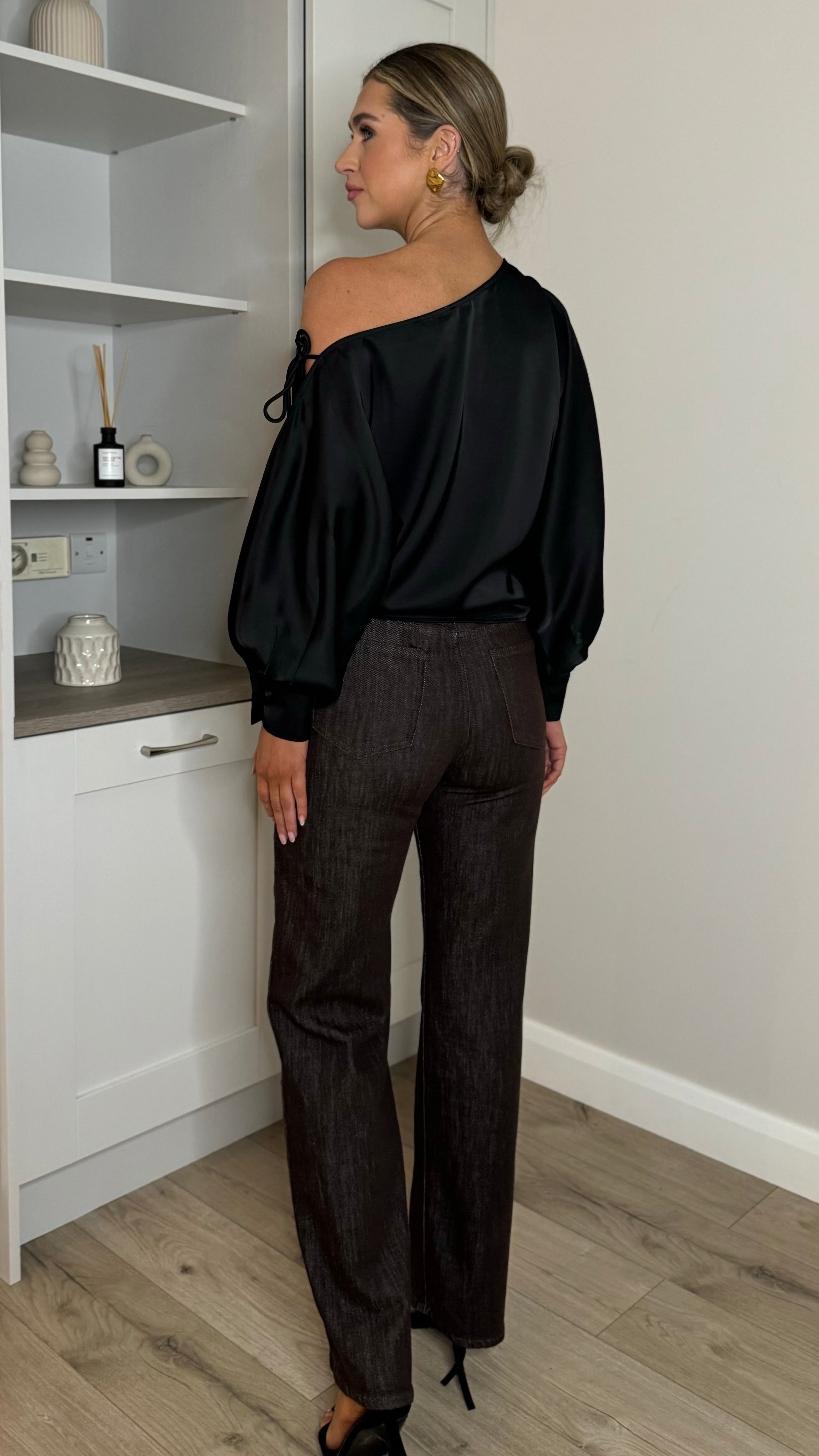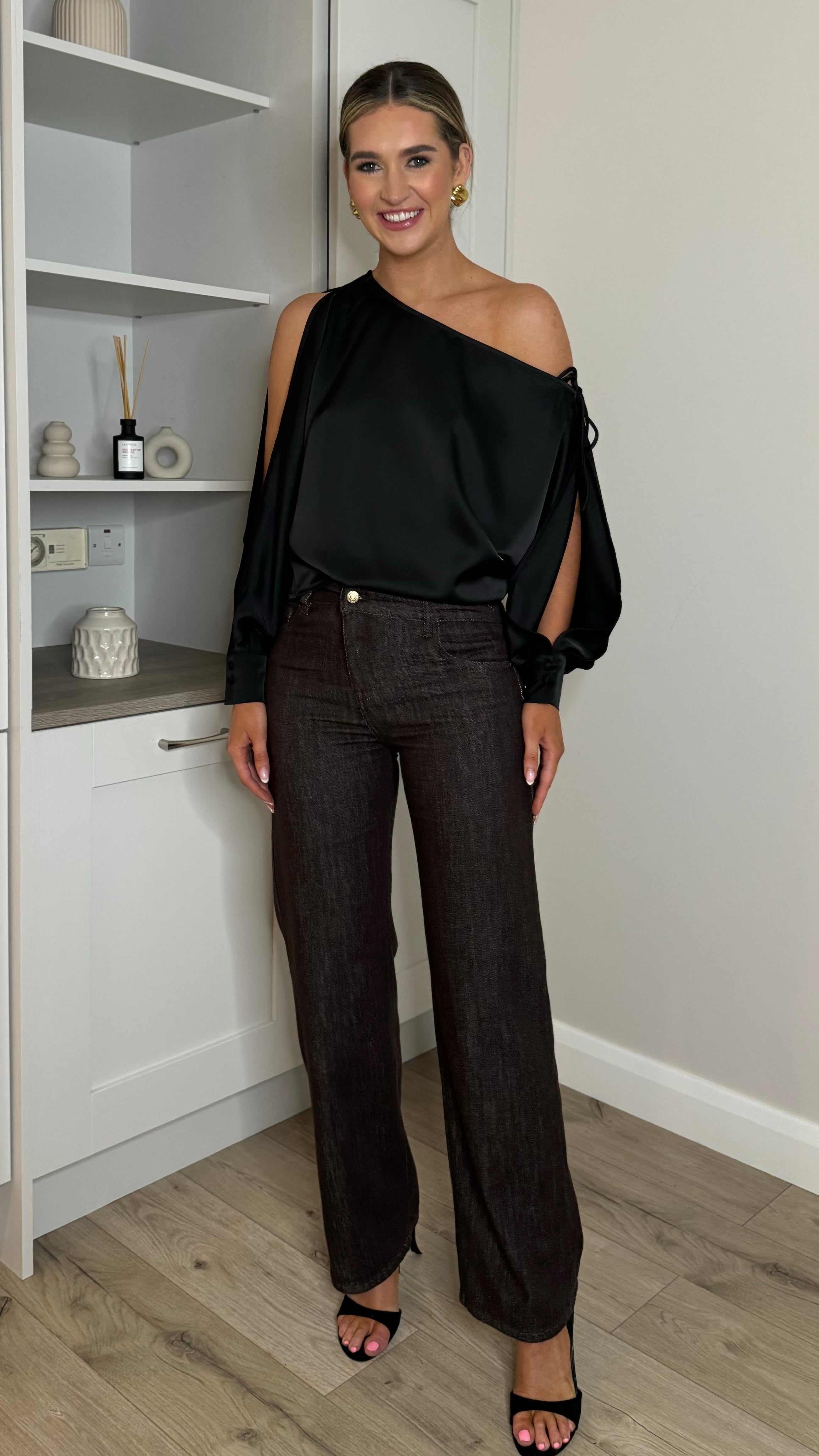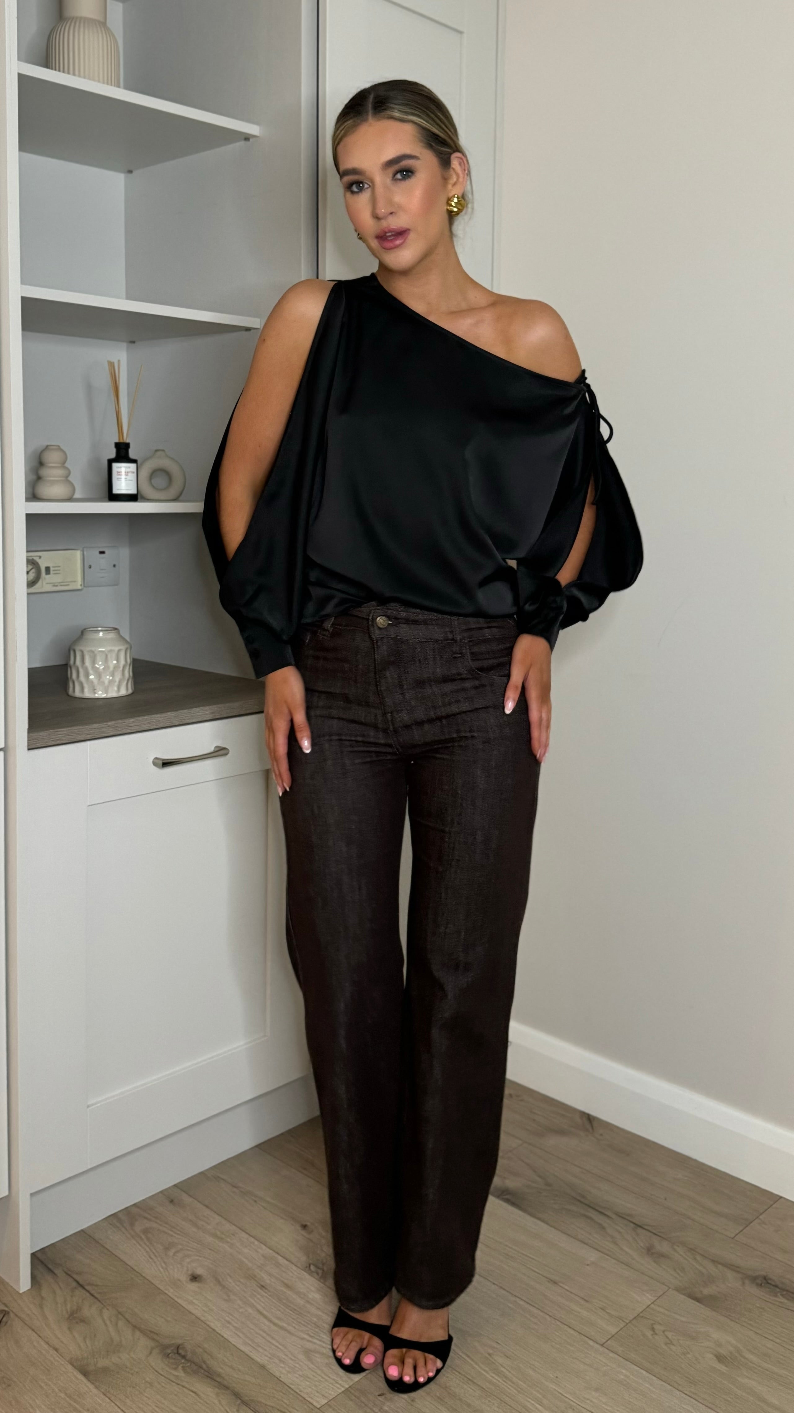Turn heads in the Billie Black Asymmetric Long Sleeve Top! Showcasing open sleeves and the perfect balance of one shoulder and one tie detail shoulder, this top adds an edgy twist to any ensemble. Complete with cuffed sleeves, it's the ultimate blend of style and practicality.