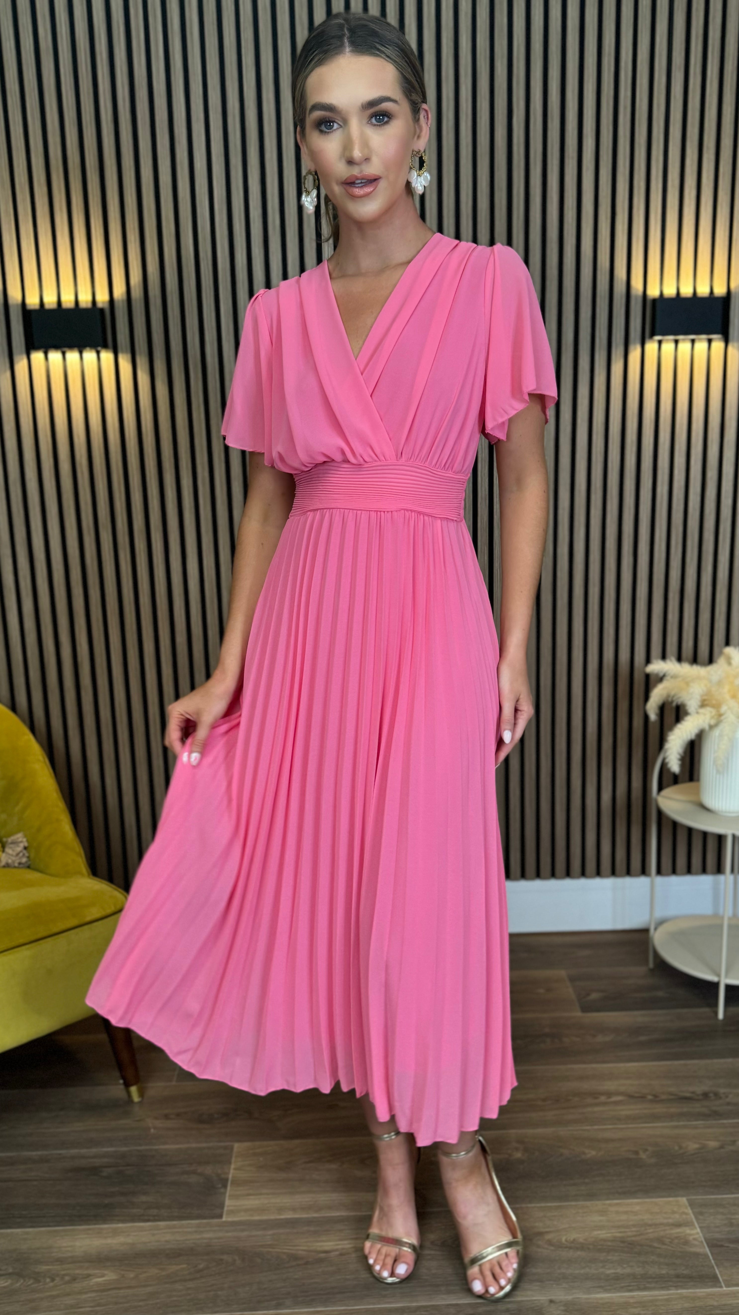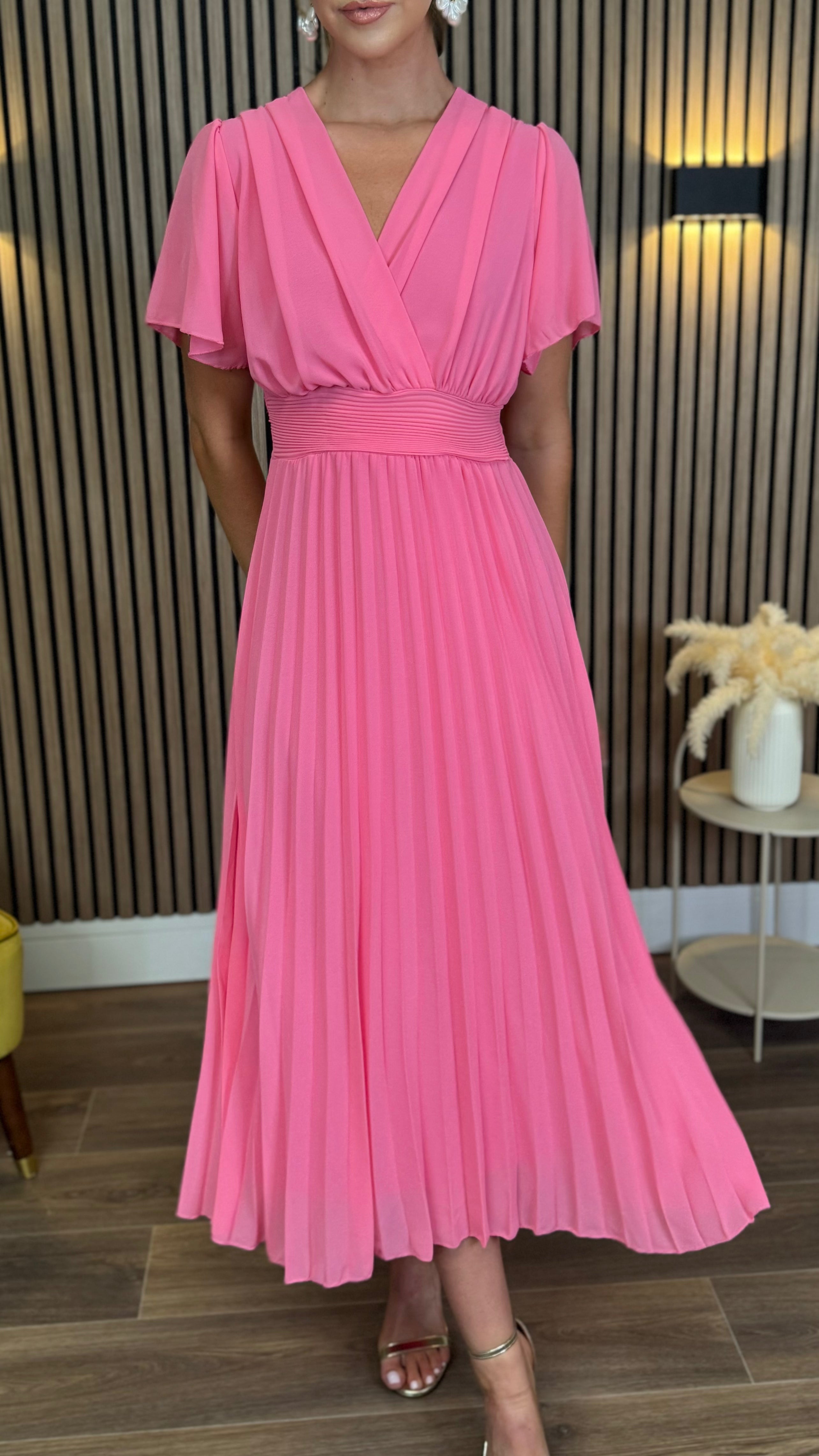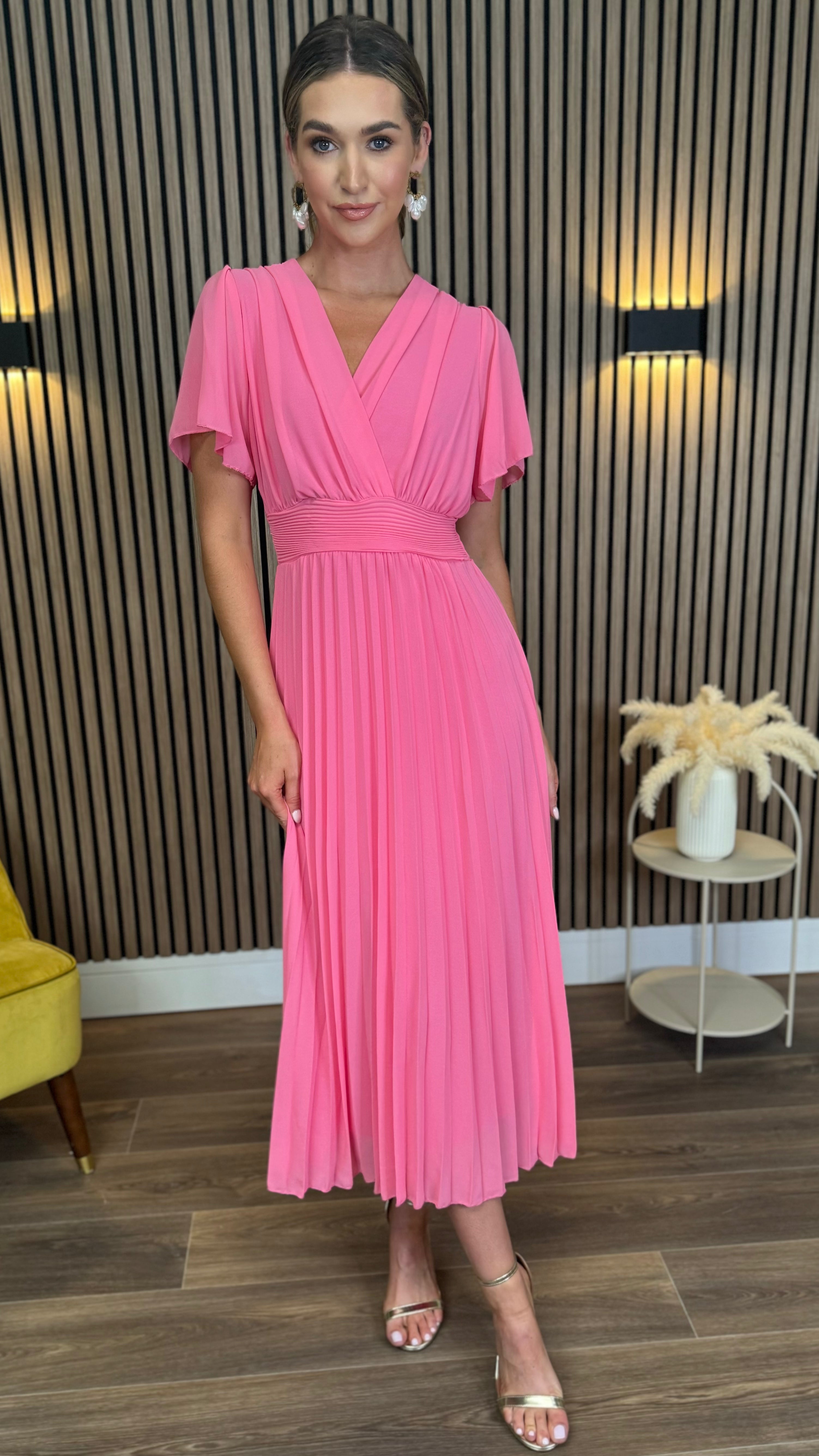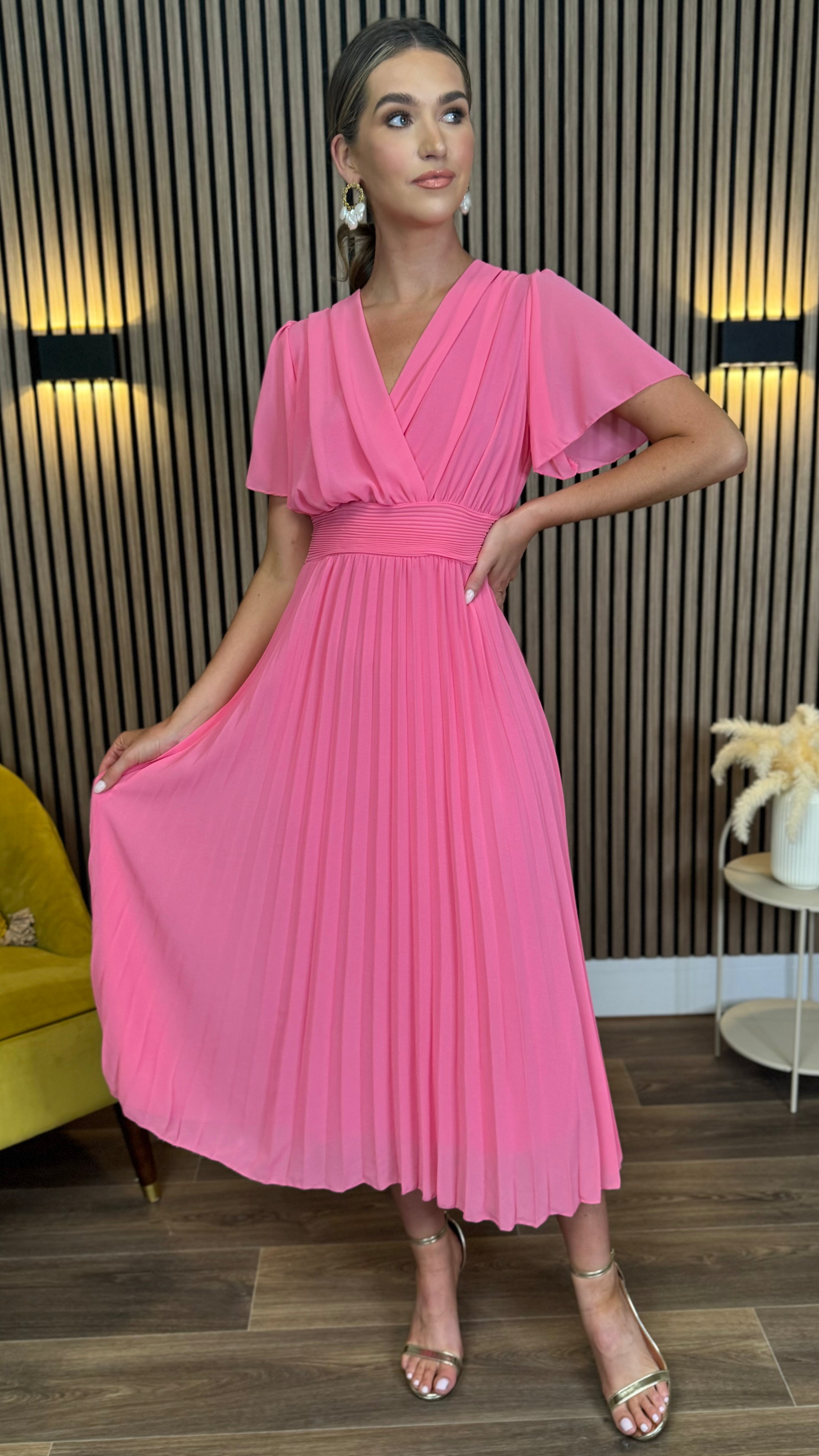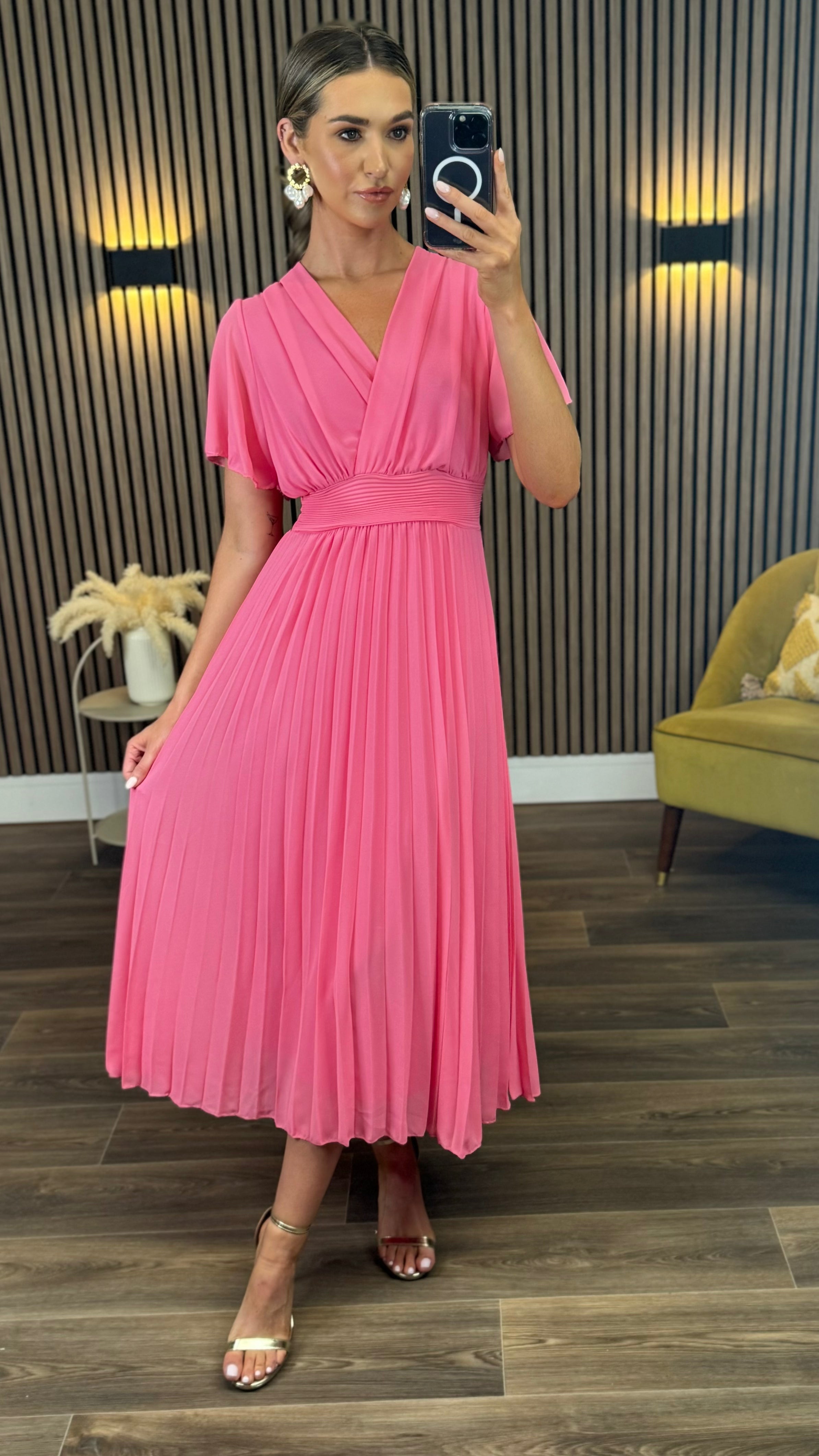 Get ready to make a statement in our Wavery Pink Pleated V Neck Midi Dress. Featuring a unique pleated design and a playful v neck, this dress will add a touch of quirkiness to your wardrobe. Perfect for any occasion, this dress will have you feeling confident and stylish!