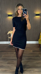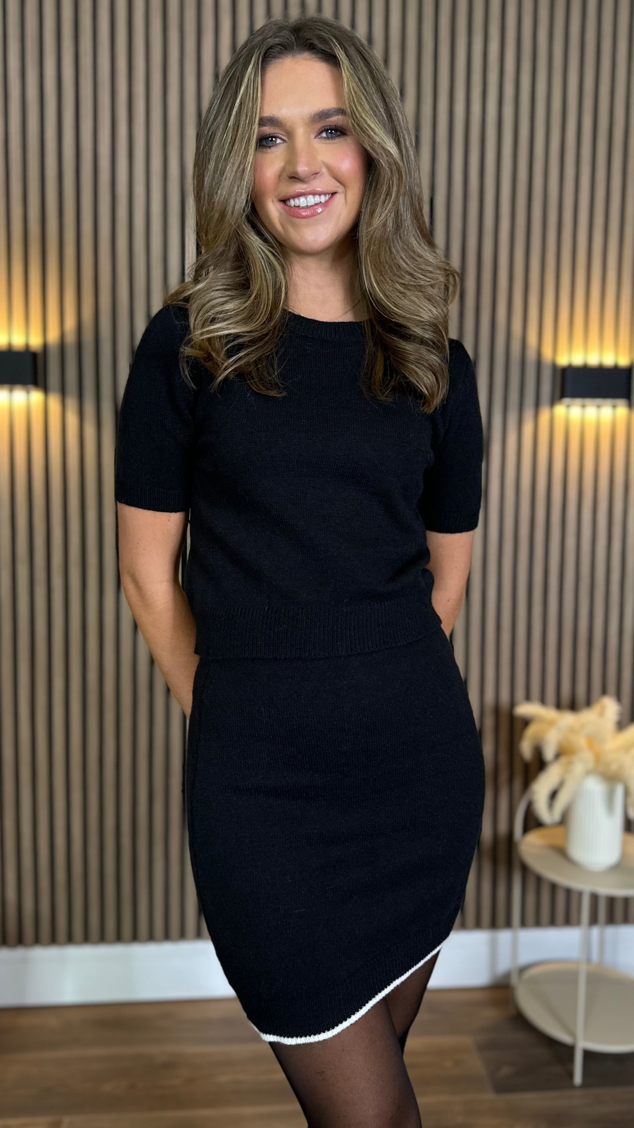 Get ready to turn heads with the Mollie Black Knit Co Ord! This stylish set includes a top and mini skirt, both featuring a trendy black and white trim and flattering round neckline. With its short sleeves and ribbed waist and hems, this co ord is perfect for a fun and flirty look!