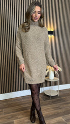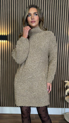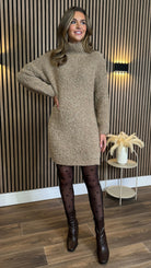 Stay cosy and stylish with our Sadie Taupe Chunky Knit Jumper Dress. Perfect for cooler days, this dress features a high neck for added warmth. Embrace the chunky knit trend and elevate your winter wardrobe with this must-have piece.