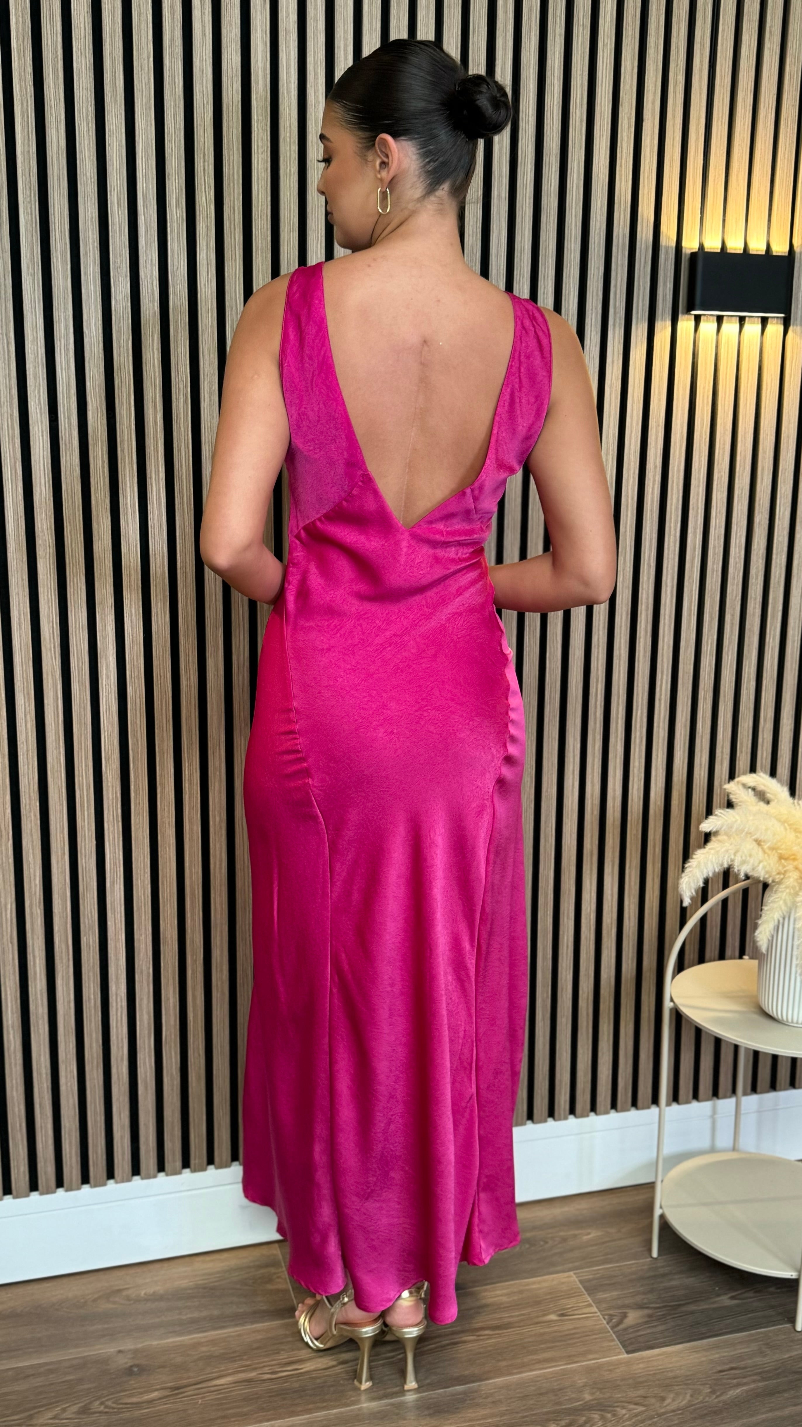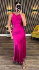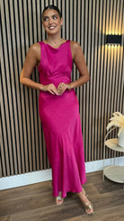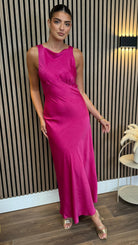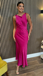 This refined Amber Fuchsia midi dress presents a classic round neckline complemented by an elegant V-back design. The vibrant hue and flattering silhouette make it an impeccable choice for special occasions, from formal gatherings to celebratory events.