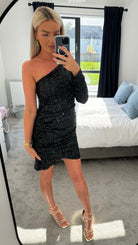 Make a statement in this dazzling Cheyene Black dress - featuring faux-wrap ruching, sequin sparkles, and a one-sleeve design for the ultimate mix of glam-meets-sexy! Ready for a night out? This dress is your new BFF. 💃
