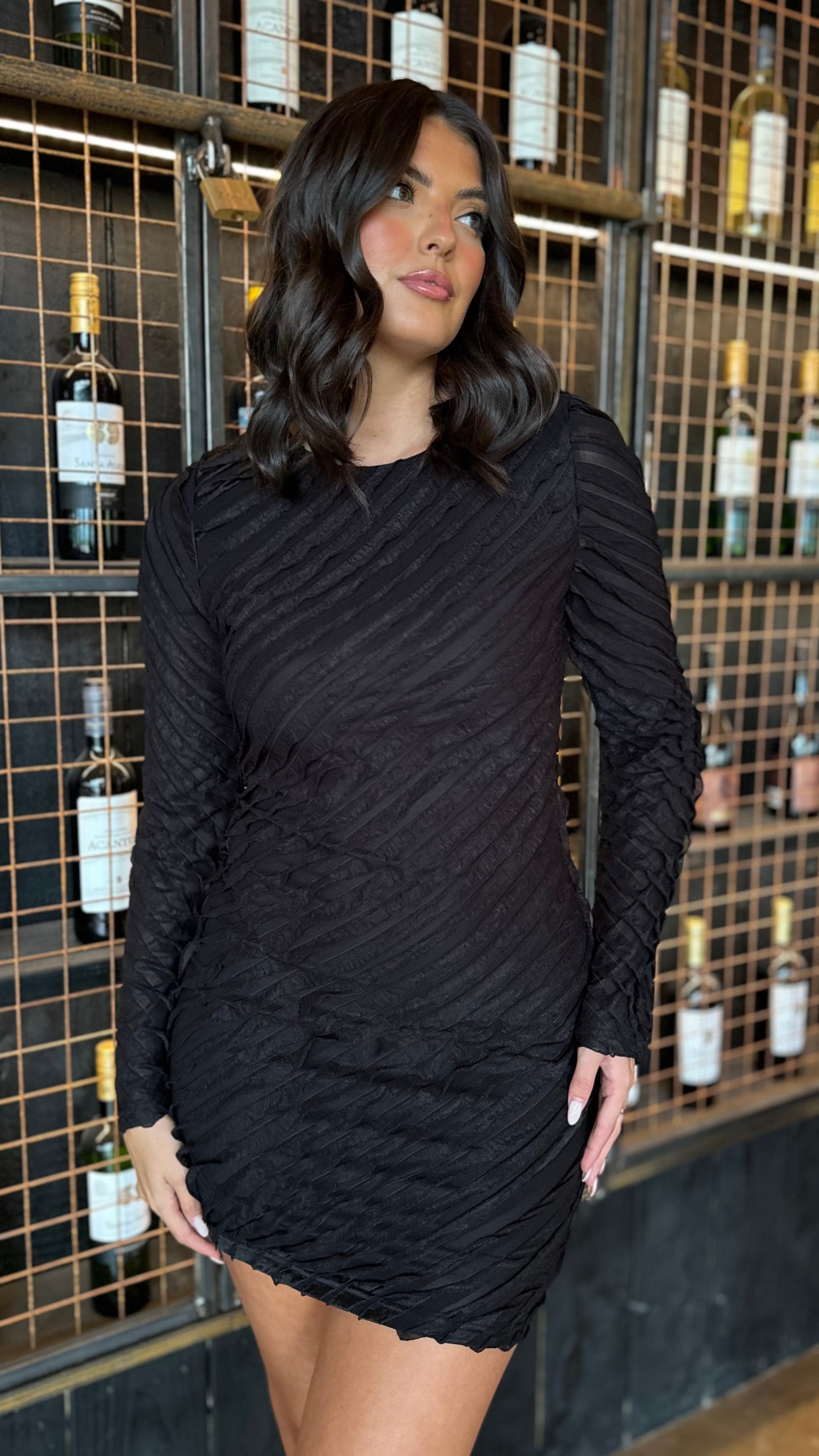 The Emersyn Black Textured Long Sleeve Mini Dress combines comfort and style with its soft textured fabric and flattering round neckline. Long sleeves provide subtle coverage while a keyhole button fastening adds a delicate touch of detail. Perfect for any occasion, this dress offers a confident fit that supports your every move.
