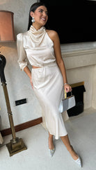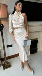 Step out in style with the Estella Beige High Neck One Sleeve Midi Dress! Featuring a satin finish, this dress adds a touch of glamour to any occasion. The elasticated waist provides a flattering silhouette, while the cut out side detail adds a unique and playful touch. Transform your look with this versatile and chic dress.