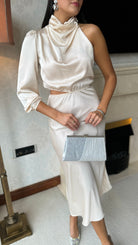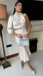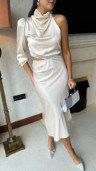 Estella Beige High Neck One Sleeve Midi Dress