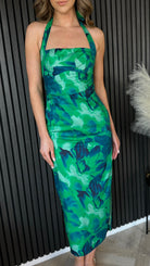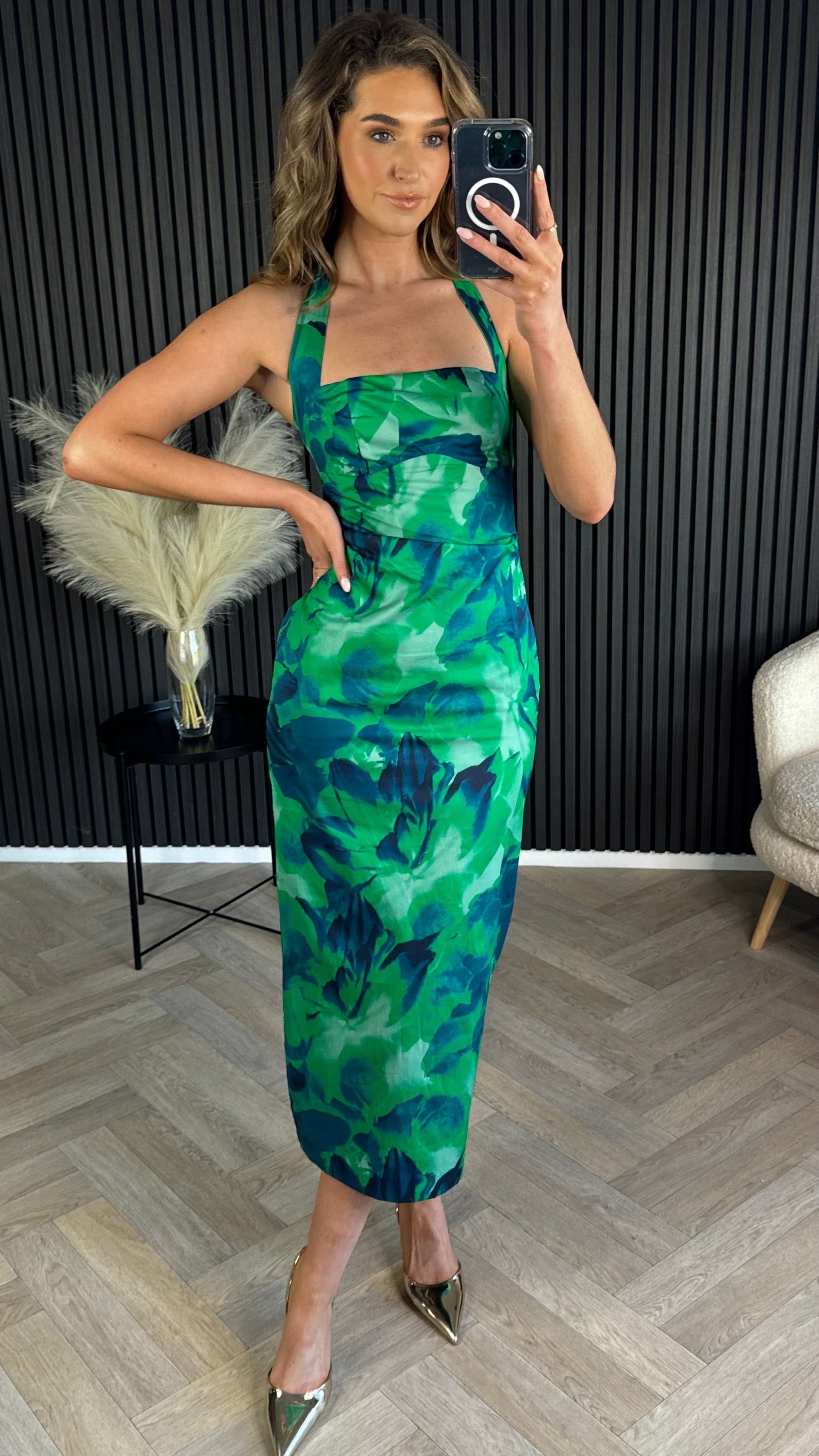 Gilly Green & Navy Floral Printed Halter Neck Midi Dress