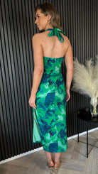 Make a statement in our Gilly Green & Navy Floral Printed Halter Neck Midi Dress! Featuring a playful side split and alluring backless detail, this dress is perfect for any occasion. Stand out in style and confidence with this unique and eye-catching piece.