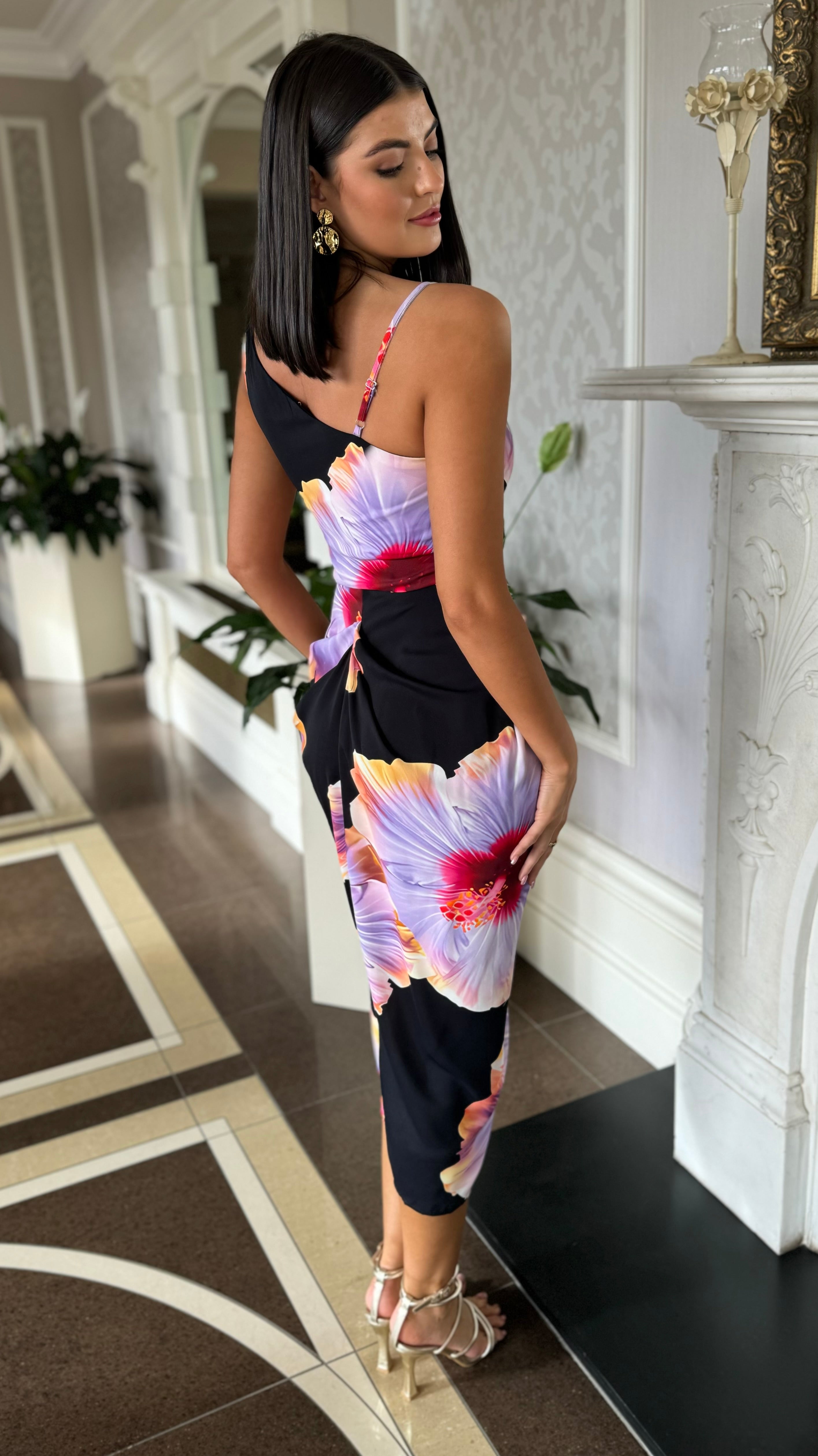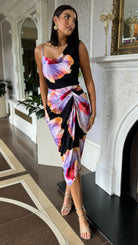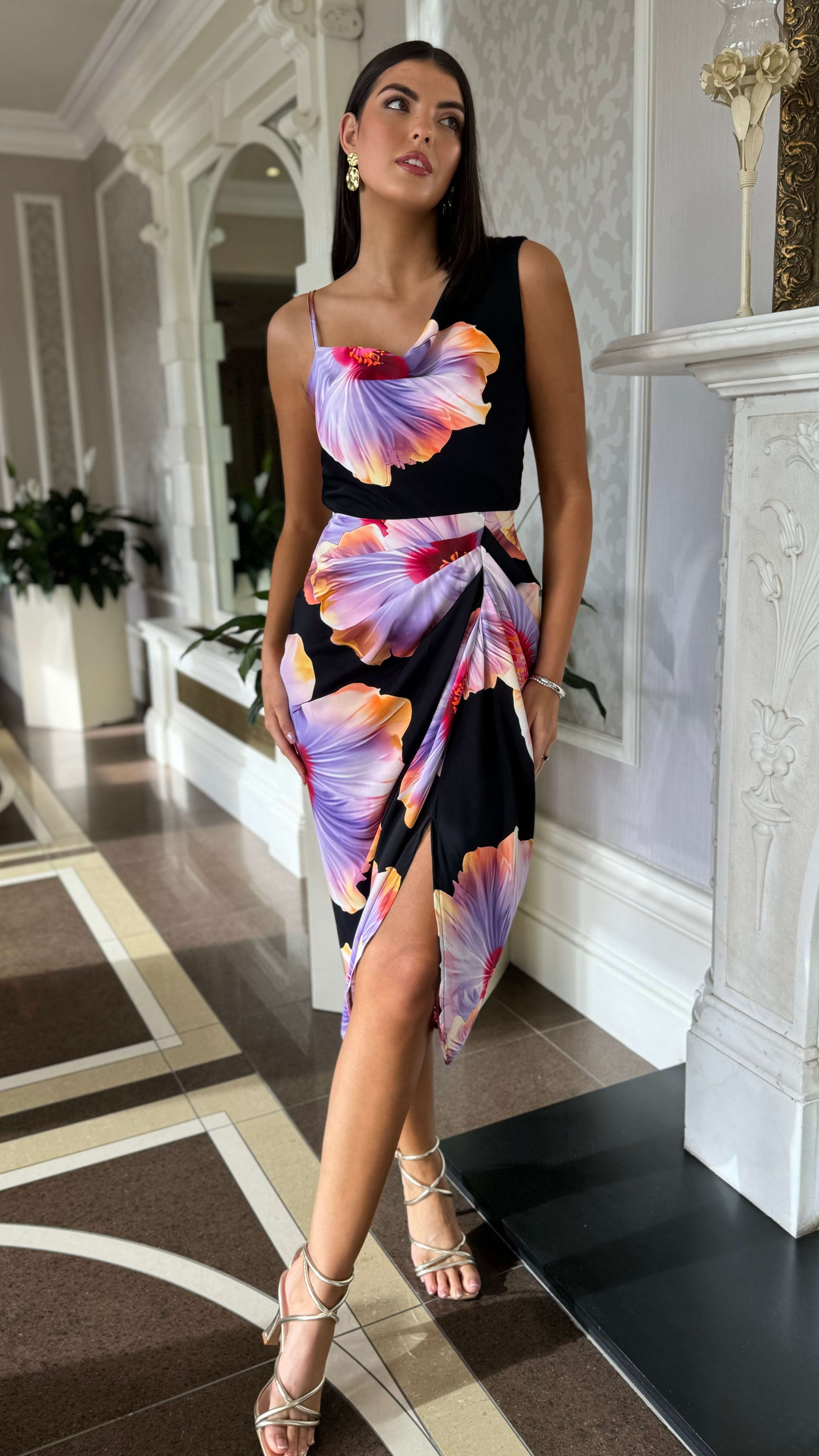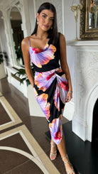Laken Black & Lilac Floral Print Strap Detail Gathered Skirt Midi Dress