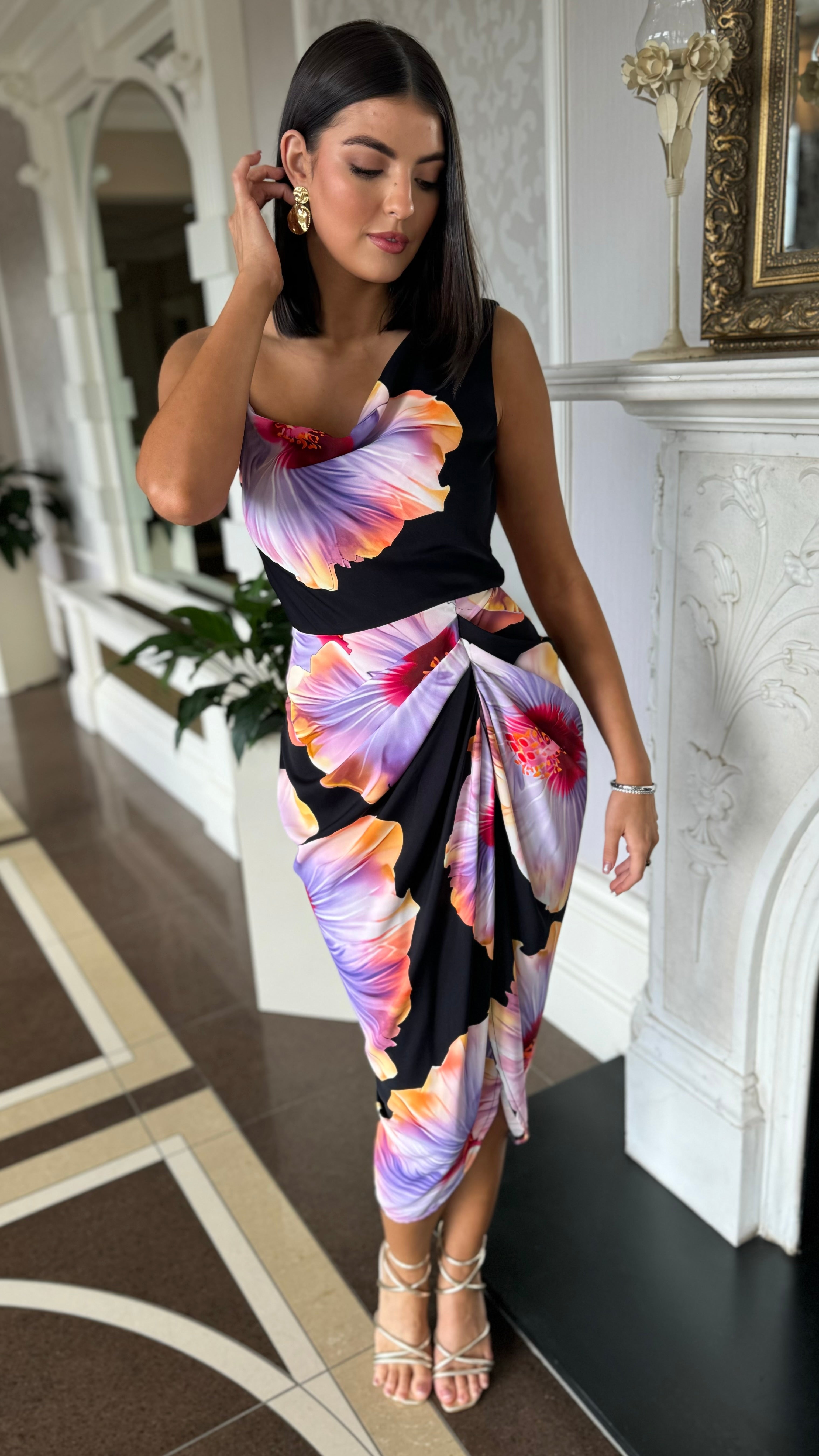 Expertly crafted with a chic floral print, our Laken Black & Lilac Midi Dress is the perfect addition to your wardrobe. With its one shoulder-like top and adjustable strap, cowl neckline, and side gathering on the midi skirt, this dress is both fashionable and functional. Elevate your style with some strappy heels and a coordinating bag for a flawless date night ensemble. 🌺