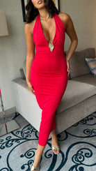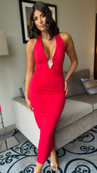 Magnolia Red Halterneck Gold Detail Midi Dress