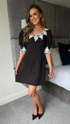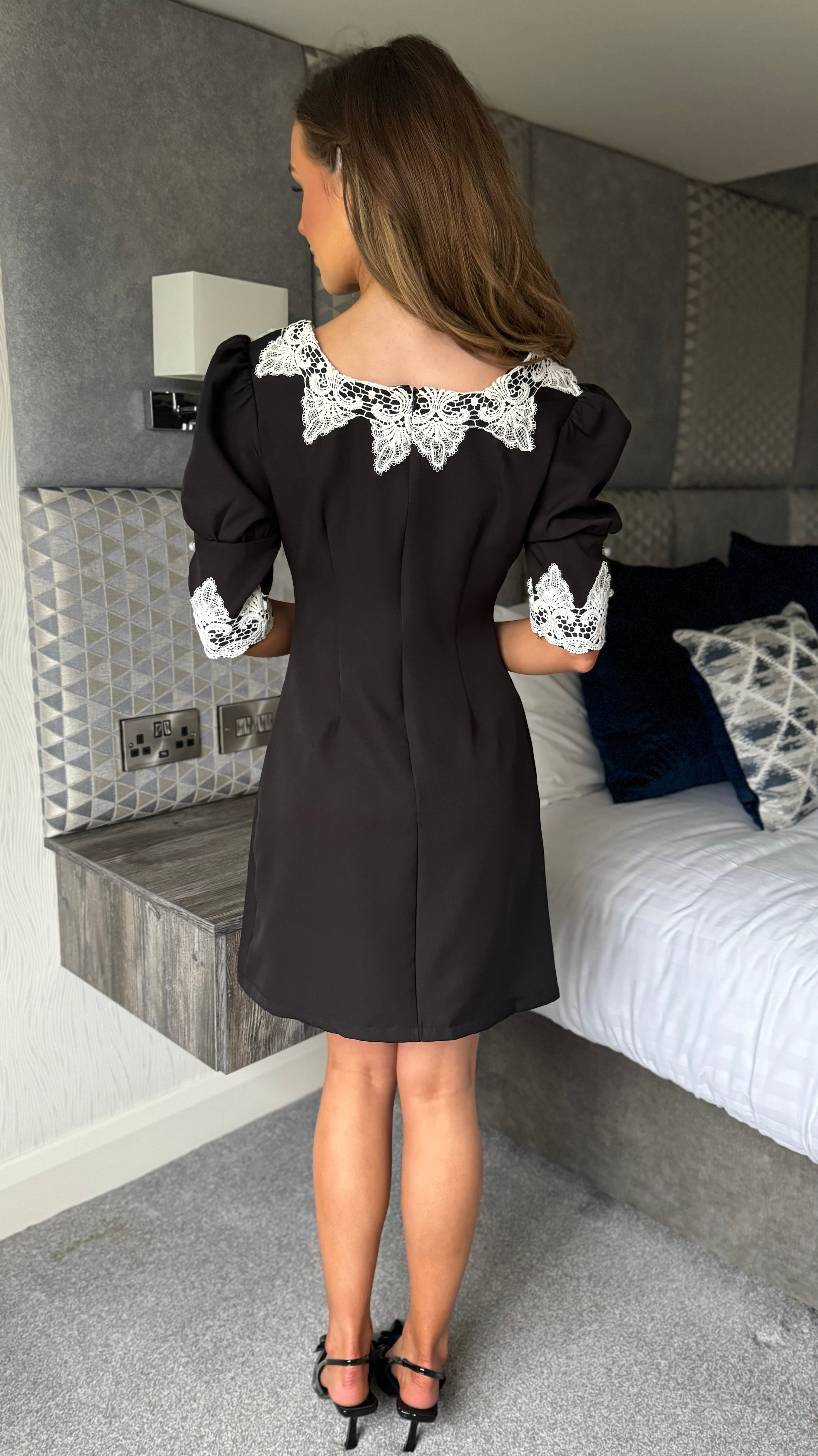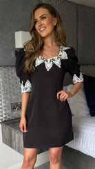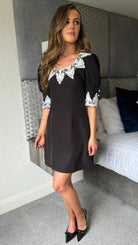 Flaunt your playful side with the Shakira Black Lace Trimmed Mini Dress. This dress features a round neckline and delicate lace trimming on the collar and sleeves, adding a touch of femininity. With pearl details on the sleeves, you'll be sure to turn heads wherever you go.