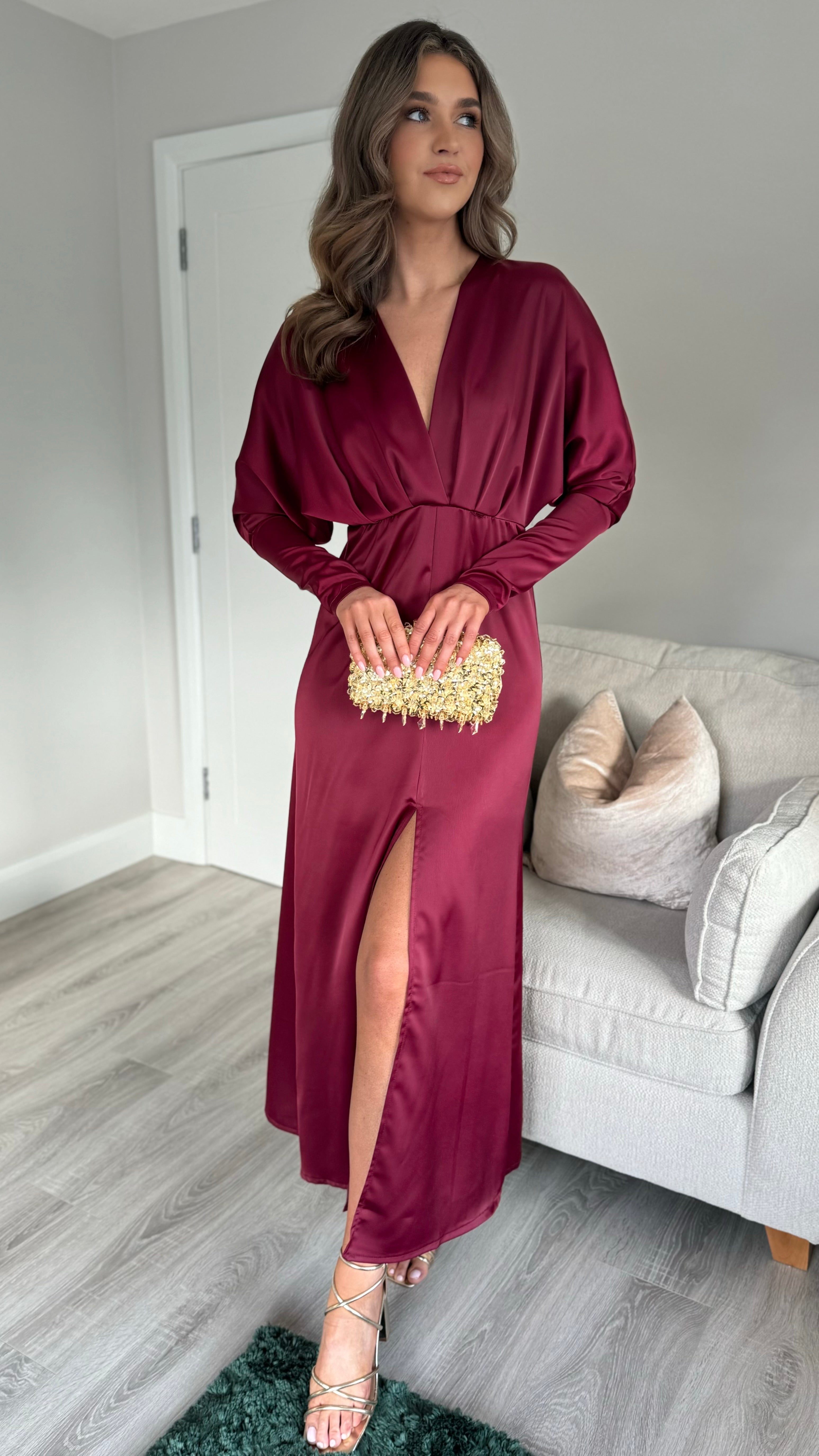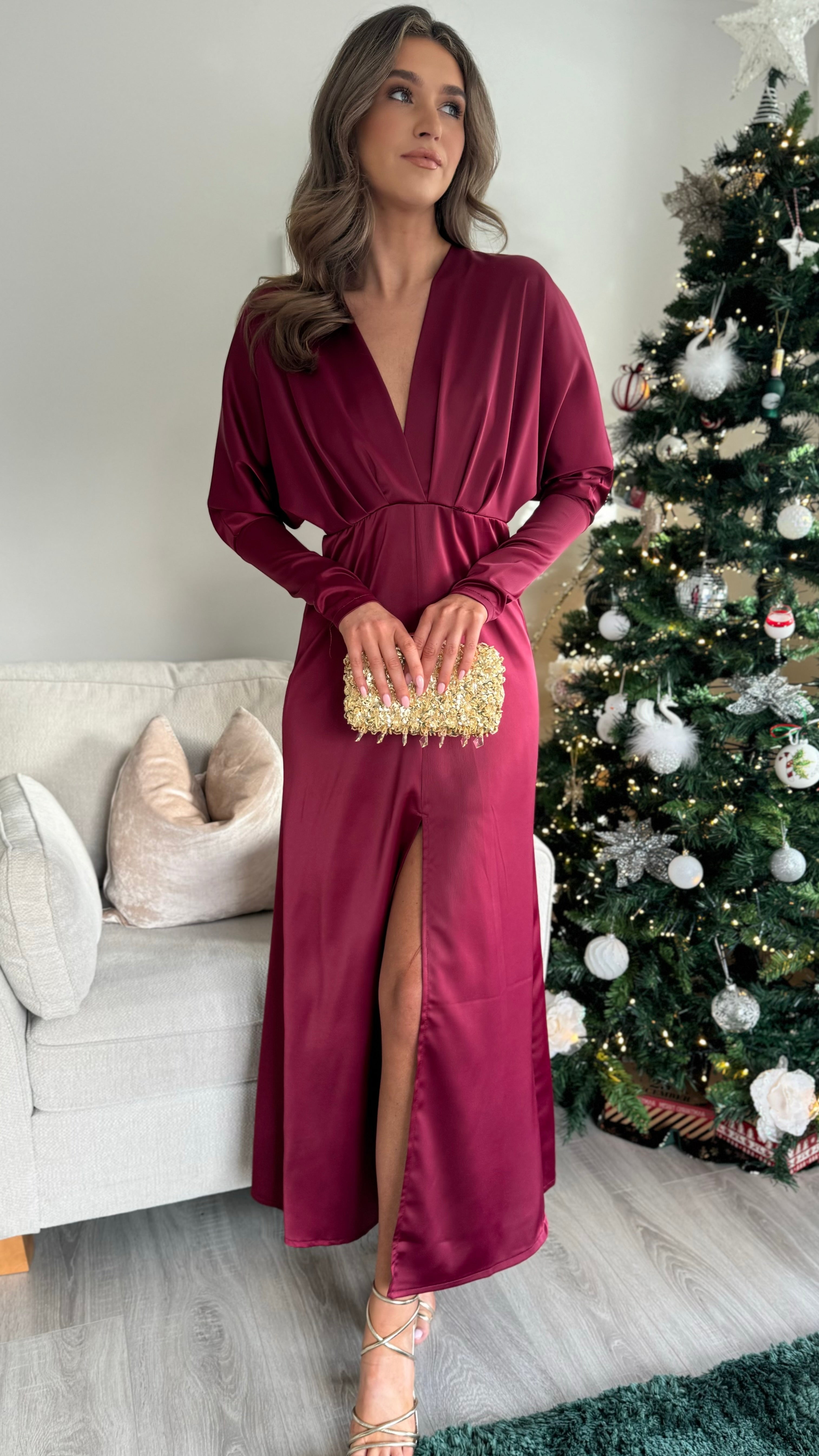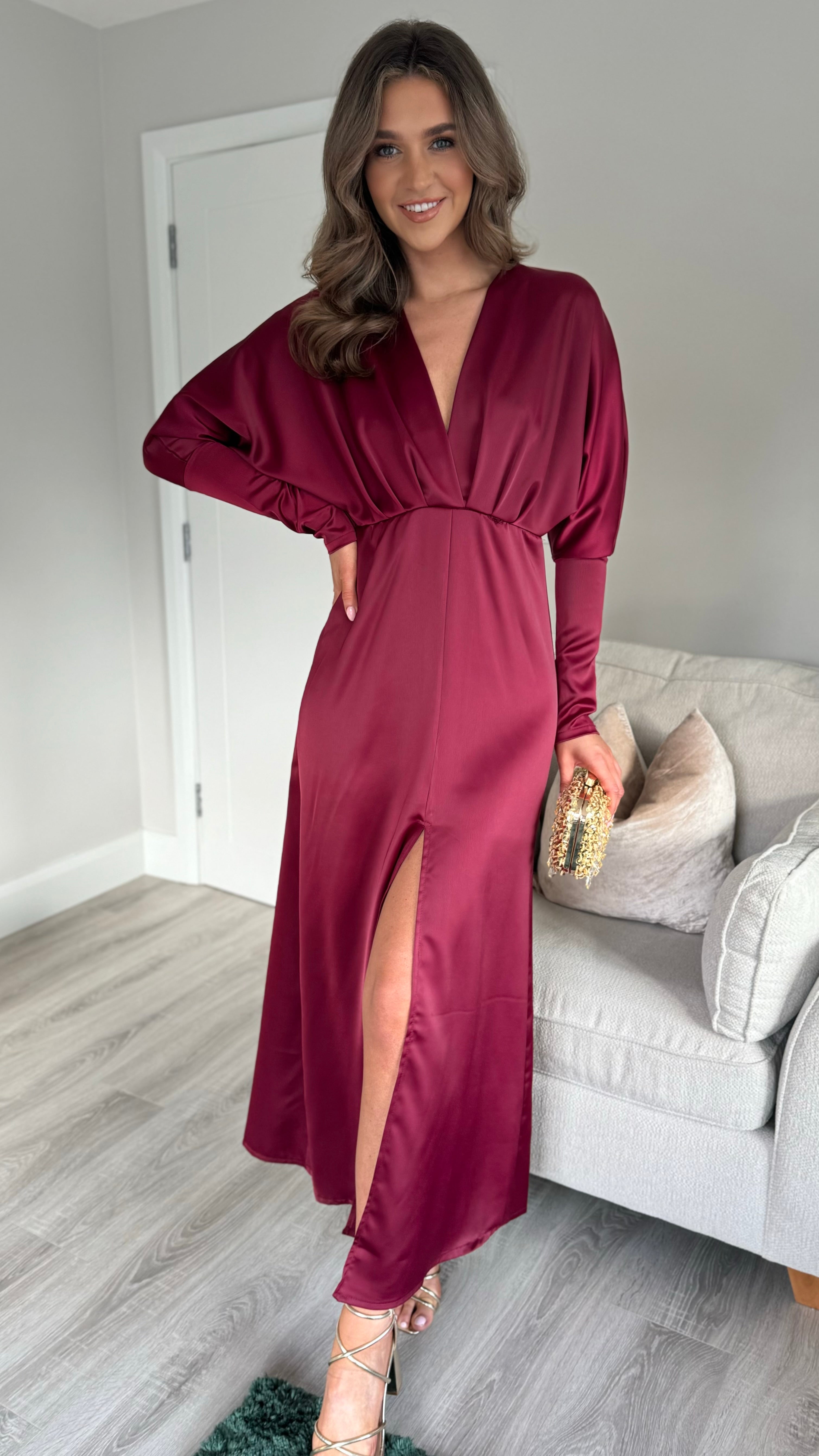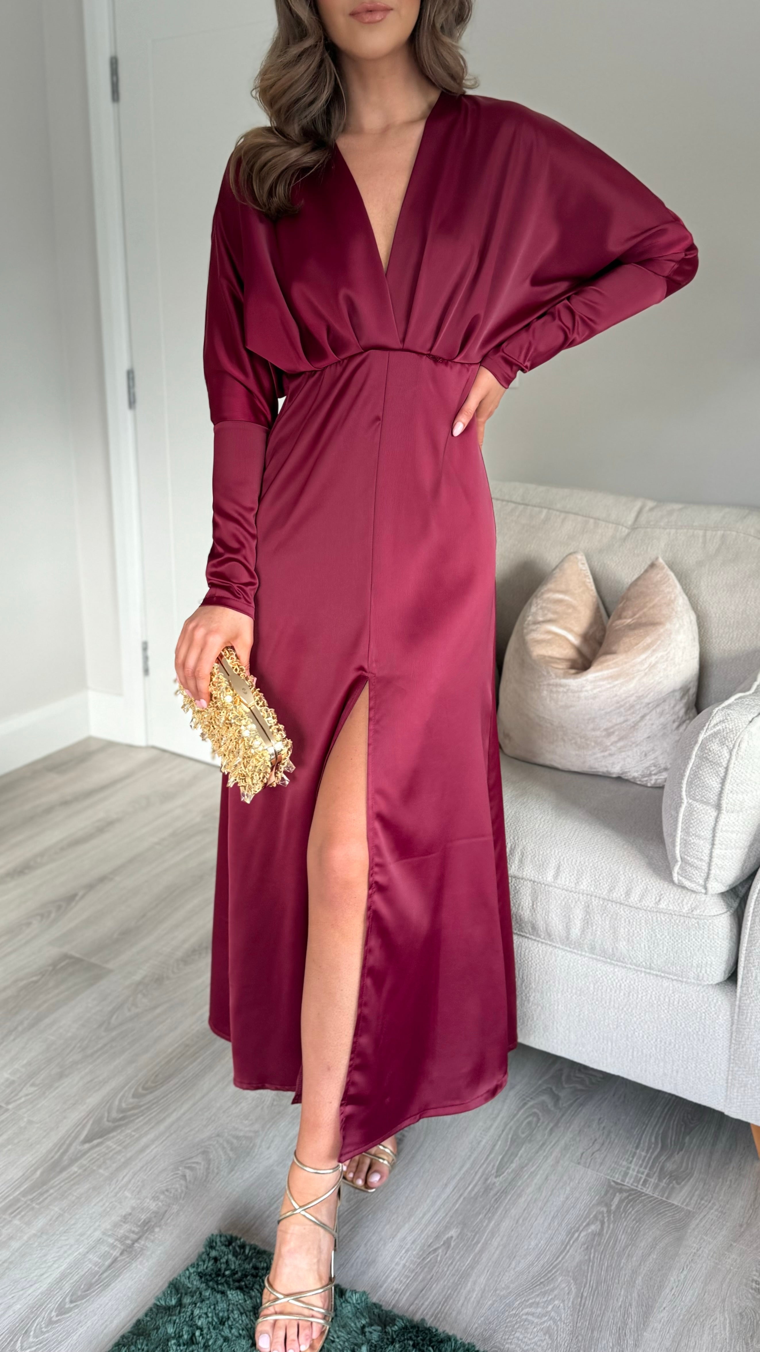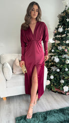 Introducing our Sienna Burgundy V Neck midi dress - the perfect combination of elegance and comfort. Featuring long sleeves tapered at the bottom, a flattering v neckline, and a front split for added style. The elasticated waist ensures a comfortable and flattering fit. Get ready to turn heads in this stunning dress!
