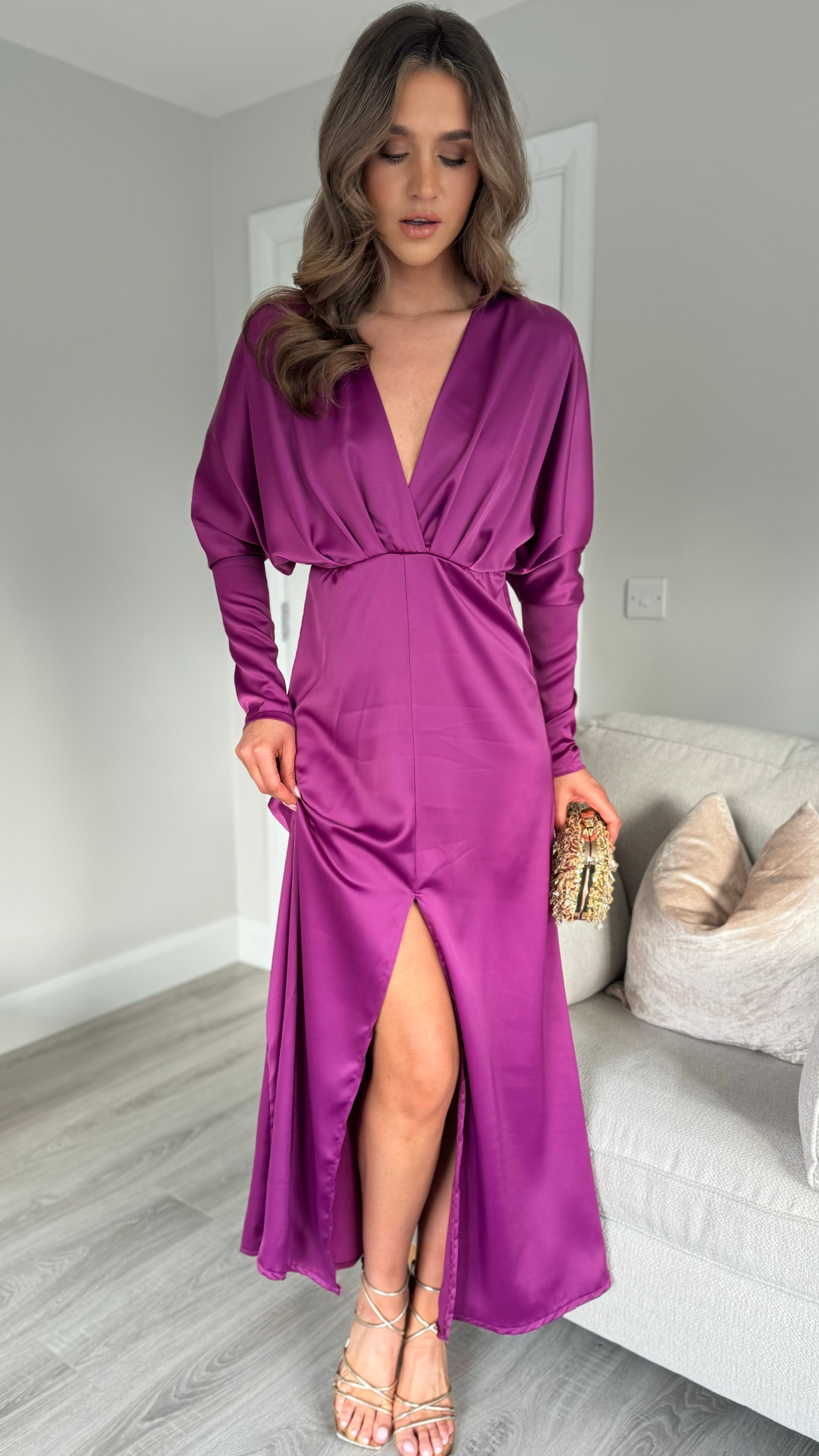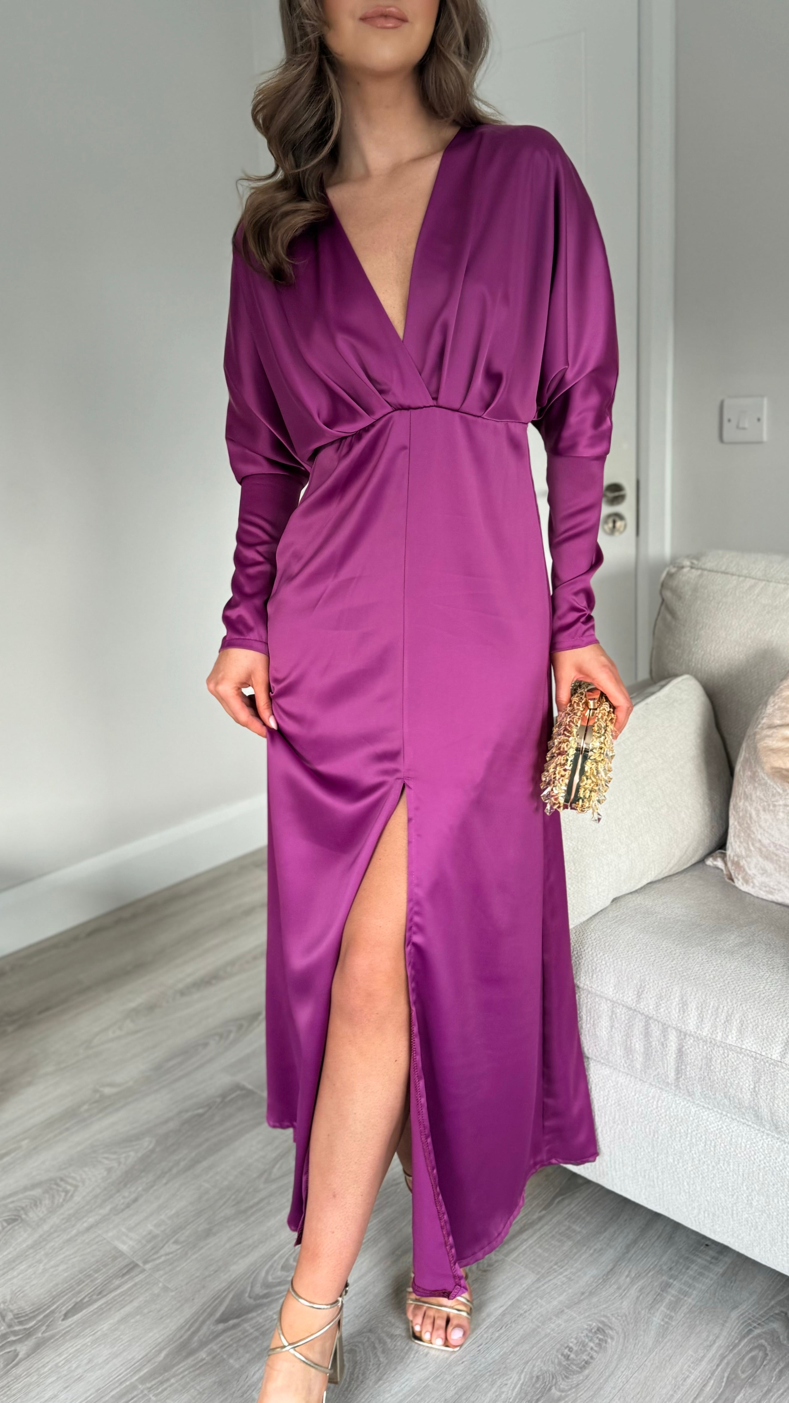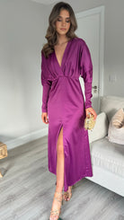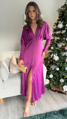 Introducing our Sienna Purple V Neck midi dress - the perfect combination of elegance and comfort. Featuring long sleeves tapered at the bottom, a flattering v neckline, and a front split for added style. The elasticated waist ensures a comfortable and flattering fit. Get ready to turn heads in this stunning dress!
