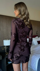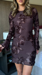 Siofra Chocolate Brown Floral Embossed Long Sleeve Mini Dress