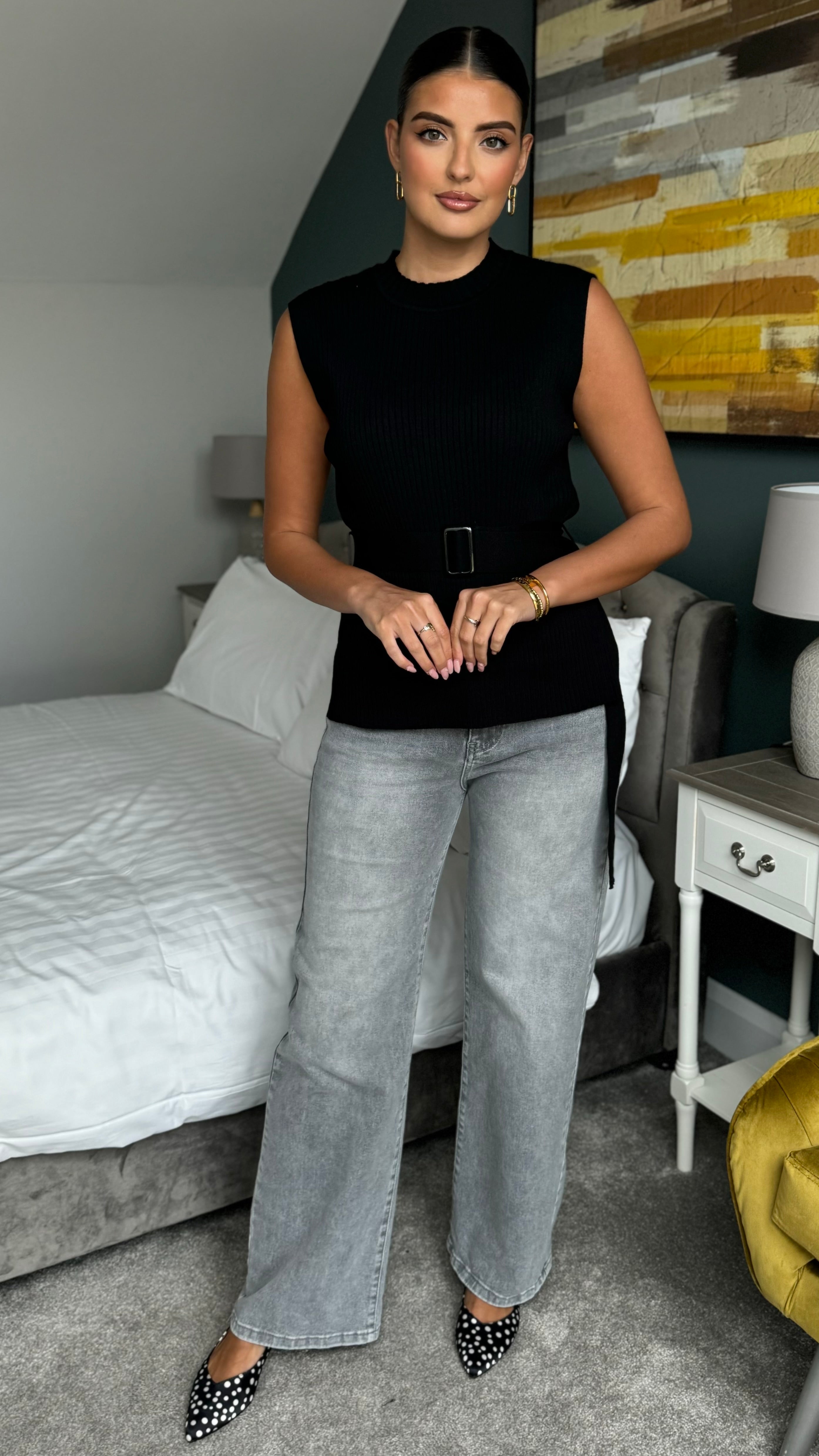 Elegant black ballet flats with a playful polka dot pattern and distinctive pointy toe silhouette. Features an open back design with a delicate tie closure at the ankle for a secure, adjustable fit. Perfect for adding a touch of refined style to everyday wear or dressier occasions. Crafted for comfort and versatility, these flats transition seamlessly from day to night.