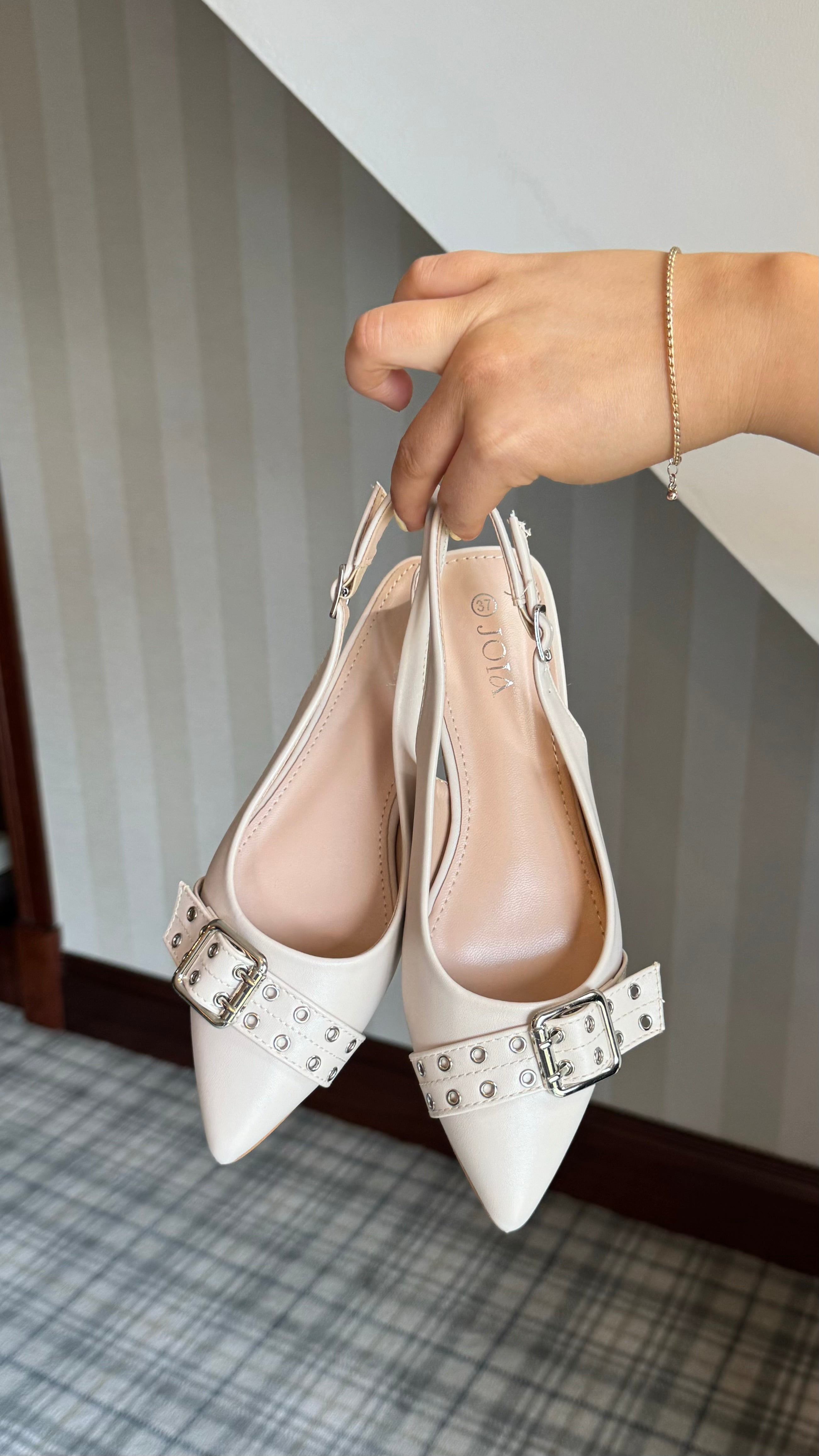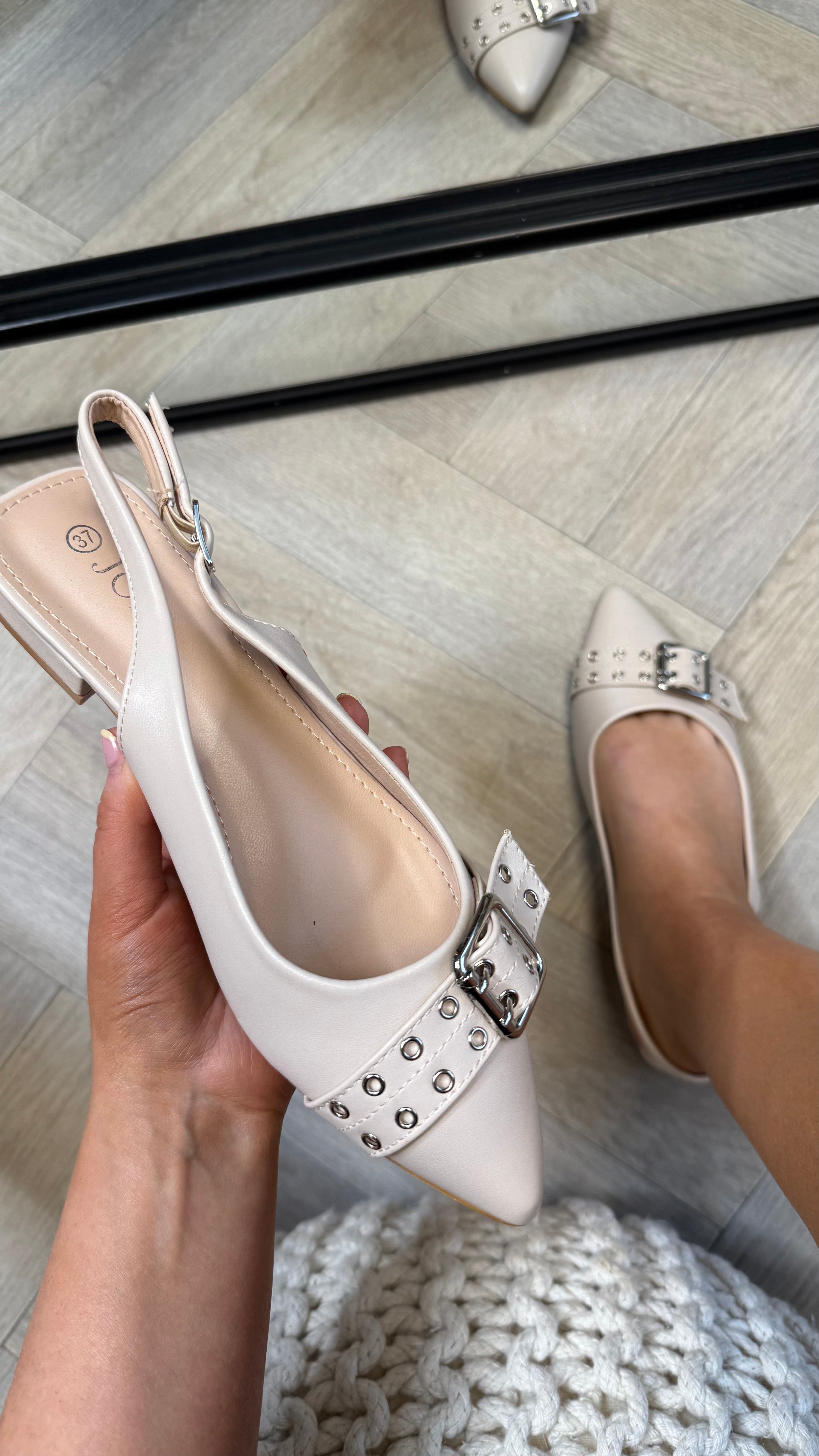 Liven up your shoe collection with our Liza Beige Slingback Shoes. These playful flats feature a buckle detail, perfect for adding a touch of class to any outfit. With a comfortable, pointed toe and slingback design, these shoes are both stylish and practical.