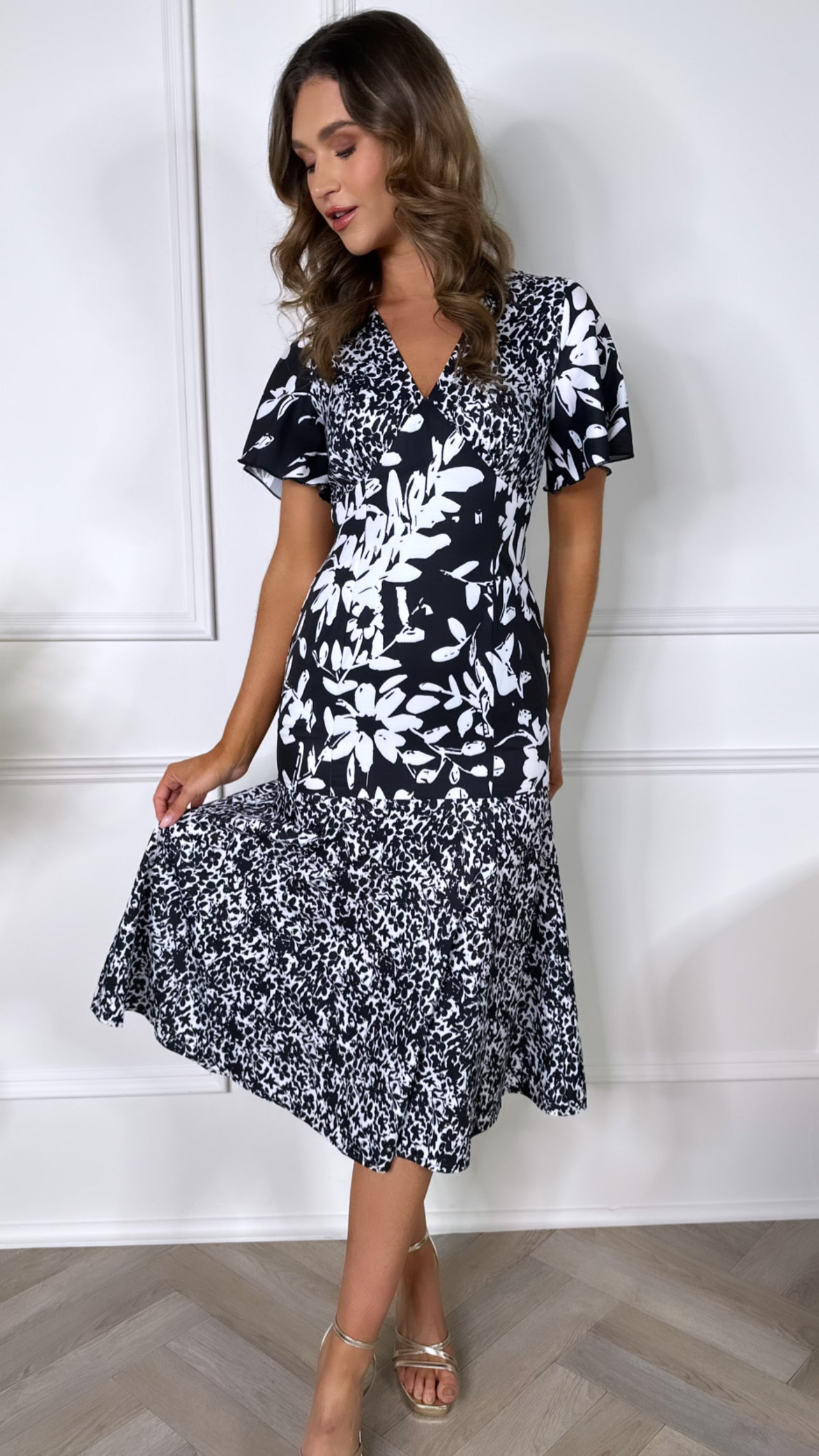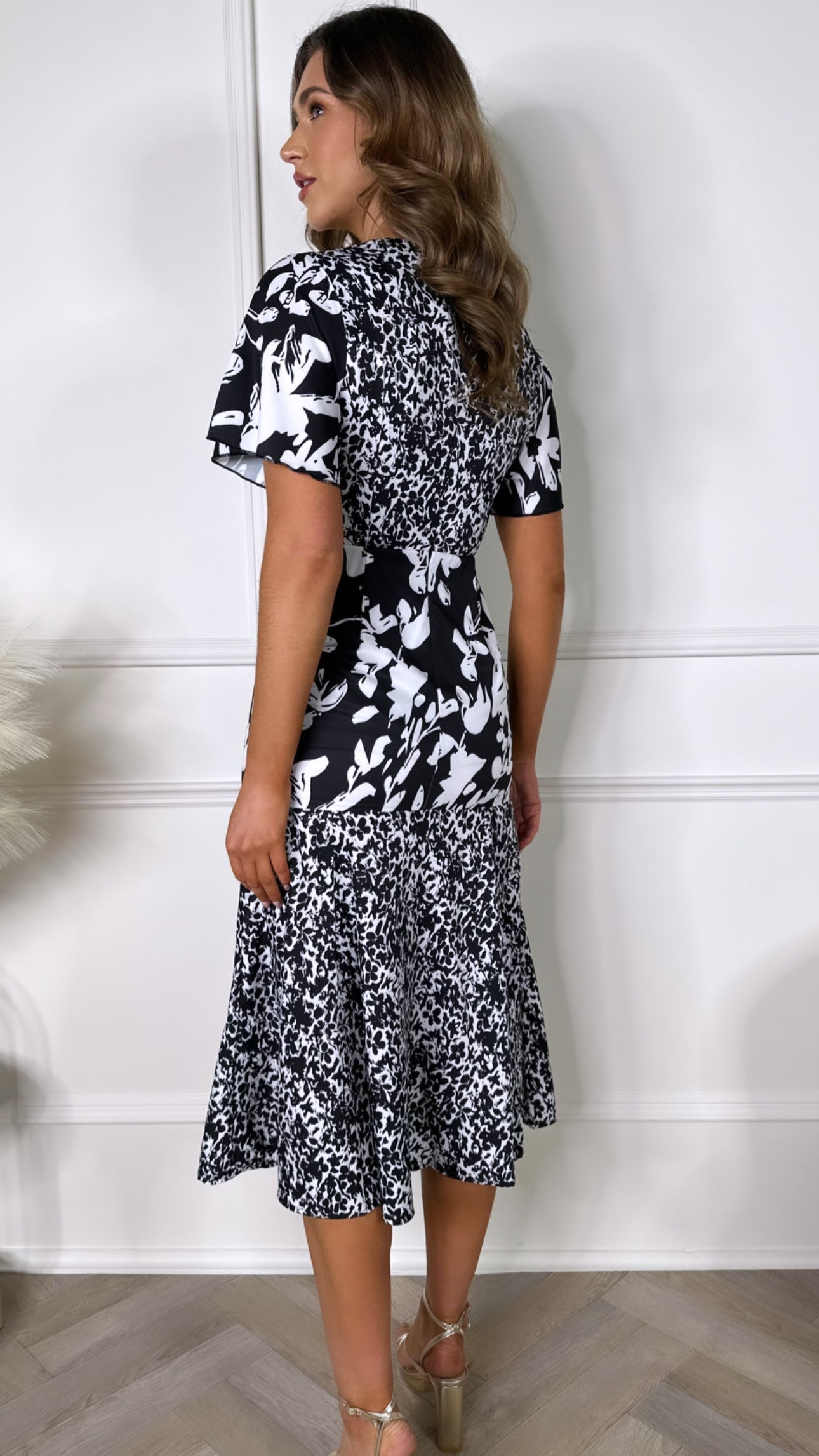 Get ready to slay in style with Frieda! Our black and white floral midi dress is the perfect choice for any occasion. With its feminine silhouette and floaty angel sleeves, you'll feel chic and confident. The tiered skirt design flatters your curves, while the premium printed fabric adds a touch of luxury. Dress to impress! 😉