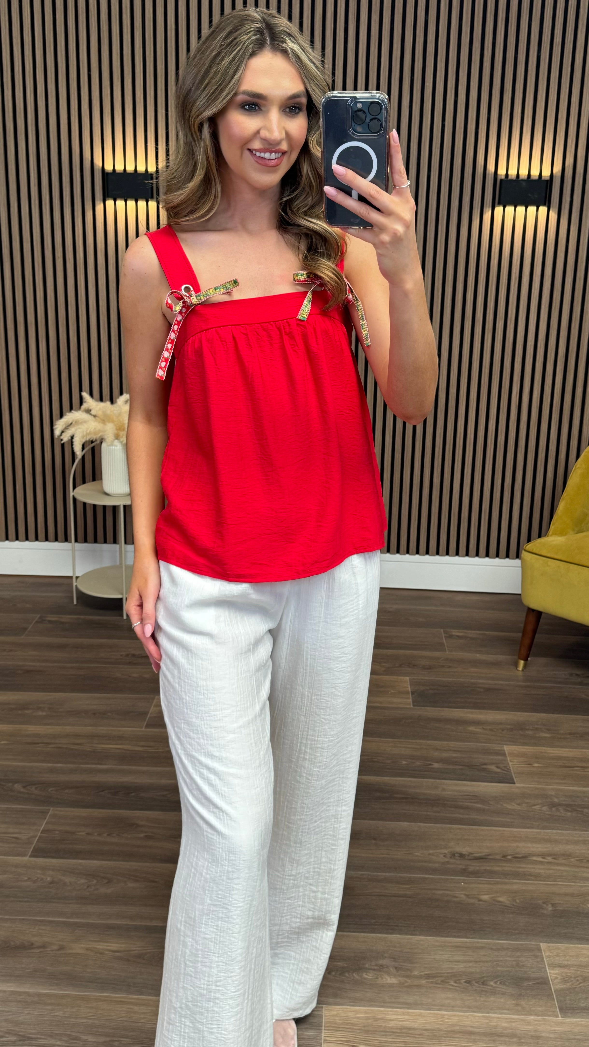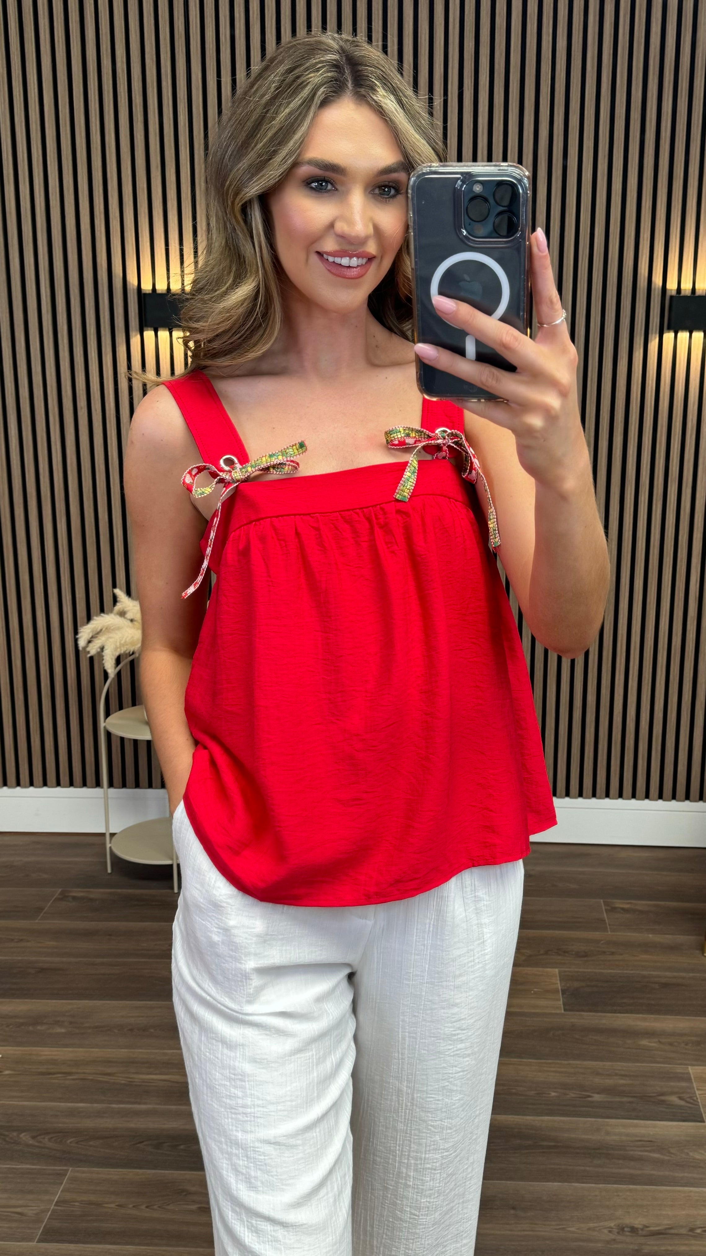 Add a splash of sweetness to your wardrobe with the Amara Red Strawberries Detail Tie Strap Top! 🍓 This top features charming strawberry accents and adjustable tie straps for a perfect fit. Light, fun, and fresh—it's your go-to for sunny days and playful vibes! ☀️💕