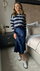 Make an impact in this stunning Yaella Navy Midi Skirt. Crafted with a sleek, blue fabric, this midi skirt adds a sophisticated edge to any look. Show off your style and confidence with this eye-catching piece! 💃🏻