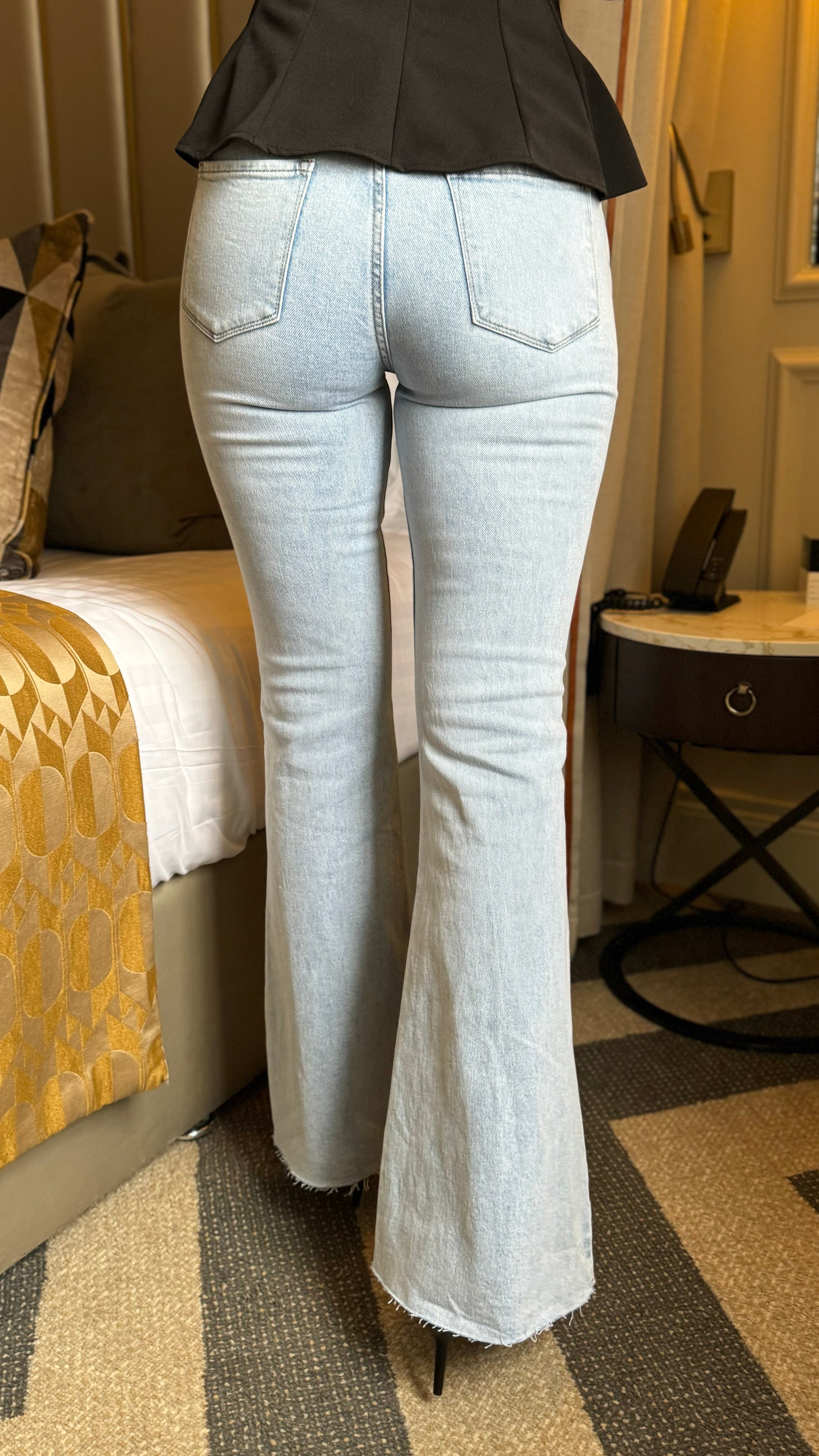 Elevate your denim game with the Nadine Light Blue Flared Raw Hem Jeans. These playful jeans feature a trendy flare cut and a unique raw hem detail for a fun and quirky look. Show off your personality with this must-have addition to any fashionista's wardrobe.