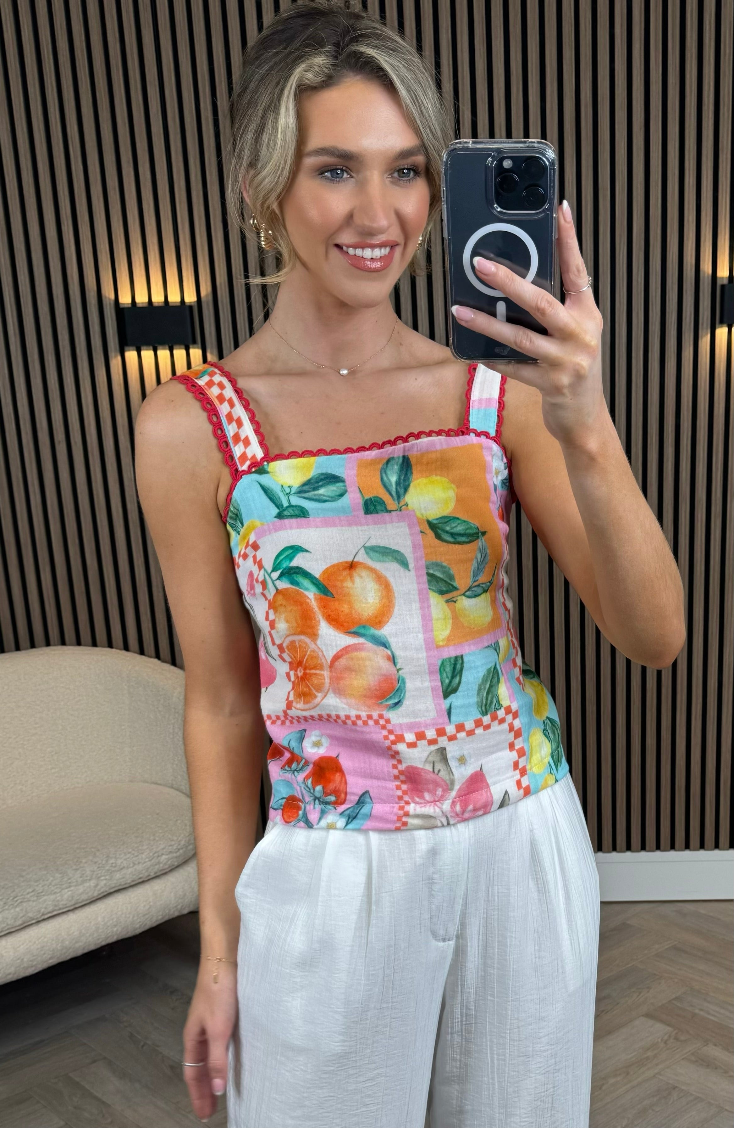 Add some 🌈 to your wardrobe with the Solene Multicoloured Fruits Printed Top! The elasticated back allows for a comfortable, perfect fit, making this top a great addition to any outfit. 🍓🍍 Wear it for a fun and colorful look!