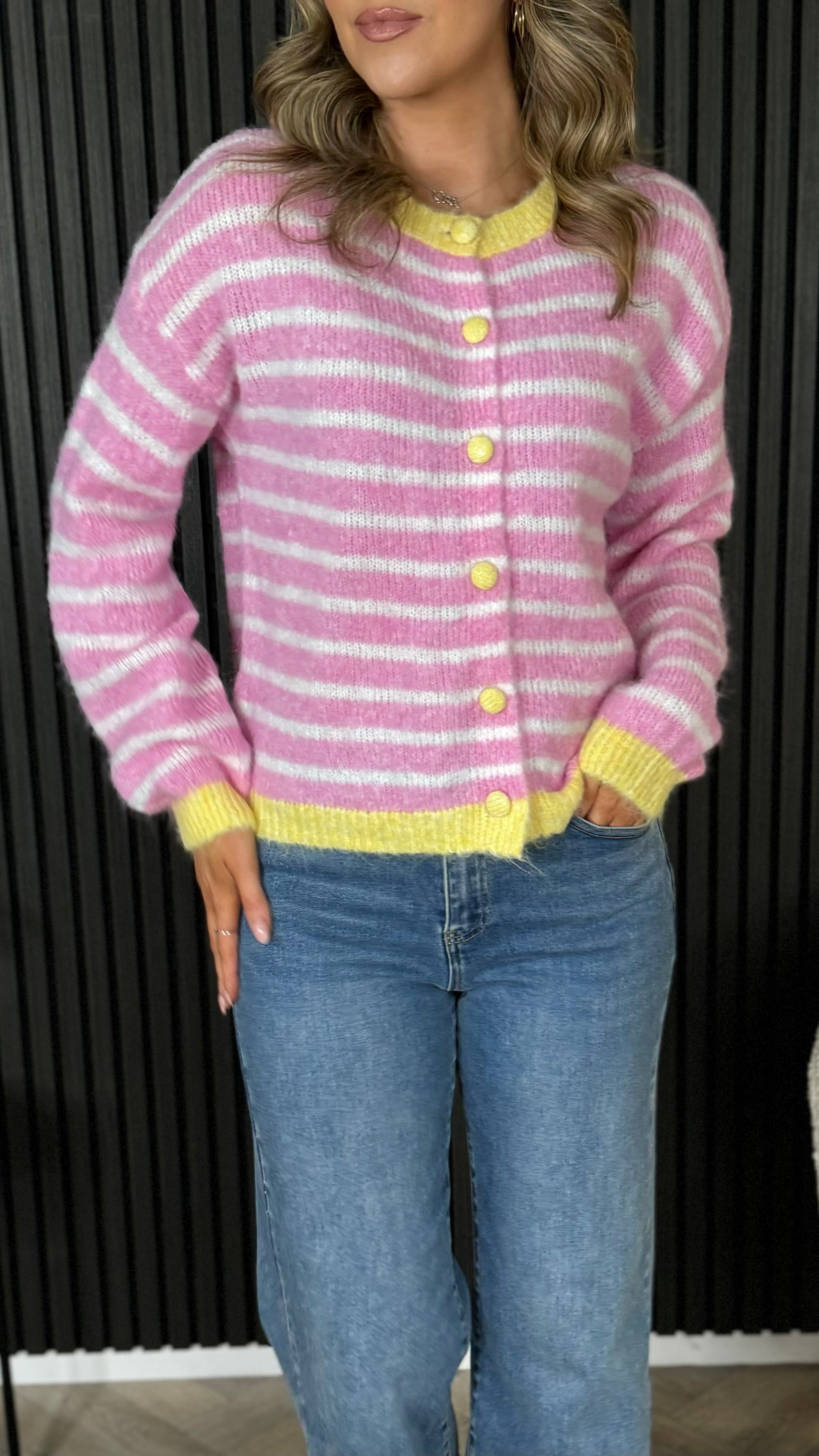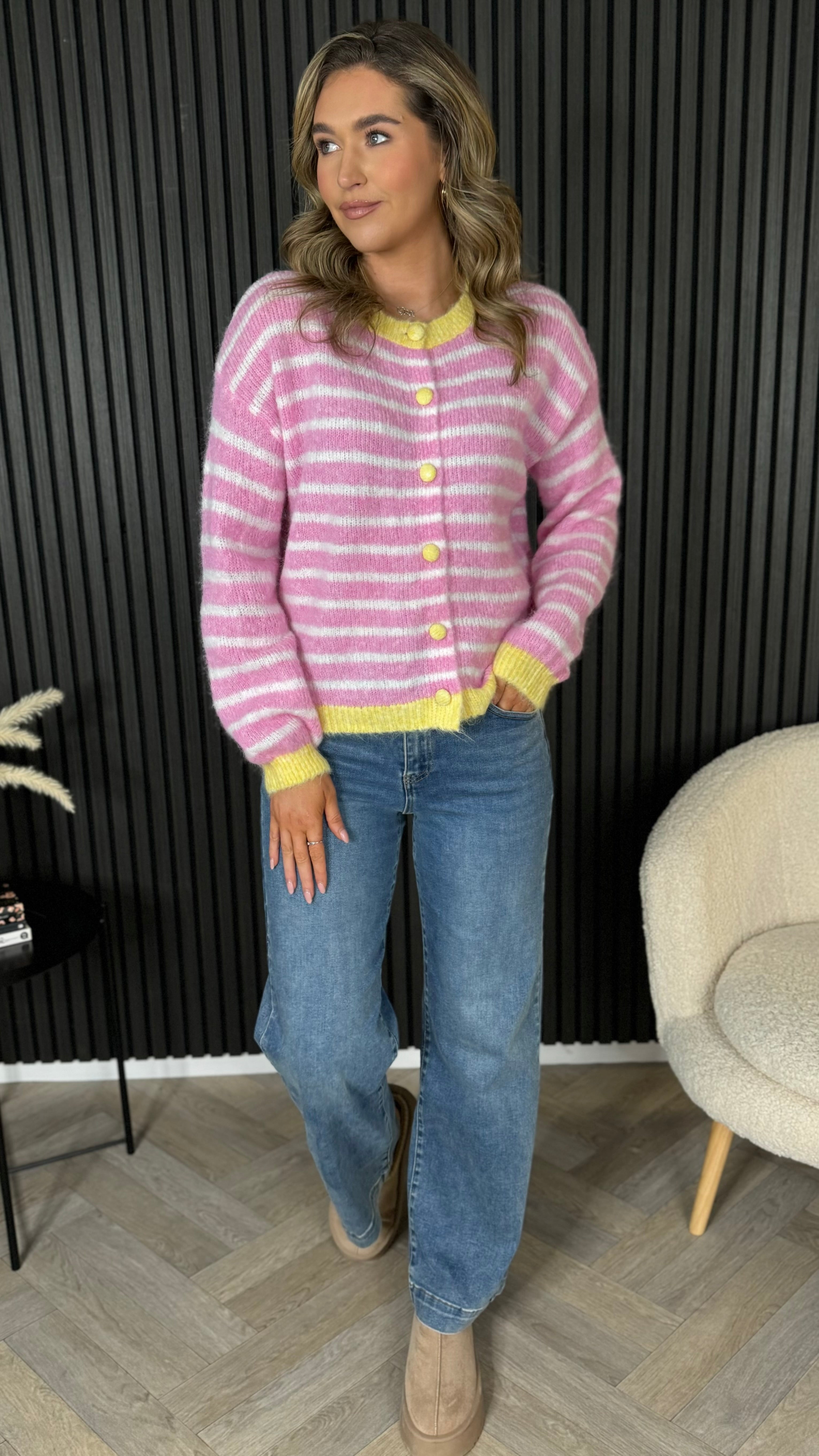 Wrap yourself in comfort with the Kaylee Pink & Yellow Stripe Cardigan—a playful layer that brings warmth and style together. Featuring soft, cosy fabric that feels like a gentle hug, this cardigan boasts self-covered buttons for a polished finish. The cheerful yellow contrast detailing on the neck and cuffs adds a pop of personality to the classic pink and yellow stripes. Perfect for those moments when you want to feel snug without sacrificing style.