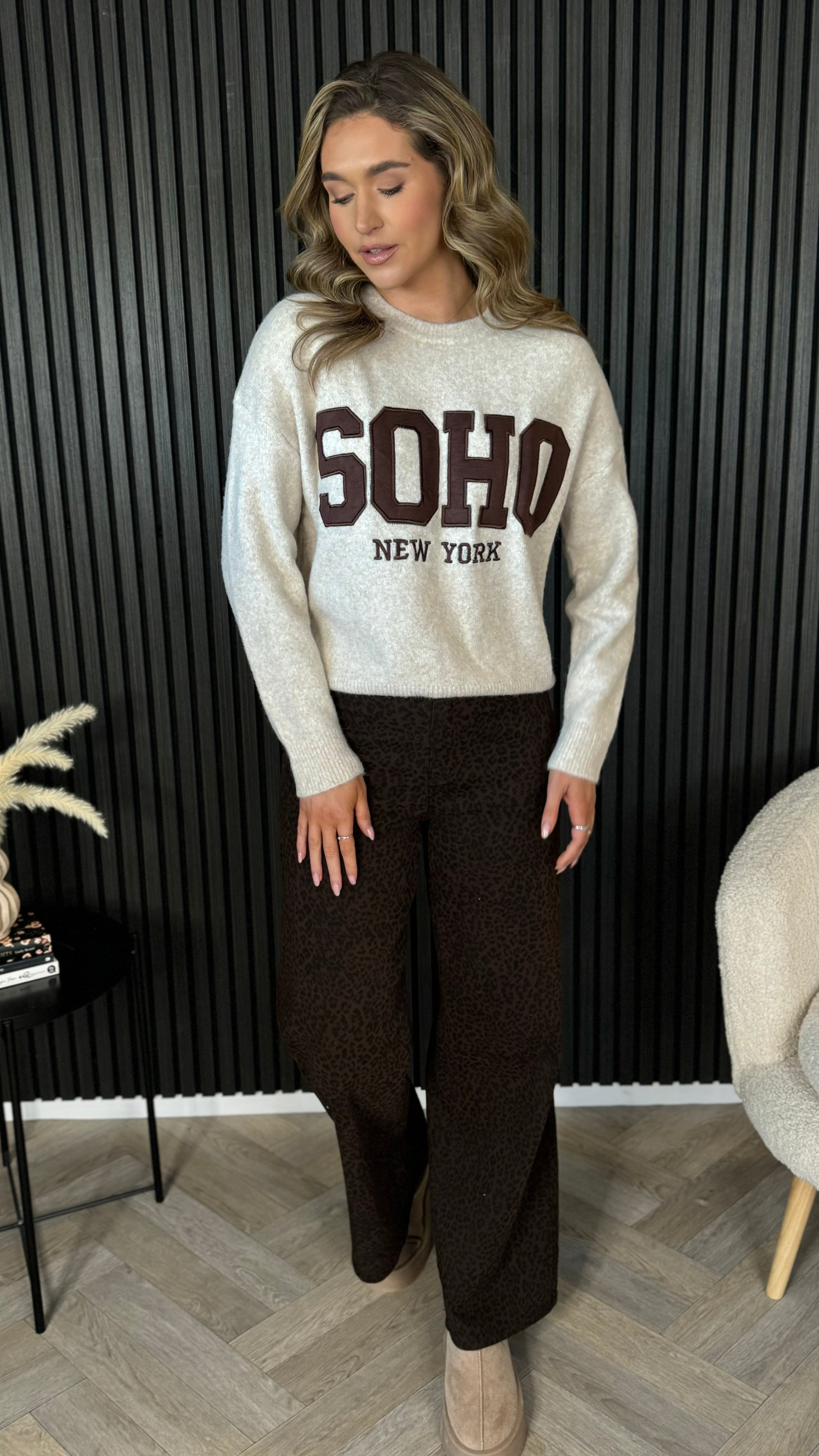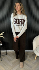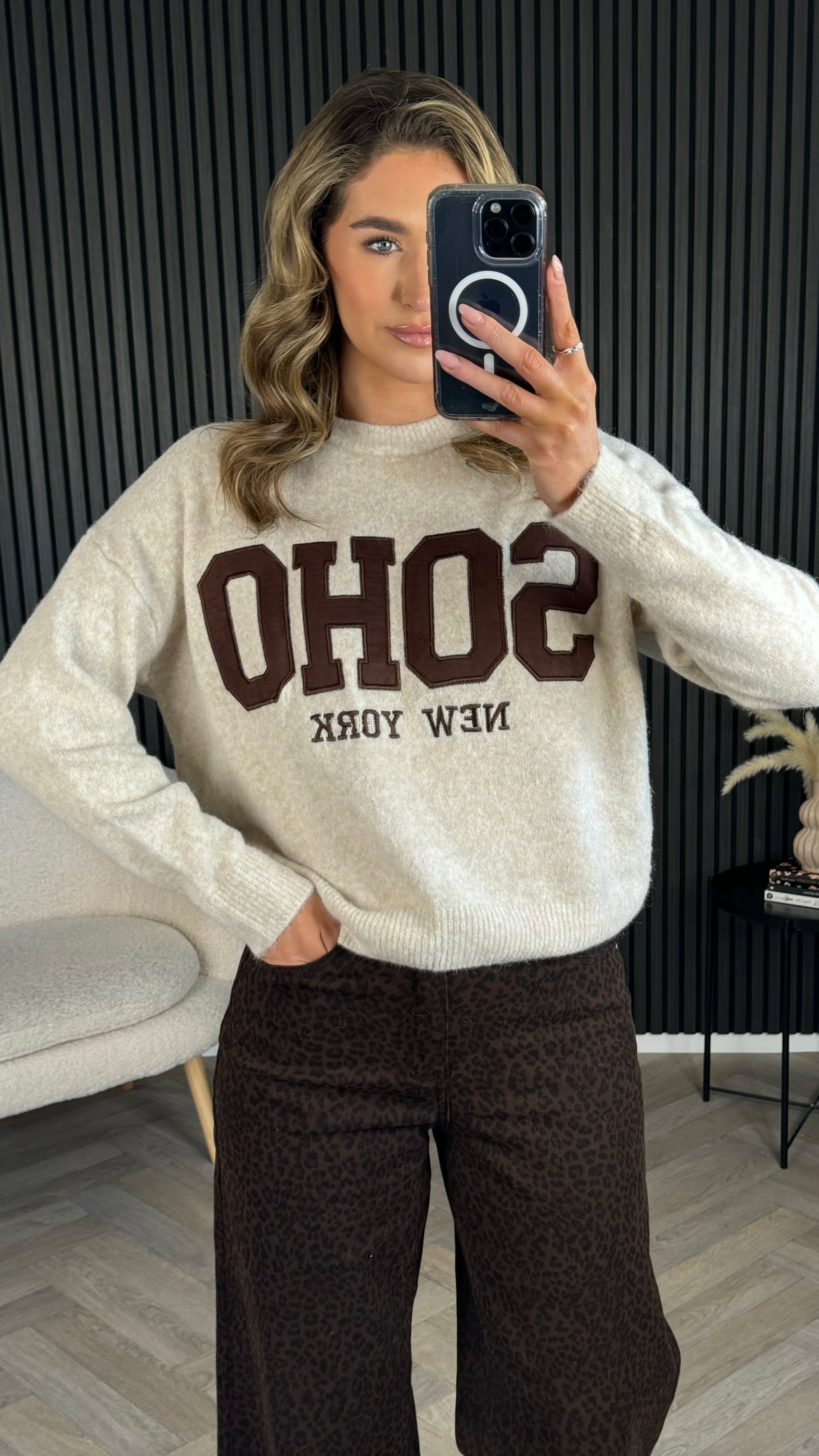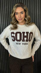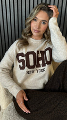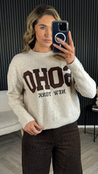 Introducing the Lauryn Beige 'Soho' Crew Neck Jumper – your new go-to for effortless style and comfort. Featuring eye-catching slogan embroidery on the front, this cosy knit boasts a classic crew neckline paired with ribbed cuffs and hem for a polished finish. Crafted from soft, snuggly fabric, it's the perfect layer for those days when you want to look put-together without sacrificing comfort. Whether you're heading out or staying in, this jumper delivers both personality and warmth in one chic package.