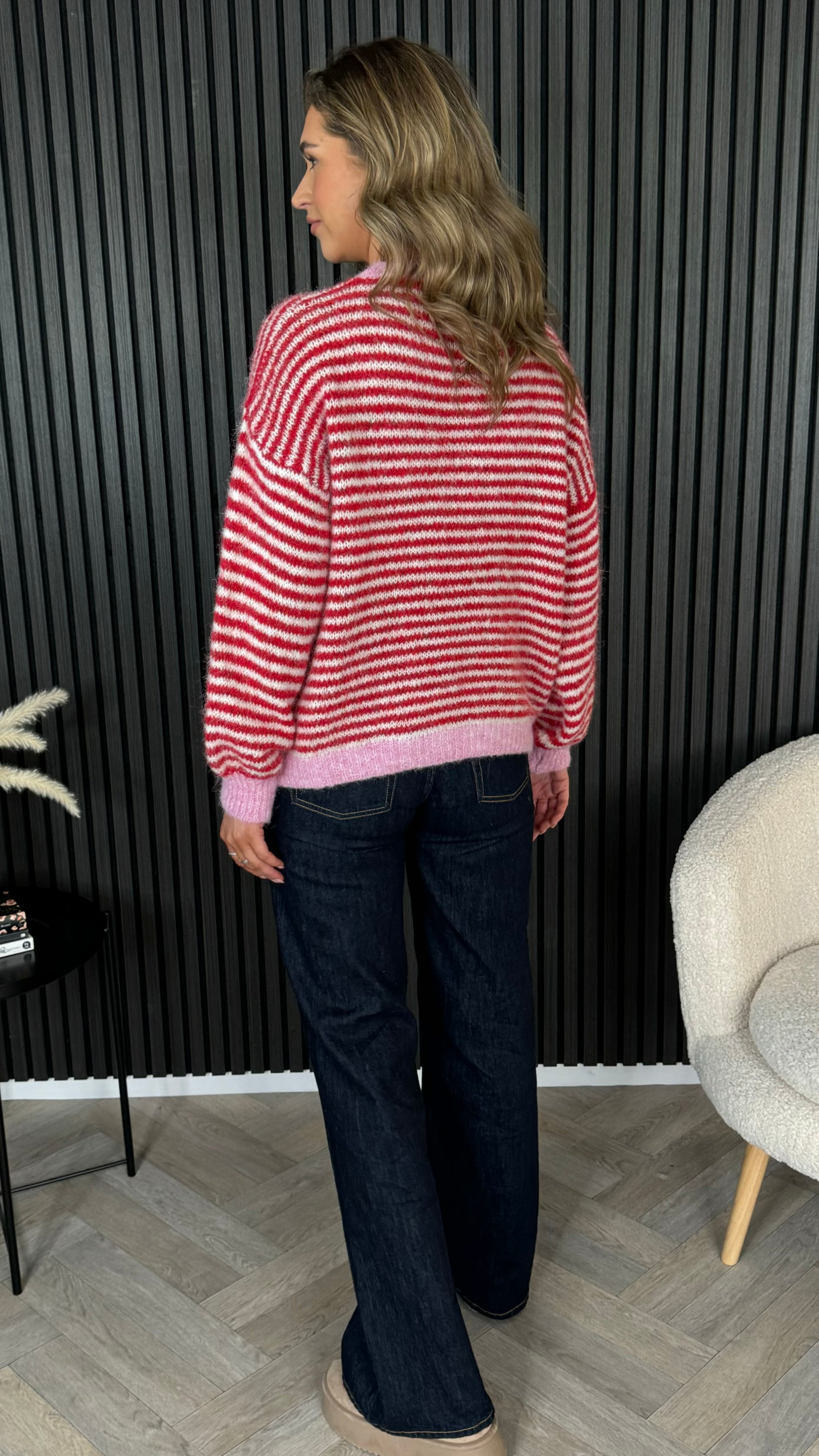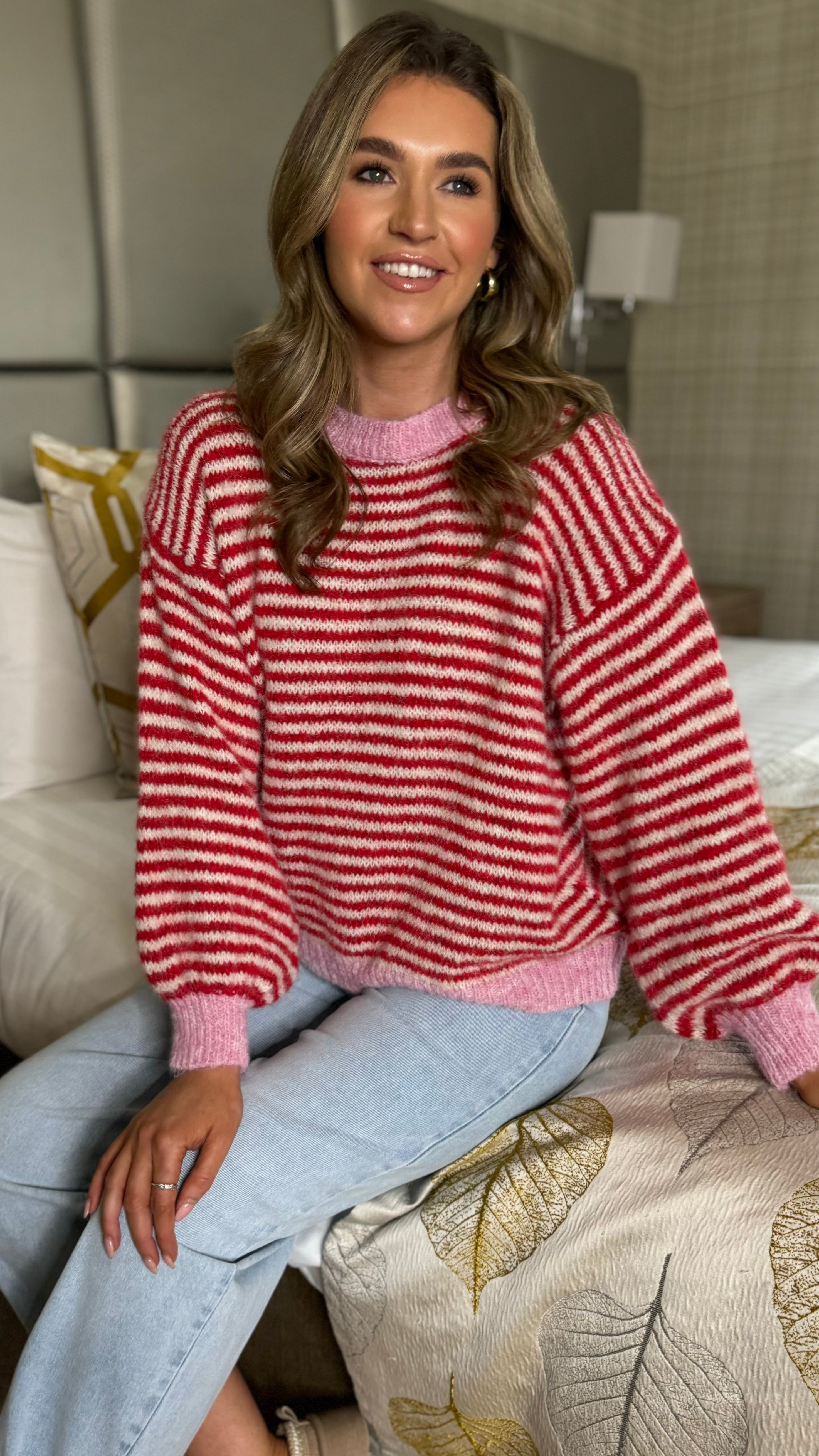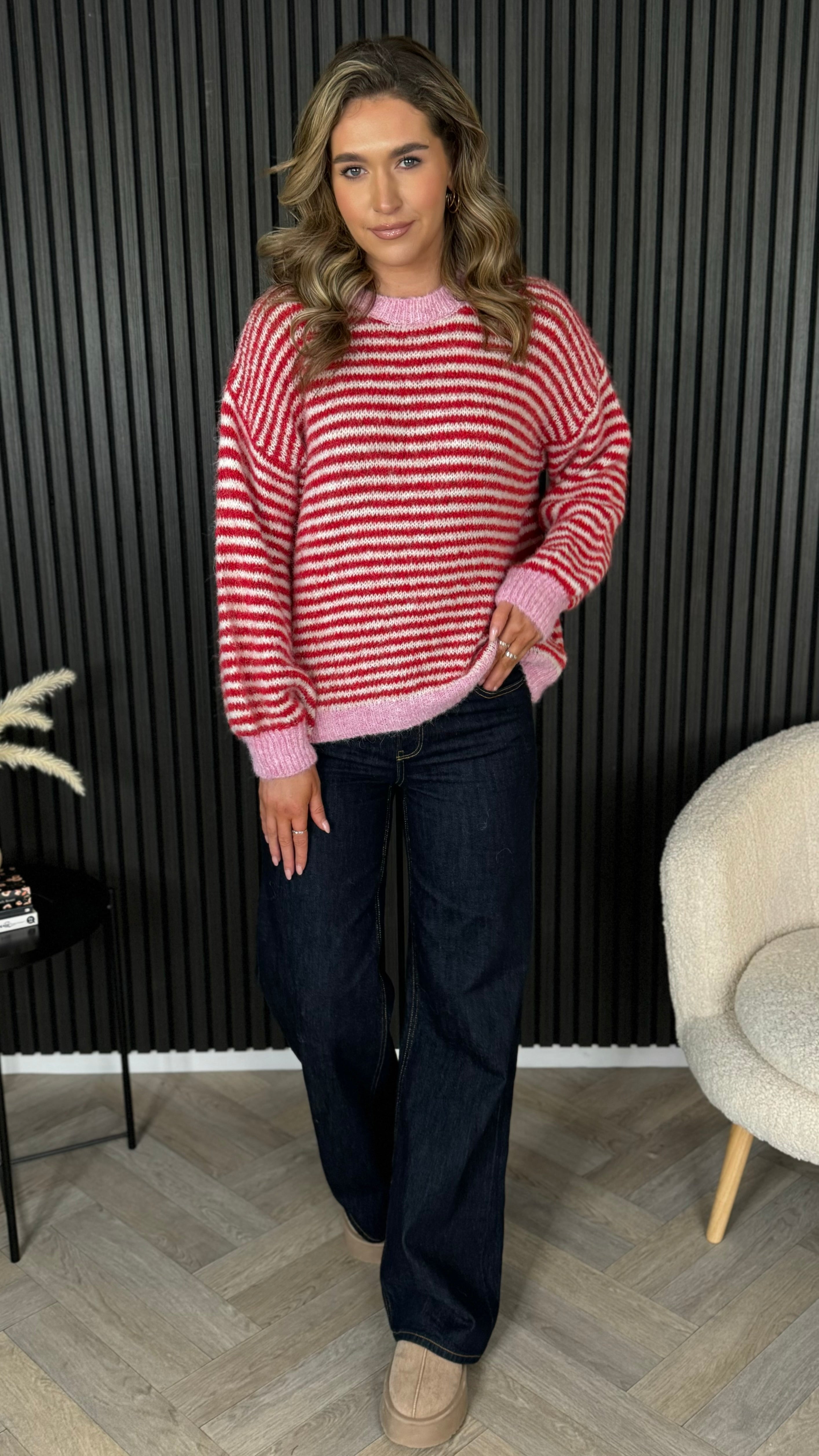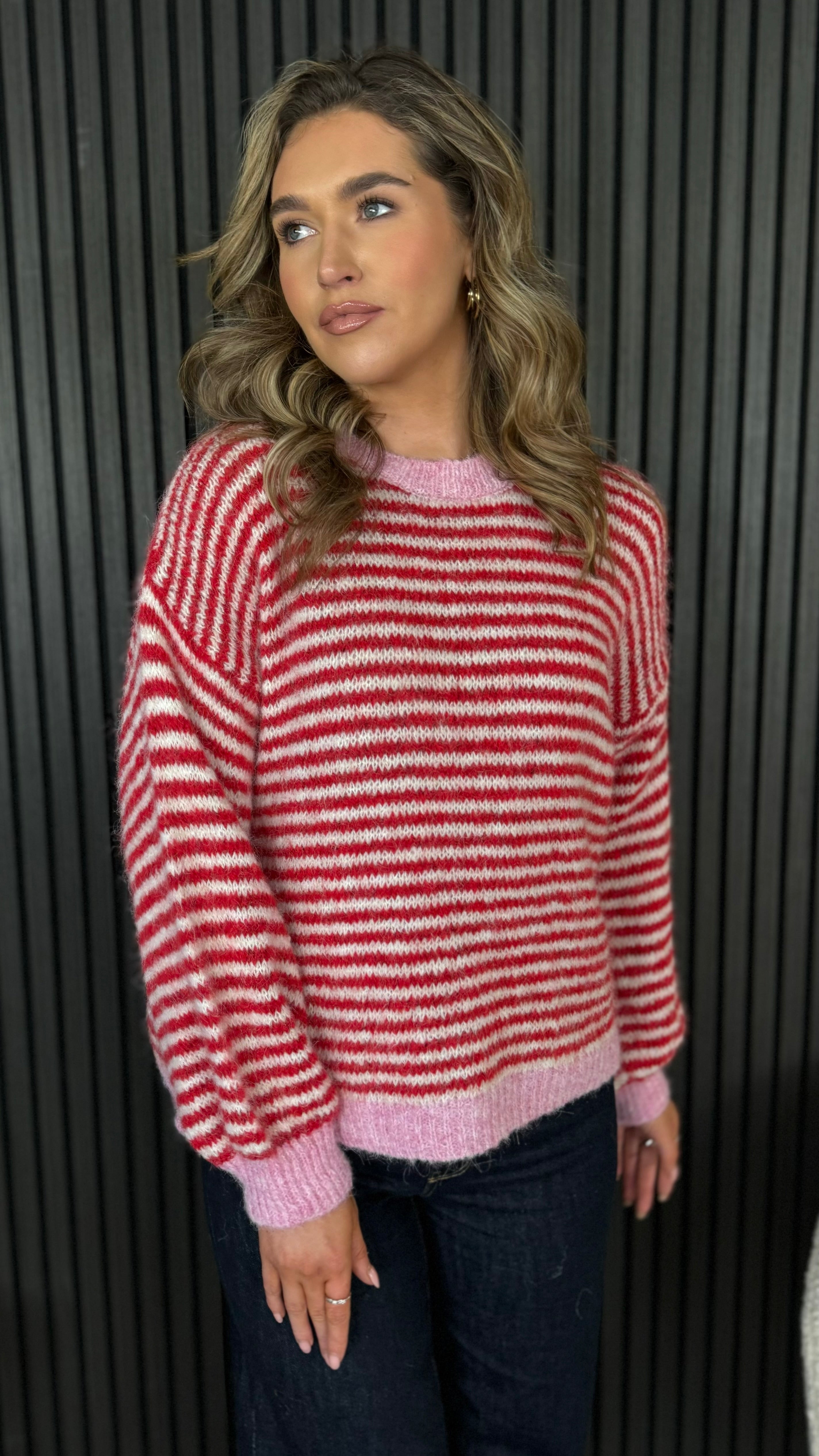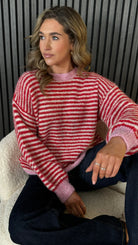 Cosy up in this oversized striped jumper that's equal parts comfort and charm. Featuring bold red and pink stripes, a relaxed round neckline, and ribbed cuffs and hem for that perfectly polished finish, it's your new go-to for effortless style. Layer it, dress it down, or wear it solo—this playful piece works harder than it looks.