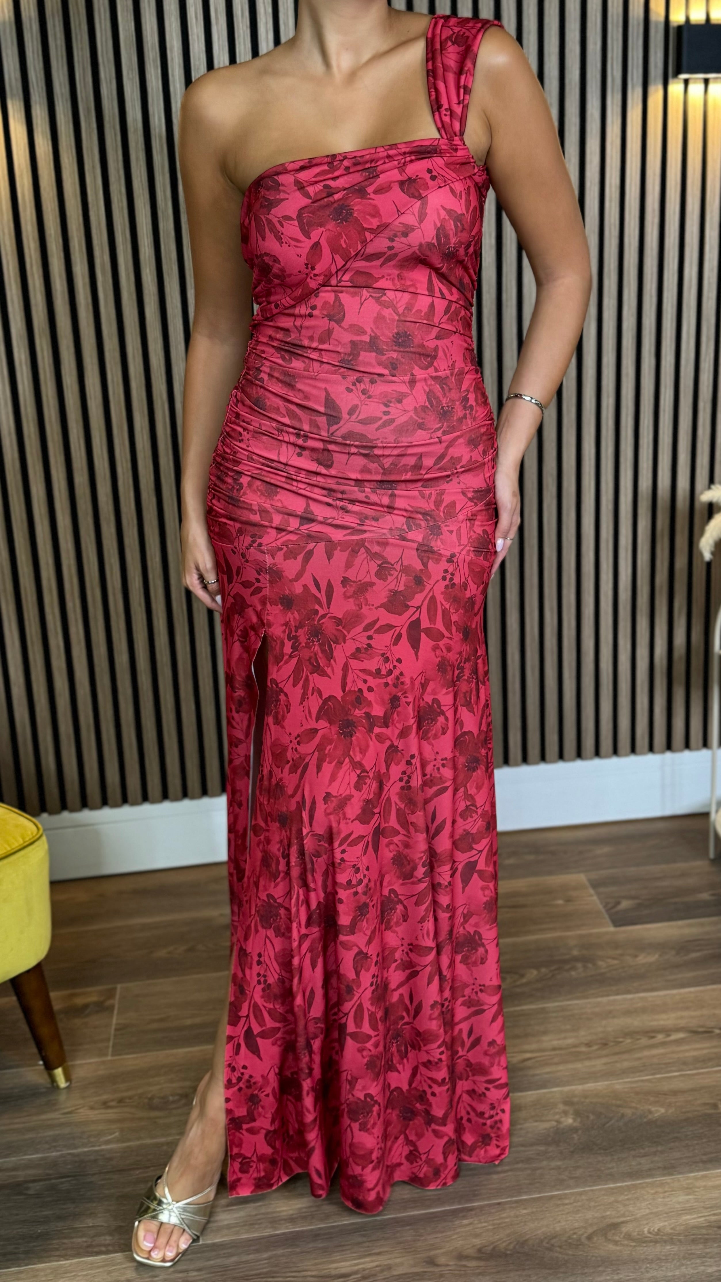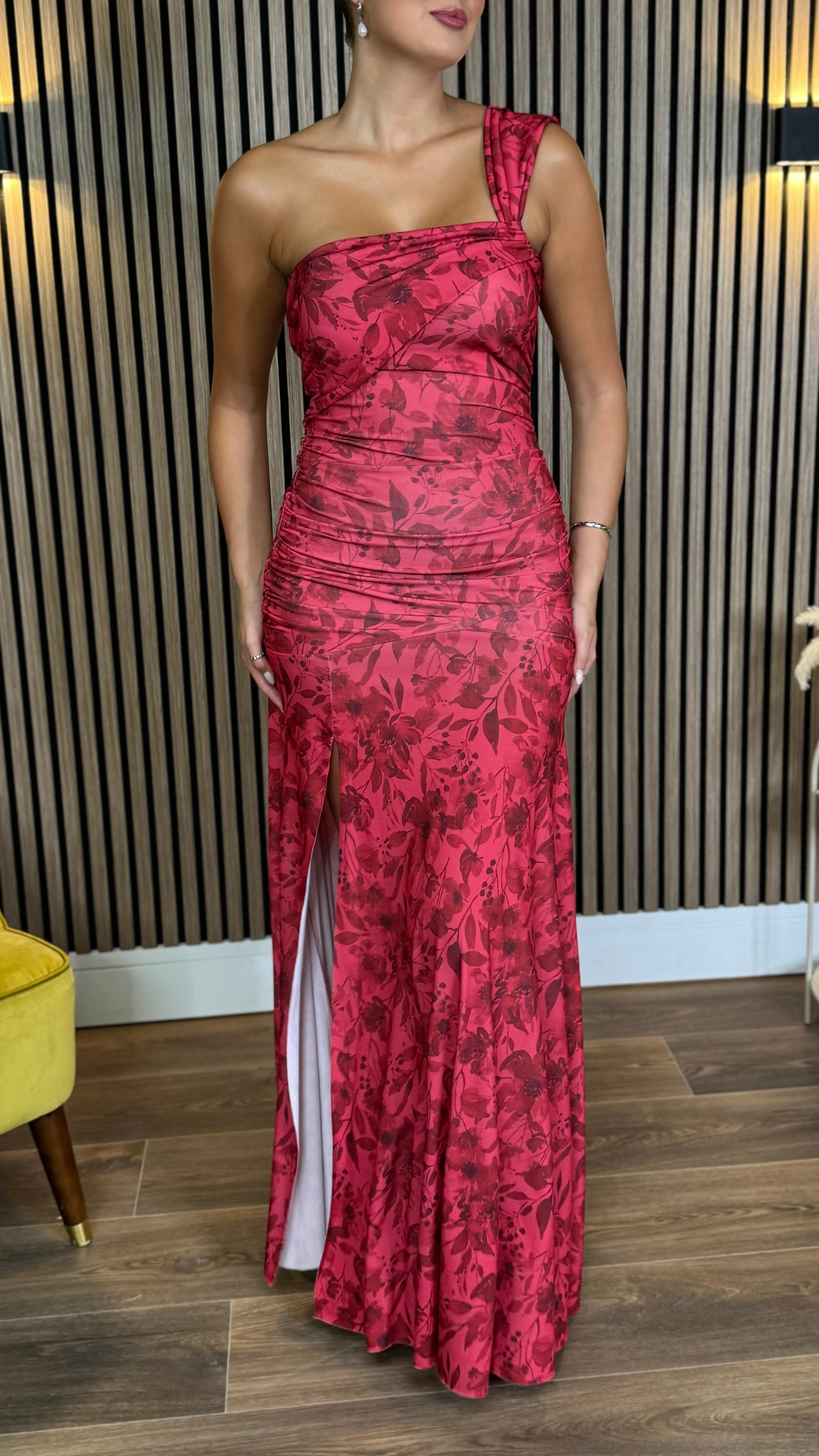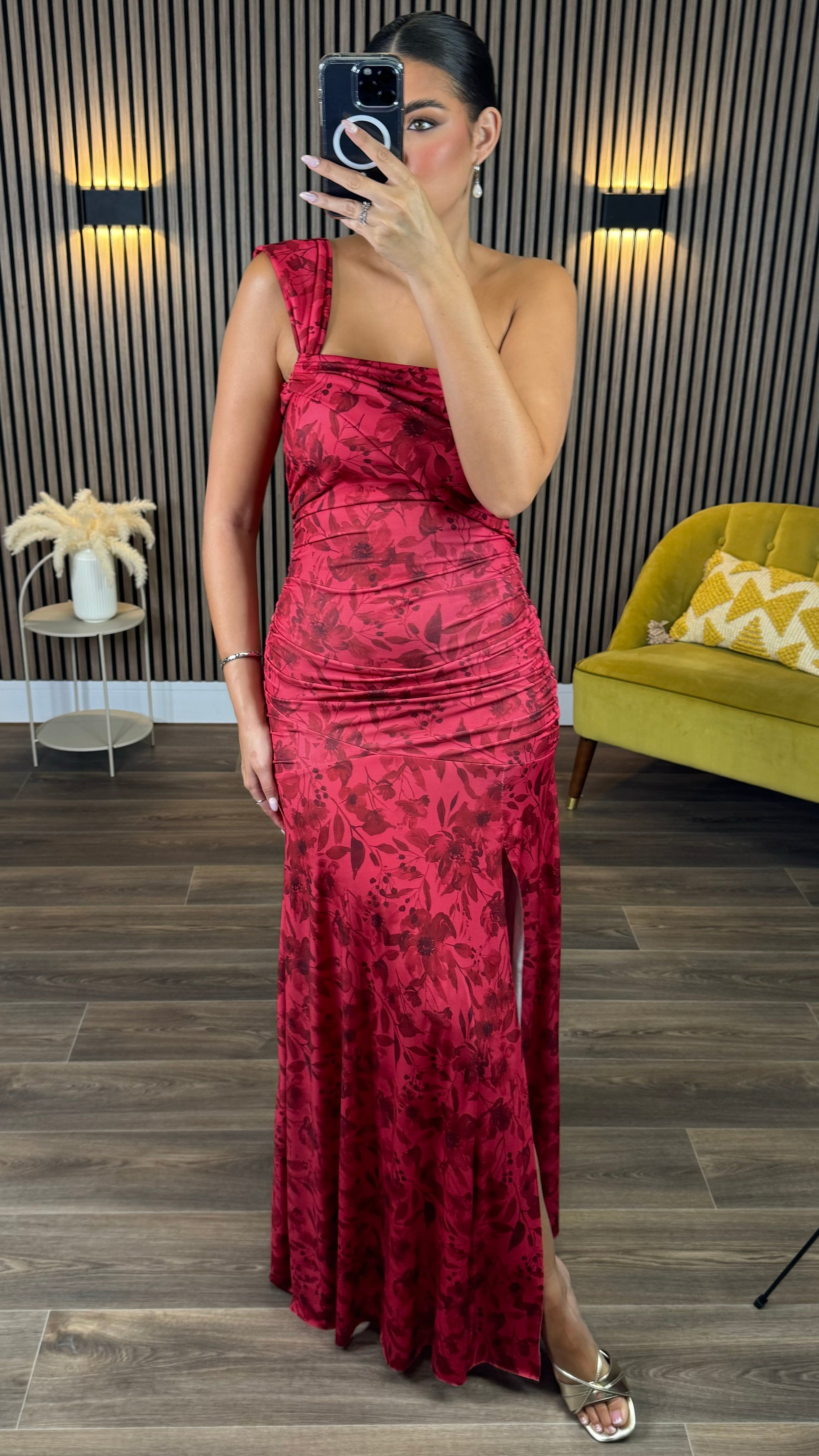 Janice Red Floral One Shoulder Cupped Ruched Slit Detail Maxi Dress